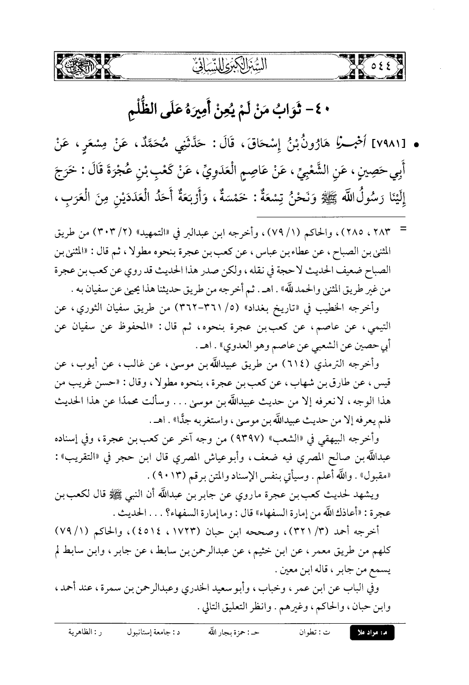 7981- أَخبَرنا هَارُونُ بنُ إِسحَاقَ، قَالَ: حَدَّثنِي مُحَمدٌ، عَن مِسْعَرٌ، عَن أَبي حَصِينٍ، عَنِ الشَّعْبِيِّ، عَنْ عَاصِمٍ العَدَوِيِّ، عَن كَعْبِ بنِ عُجْرَةَ، قَالَ: خَرَجَ إِلَيْنَا رَسُولُ اللهِ صَلى الله عَلَيهِ وسَلم وَنَحْنُ تِسْعَةٌ؛ خَمْسَةٌ وَأَرْبَعَةٌ، أَحَدُ العَدَدَيْنِ مِنَ العَرَبِ، وَالآخَرُ مِنَ العَجَمِ، فَقَالَ: اسْمَعُوا هَلْ سَمِعْتُمْ أَنَّهُ سَيَكُونُ بَعْدِي أُمَرَاءُ مَنْ دَخَلَ عَلَيْهِمْ وَصَدَّقَهُمْ بِكَذِبِهِمْ، وَأَعَانَهُمْ عَلَى ظُلْمِهِمْ، فَلَيْسَ مِنِّي، وَلَسْتُ مِنْهُ، وَلَيْسَ بِوَارِدٍ عَلَيَّ الحَوْضَ، وَمَنْ لَمْ يَدْخُلْ عَلَيْهِمْ، وَلَمْ يُصَدِّقْهُمْ بِكَذِبِهِمْ، وَلَمْ يُعِنْهُمْ عَلَى ظُلْمِهِمْ، فَهُوَ مِنِّي، وَأَنَا مِنْهُ، وَسَيَرِدُ عَلَيَّ الحَوْضَ.