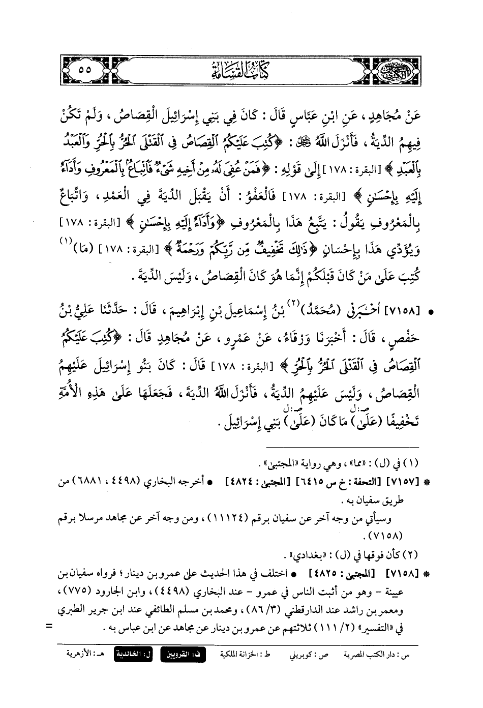 7158- أَخبَرني مُحَمدُ بنُ إِسمَاعِيلَ بنِ إِبرَاهِيمَ، قَالَ: حَدثنا عَليُّ بنُ حَفْصٍ، قَالَ: أَخبَرنا وَرْقَاءُ، عَن عَمْرٍو، عَن مُجَاهِدٍ، قَالَ: {كُتِبَ عَلَيْكُمُ القِصَاصُ فِي القَتْلَى الحَرُّ بِالحُرِّ}، قَالَ: كَانَ بَنُو إِسرَائِيلَ عَلَيْهِمُ القِصَاصُ، وَلَيْسَ عَلَيْهِمُ الدِّيَةُ، فَأَنْزَلَ اللهُ الدِّيَةَ، فَجَعَلَهَا عَلَى هَذِهِ الأُمَّةِ تَخْفِيفًا عَلَى مَا كَانَ عَلَى بَنِي إِسرَائِيلَ.