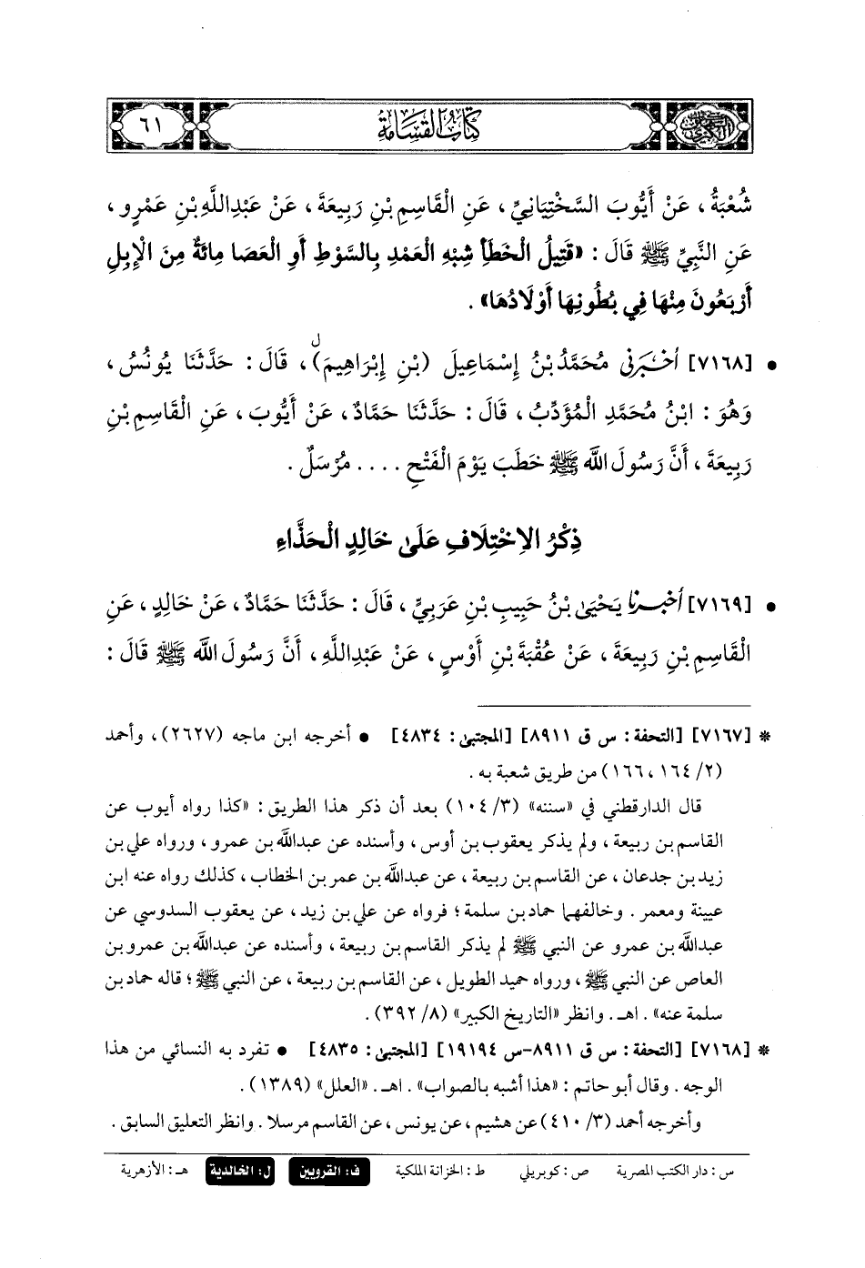 7169- أَخبَرنا يَحيَى بنُ حَبِيبِ بنِ عَرَبِيٍّ، قَالَ: حَدثنا حَمَّادٌ، عَن خَالِدٍ، عَنِ القَاسِمِ بنِ رَبِيعَةَ، عَن عُقْبَةَ بنِ أَوْسٍ، عَن عَبدِ اللهِ، أَنَّ رَسُولَ اللهِ صَلى الله عَلَيهِ وسَلم قَالَ: أَلا وَإِنَّ قَتِيلَ الخَطَأِ شِبْهِ العَمْدِ مَا كَانَ بِالسَّوْطِ، وَالعَصَا مِئَةٌ مِنَ الإِبِلِ، مِنْهَا أَرْبَعُونَ فِي بُطُونِهَا أَوْلادُهَا.
