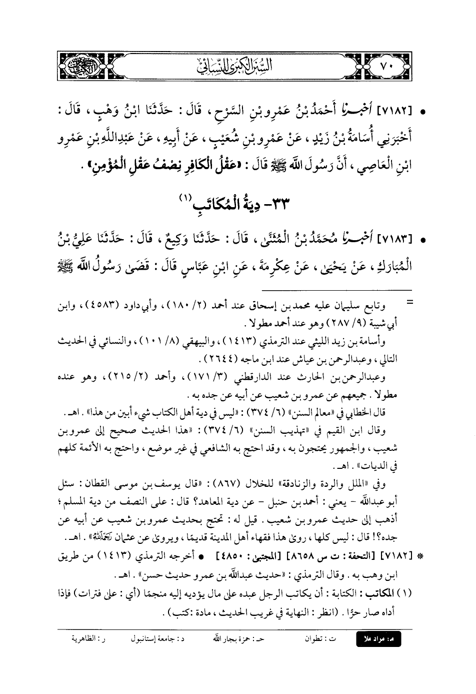 7182- أَخبَرنا أَحْمَدُ بنُ عَمْرِو بنِ السَّرْحِ، قَالَ: حَدَّثنا ابْنُ وَهْبٍ، قَالَ: أَخْبَرَنِي أُسَامَةُ بنُ زَيْدٍ، عَن عَمْرِو بنِ شُعَيْبٍ، عَن أَبيهِ، عَن عَبدِ اللهِ بنِ عَمْرِو بنِ العَاصِ، أَنَّ رَسُولَ اللهِ صَلى الله عَلَيهِ وسَلم قَالَ: عَقْلُ الكَافِرِ نِصْفُ عَقْلِ المُؤْمِنِ.