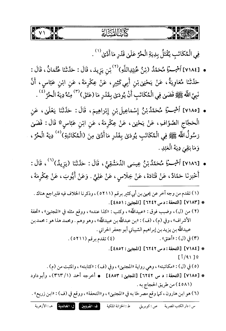 7186- أَخبَرنا مُحَمدُ بنُ عِيسَى الدِّمَشْقِيُّ، قَالَ: حَدَّثنا يَزِيدُ، قَالَ: أَخبَرنا حَمَّادٌ، عَن قَتَادَةَ، عَن خِلاسٍ، عَن عَليٍّ. وَعَن أَيوبَ، عَن عِكْرِمَةَ، عَنِ ابْنِ عَبَّاسٍ، عَنِ النَّبيِّ صَلى الله عَلَيهِ وسَلم، قَالَ: المُكَاتَبُ يُعْتَقُ مِنْهُ بِقَدْرِ مَا أَدَّى، وَيُقَامُ عَلَيْهِ الحَدُّ بِقَدْرِ مَا أُعِتِقَ مِنْهُ، وَيَرِثُ بِقَدْرِ مَا عَتَقَ مِنْهُ.