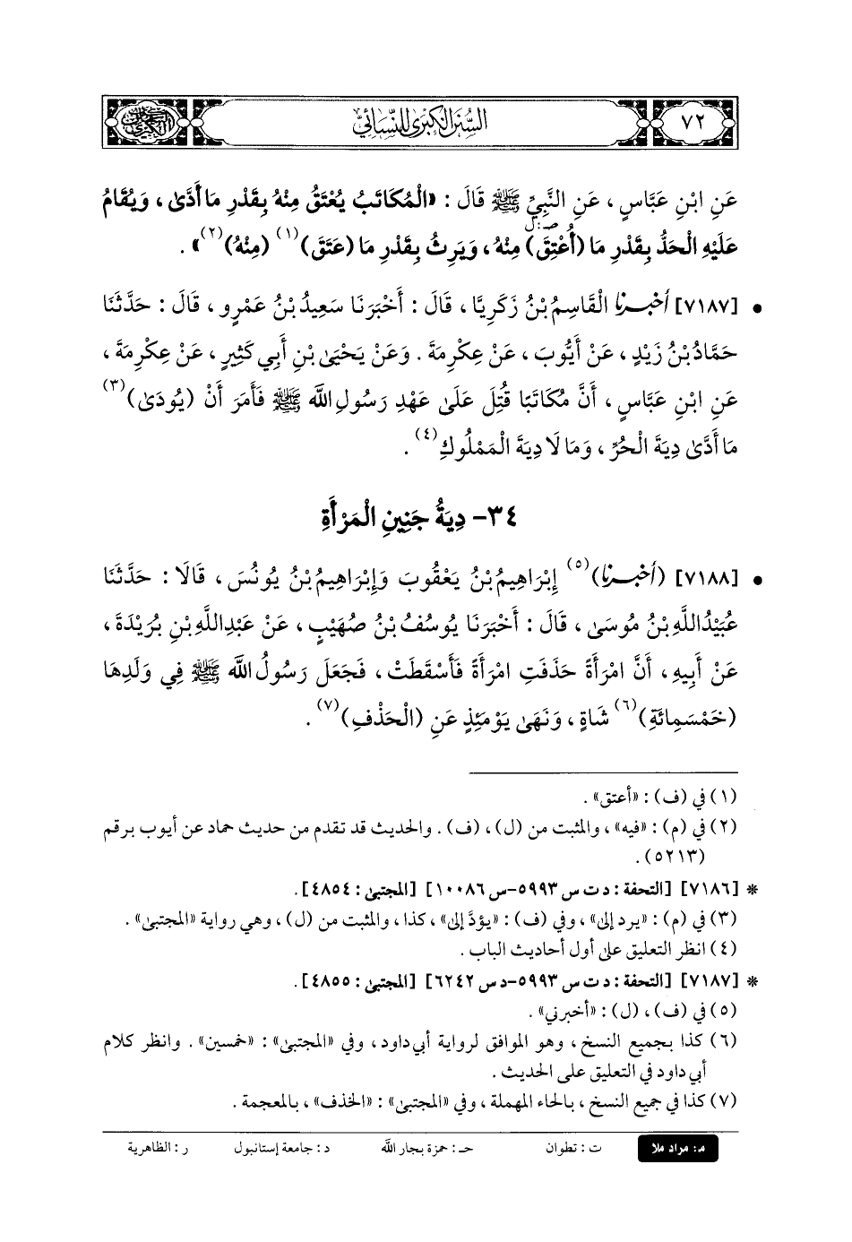 7187- أَخبَرنا القَاسِمُ بنُ زَكَرِيَّا، قَالَ: أَخبَرنا سَعِيدُ بنُ عَمْرٍو، قَالَ: حَدَّثنا حَمَّادُ بنُ زَيْدٍ، عَن أَيوبَ، عَن عِكْرِمَةَ. وَعَن يَحْيَى بنِ أَبي كَثِيرٍ، عَن عِكْرِمَةَ، عَنِ ابْنِ عَبَّاسٍ، أَنَّ مُكَاتَبًا قُتِلَ عَلَى عَهْدِ رَسُولِ اللهِ صَلى الله عَلَيهِ وسَلم: فَأَمَرَ أَنْ يُودَى مَا أَدَّى دِيَةَ الحُرِّ، وَمَا لا دِيَةَ المَمْلُوكِ.