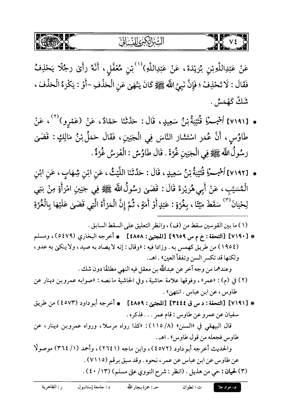 7191- أَخبَرنا قُتَيبَةُ بنُ سَعِيدٍ، قَالَ: حَدَّثنا حَمَّادٌ، عَن عَمْرٍو، عَن طَاوُوسٍ، أَنَّ عُمَرَ اسْتَشَارَ النَّاسَ فِي الجَنِينِ، فَقَالَ حَمَلُ بنُ مَالِكً: قَضَى رَسُولُ اللهِ صَلى الله عَلَيهِ وسَلم فِي الجَنِينِ غُرَّةً، قَالَ طَاوُوسٌ: الفَرَسُ غُرَّةٌ.