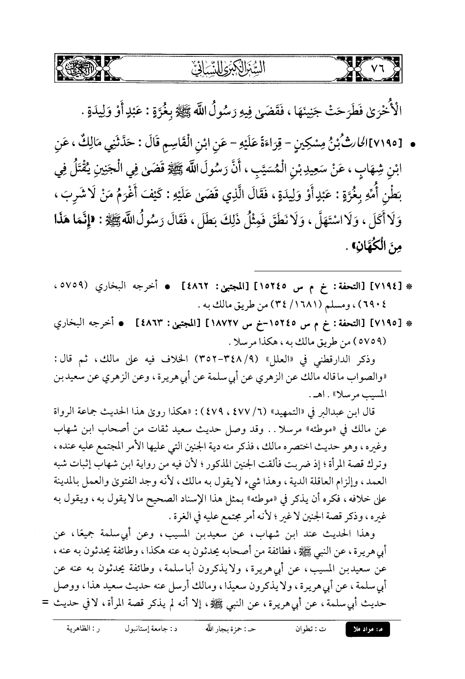 7195- الحَارِثُ بنُ مِسْكِينٍ، قِرَاءَةً عَلَيْهِ، عَنِ ابْنِ القَاسِمِ، قَالَ: حَدَّثني مَالِكٌ، عَنِ ابْنِ شِهَابٍ، عَن سَعِيدِ بنِ المُسَيَّبِ، أَنَّ رَسُولَ اللهِ صَلى الله عَلَيهِ وسَلم قَضَى فِي الجَنِينِ يُقْتَلُ فِي بَطْنِ أُمَّهِ، بِغُرَّةٍ عَبدٍ أَوْ وَلِيدَةٍ، فَقَالَ الَّذِي قَضَى عَلَيْهِ: كَيْفَ أَغْرَمُ مَنْ لا شَرِبَ، وَلا أَكَلَ، وَلا اسْتَهَلَّ، وَلا نَطَقَ، فَمِثْلُ ذَلِكَ بَطَلَ، فَقَالَ رَسُولُ اللهِ صَلى الله عَلَيهِ وسَلم: إِنَّمَا هَذَا مِنَ الكُهَّانِ.