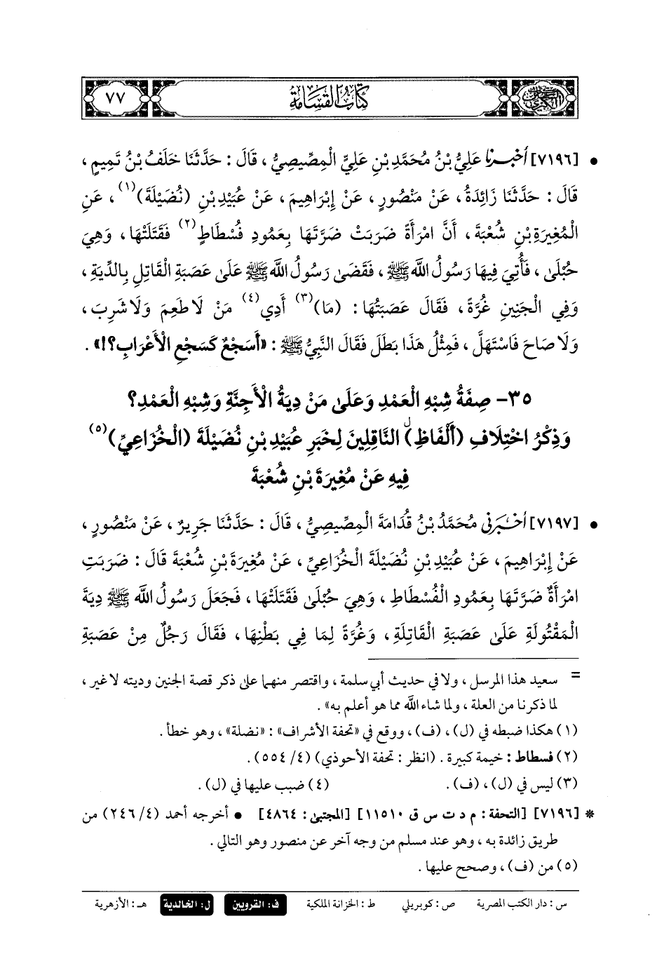 7197- أَخْبَرَنِي مُحَمدُ بنُ قُدَامَةَ المِصِّيصِيُّ، قَالَ: حَدَّثنا جَرِيرٌ، عَن مَنْصُورٍ، عَن إِبْرَاهِيمَ، عَن عُبَيْدِ بنِ نُضَيْلَةَ الخُزَاعِيِّ، عَن مُغِيرَةَ بنِ شُعْبَةَ قَالَ: ضَرَبَتِ امْرَأَةٌ ضَرَّتَهَا بِعَمُودِ الفُسْطَاطِ وَهِيَ حُبْلَى فَقَتَلَتْهَا، فَجَعَلَ رَسُولُ اللهِ صَلى الله عَلَيهِ وسَلم دِيَةَ المَقْتُولَةِ عَلَى عَصَبَةِ القَاتِلَةِ، وَغُرَّةً لِمَا فِي بَطْنِهَا، فَقَالَ رَجُلٌ مِنْ عَصَبَةِ القَاتِلَةِ، أَنَغْرَمُ دِيَةَ مَنْ لا أَكَلَ، وَلا شَرِبَ، وَلا اسْتَهَلَّ، فَمِثْلُ ذَلِكَ بَطَلَ، فَقَالَ رَسُولُ اللهِ صَلى الله عَلَيهِ وسَلم: أَسَجْعٌ كَسَجْعِ الأَعْرَابِ؟ فَجَعَلَ عَلَيْهِمُ الدِّيَةَ.
