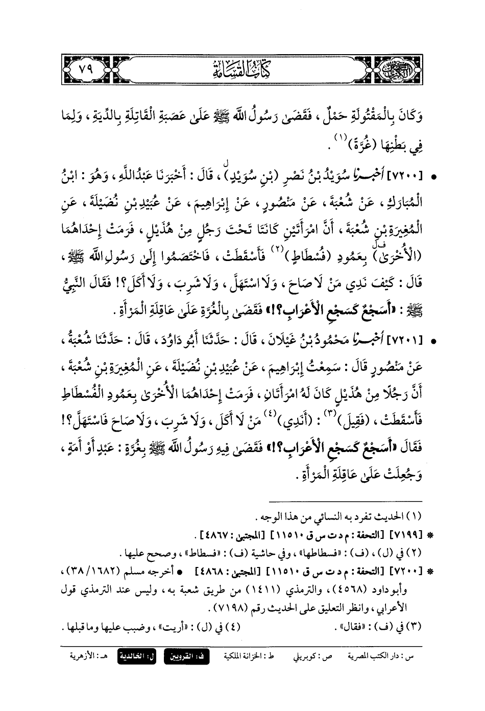 7200- أَخبَرنا سُوَيْدُ بنُ نَصْرِ بنِ سُوَيْدٍ، قَالَ: أَخبَرنا عَبدُ اللهِ، وَهُوَ ابْنُ المُبَارَكِ، عَن شُعْبَةَ، عَن مَنْصُورٍ، عَن إِبْرَاهِيمَ، عَن عُبَيْدِ بنِ نُضَيْلَةَ، عَنِ المُغِيرَةِ بنِ شُعْبَةَ، أَنَّ امْرَأَتَيْنِ كَانَتَا تَحْتَ رَجُلٍ مِنْ هُذَيْلٍ، فَرَمَتْ إِحْدَاهُمَا الأُخْرَى بِعَمُودِ فُسْطَاطٍ فَأَسْقَطَتْ، فَاخْتَصَمُوا إِلَى رَسُولِ اللهِ صَلى الله عَلَيهِ وسَلم فَقَالُوا (1): كَيْفَ نَدِيَ مَنْ لا صَاحَ، وَلا اسْتَهَلَّ، وَلا شَرِبَ، وَلا أَكَلَ، فَقَالَ النَّبيُّ صَلى الله عَلَيهِ وسَلم: أَسَجْعٌ كَسَجْعِ الأَعْرَابِ؟ فَقَضَى بِالغُرَّةِ عَلَى عَاقِلَةِ المَرْأَةِ.