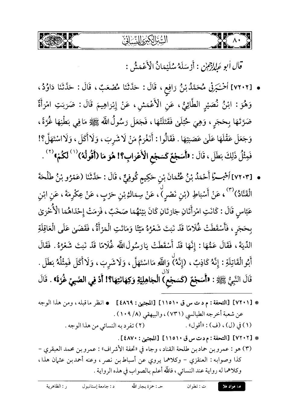 7202- أَخْبَرَنِي مُحَمدُ بنُ رَافِعٍ، قَالَ: حَدَّثنا مُصْعَبٌ، قَالَ: حَدَّثنا دَاوُدُ، وَهُوَ ابْنُ نُصَيْرٍ الطَّائِيُّ، عَنِ الأَعْمَشِ، عَن إِبْرَاهِيمَ قَالَ: ضَرَبَتِ امْرَأَةٌ ضَرَّتَهَا بِحَجَرٍ وَهِيَ حُبْلَى فَقَتَلَتْهَا، فَجَعَلَ رَسُولُ اللهِ صَلى الله عَلَيهِ وسَلم مَا فِي بَطْنِهَا غُرَّةً، وَجَعَلَ عَقْلَهَا عَلَى عَصَبَتِهَا، فَقَالُوا: أَنَغْرَمُ مَنْ لا شَرِبَ، وَلا أَكَلَ، وَلا اسْتَهَلَّ، فَمِثْلُ ذَلِكَ بَطَلَ، فَقَالَ: أَسَجْعٌ كَسَجْعِ الأَعْرَابِ؟ هُوَ مَا أَقُولُ لَكُمْ.