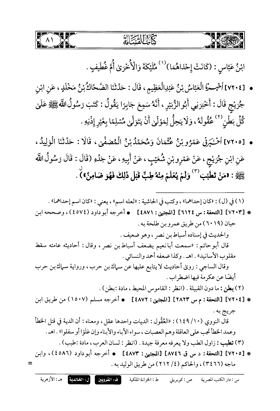7204- أَخبَرنا العَبَّاسُ بنُ عَبدِ العَظِيمِ، قَالَ: حَدَّثنا الضَّحَّاكُ بنُ مَخْلَدٍ، عَنِ ابْنِ جُرَيْجٍ، قَالَ: أَخْبَرَنِي أَبو الزُّبَيْرِ، أَنَّهُ سَمِعَ جَابِرًا يَقُولُ: كَتَبَ رَسُولُ اللهِ صَلى الله عَلَيهِ وسَلم عَلَى كُلِّ بَطْنٍ عُقُولَهُ، وَلا يَحِلُّ لِمَوْلًى أَنْ يَتَوَلَّى مُسْلِمًا بِغَيْرِ إِذْنِهِ.