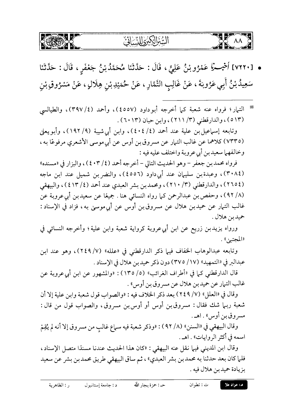 7220- أَخبَرنا عَمْرُو بنُ عَليٍّ، قَالَ: حَدَّثنا مُحَمدُ بنُ جَعْفَرٍ، قَالَ: حَدَّثنا سَعِيدُ بنُ أَبي عَرُوبَةَ، عَن غَالِبٍ التَّمَّارِ، عَن حُمَيْدِ بنِ هِلالٍ، عَن مَسْرُوقِ بنِ أَوْسٍ، عَن أَبي مُوسَى، عَنِ النَّبيِّ صَلى الله عَلَيهِ وسَلم قَالَ: الأَصَابِعُ سَوَاءٌ عَشْرٌ.
