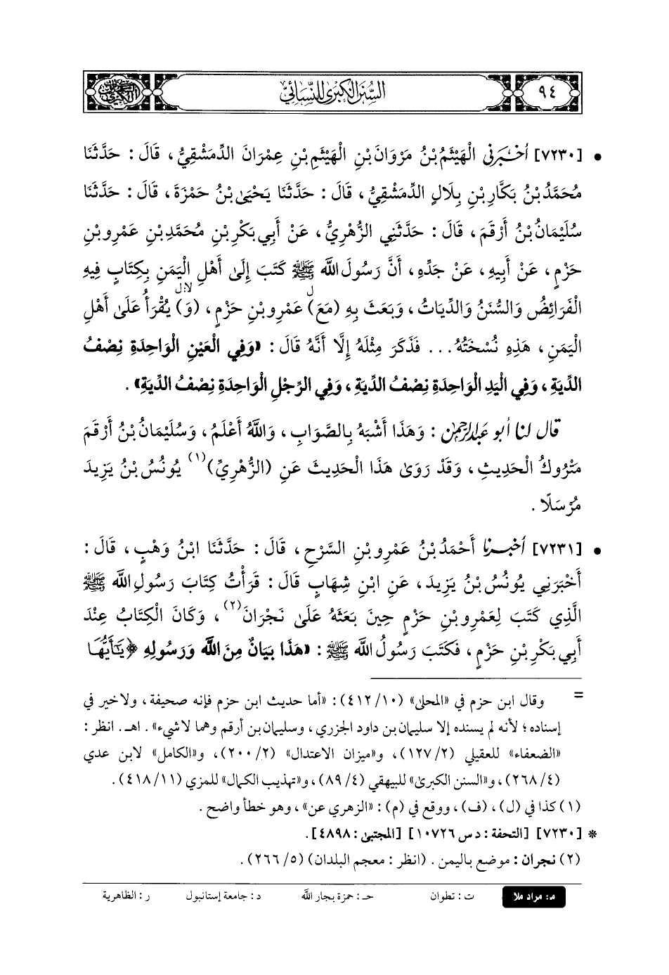 7230 - أَخْبَرَنِي الهَيْثَمُ بنُ مَرْوَانَ بنِ الهَيْثَمِ بنِ عِمْرَانَ الدِّمَشْقِيُّ، قَالَ: حَدَّثنا مُحَمدُ بنُ بَكَّارِ بنِ بِلالٍ الدِّمَشْقِيُّ، قَالَ: حَدَّثنا يَحْيَى بنُ حَمْزَةَ، قَالَ: حَدَّثنا سُلَيْمَانُ بنُ أَرْقَمَ، قَالَ: حَدَّثني الزُّهْرِيُّ، عَن أَبي بَكْرِ بنِ مُحَمدِ بنِ عَمْرِو بنِ حَزْمٍ، عَن أَبيهِ، عَن جَدِّهِ، أَنَّ رَسُولَ اللهِ صَلى الله عَلَيهِ وسَلم كَتَبَ إِلَى أَهْلِ اليَمَنِ بِكِتَابٍ فِيهِ الفَرَائِضُ، وَالسُّنَنُ، وَالدِّيَاتُ وَبَعَثَ بِهِ مَعَ عَمْرِو بنِ حَزْمٍ، وَيُقْرَأُ عَلَى أَهْلِ اليَمَنِ هَذِه نُسْخَتُهُ، ... فَذَكَرَ مِثْلَهُ، إِلاَّ أَنَّهُ قَالَ: وَفِي العَيْنِ الوَاحِدَةِ نِصْفُ الدِّيَةِ، وَفِي اليَدِ الوَاحِدَةِ نِصْفُ الدِّيَةِ، وَفِي الرِّجْلِ الوَاحِدَةِ نِصْفُ الدِّيَةِ.