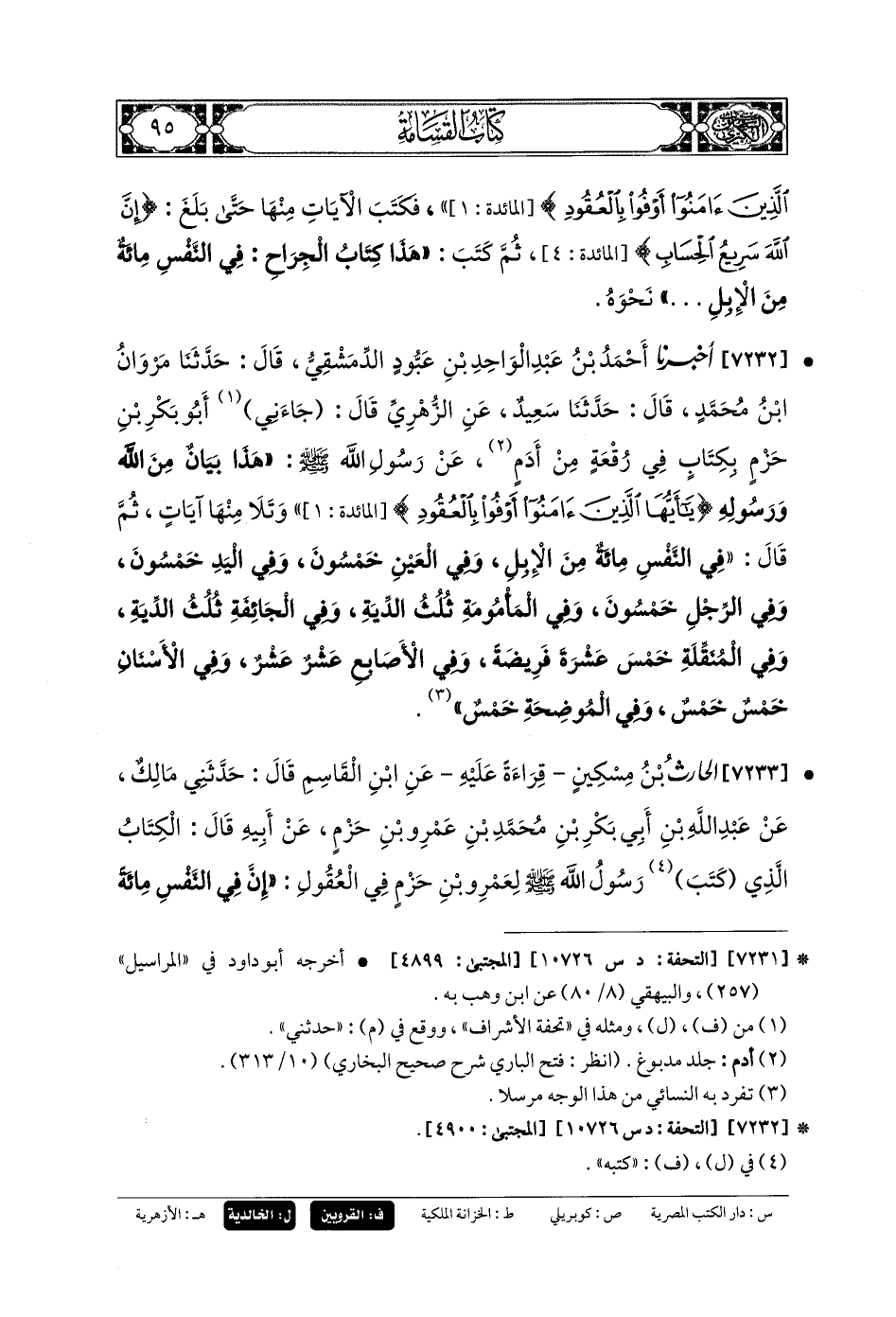 7232 - أَخبَرنا أَحْمَدُ بنُ عَبدِ الوَاحِدِ بنِ عَبُّودٍ الدِّمَشْقِيُّ، قَالَ: حَدَّثنا مَرْوَانُ بنُ مُحَمدٍ، قَالَ: حَدَّثنا سَعِيدٌ، عَنِ الزُّهْرِيِّ، قَالَ: جَاءَنِي أَبو بَكْرِ بنُ حَزْمٍ بِكِتَابٍ فِي رُقْعَةٍ مِنْ أَدَمٍ عَن رَسُولِ اللهِ صَلى الله عَلَيهِ وسَلم، هَذَا بَيَانٌ مِنَ اللهِ وَرَسُولِهِ: {يَا أَيُّهَا الَّذِينَ آمَنُوا أَوْفُوا بِالعُقُودِ} وَتَلا مِنْهَا آيَاتٍ، ثُمَّ قَالَ: فِي النَّفْسِ مِئَةٌ مِنَ الإِبِلِ، وَفِي العَيْنِ خَمْسُونَ، وَفِي اليَدِ خَمْسُونَ، وَفِي الرِّجْلِ خَمْسُونَ، وَفِي المَأْمُومَةِ ثُلُثُ الدِّيَةِ، وَفِي الجَائِفَةِ ثُلُثُ الدِّيَةِ، وَفِي المُنَقِّلَةِ خَمْسَ عَشْرَةَ فَرِيضَةً، وَفِي الأَصَابِعِ عَشْرٌ عَشْرٌ، وَفِي الأَسْنَانِ خَمْسٌ خَمْسٌ، وَفِي المُوضِحَةِ خَمْسٌ.