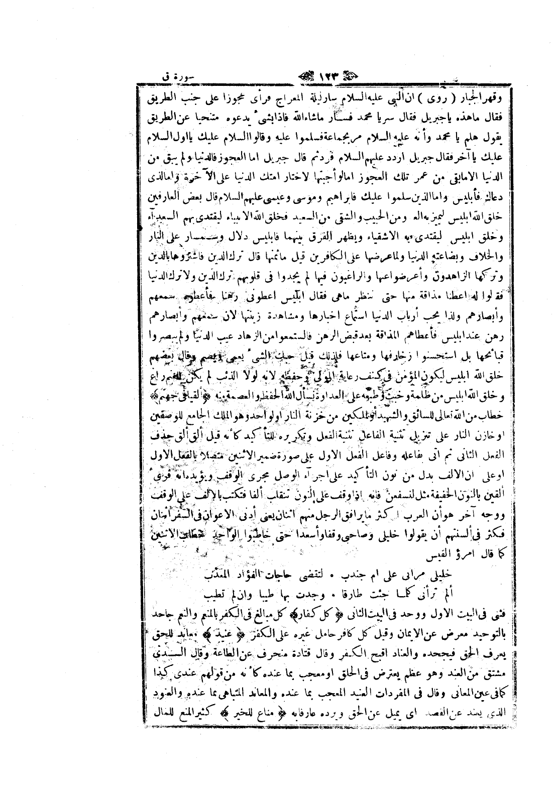 وقهر الجبار (روى) ان النبي عليه السلام سار ليلة المعراج فرأى عجوزا على جنب الطريق فقال ما هذه يا جبريل فقال سريا محمد فسار ما شاء الله فاذا بشيء يدعوه متنحيا عن الطريق يقول هلم يا محمد وأنه عليه السلام مر بجماعة فسلموا عليه وقالوا السلام عليك يا أول السلام عليك يا آخر فقال جبريل اردد عليهم السلام فرد ثم قال جبريل اما العجوز فالدنيا ولم يبق من الدنيا الا ما بقي من عمر تلك العجوز اما لو أجبتها لاختار أمتك الدنيا على الآخرة واما لذى دعاك فأبليس واما الذين سلموا عليك فابراهيم وموسى وعيسى عليهم السلام قال بعض العارفين خلق الله إبليس ليميز به العدو من الحبيب والشقي من السعيد فخلق الله الأنبياء ليقتدى بهم السعداء وخلق إبليس ليقتدى به الأشقياء ويظهر الفرق بينهما فابليس دلال وسمسار على النار والخلاف وبضاعته الدنيا ولما عرضها على الكافرين قيل ما ثمنها قال ترك الدين فاشتروها بالدين وتركها الزاهدون وأعرضوا عنها والراغبون فيها لم يجدوا في قلوبهم ترك الدين ولا ترك الدنيا فقالوا له أعطنا مذاقة منها حتى ننظر ما هى فقال إبليس أعطوني رهنا فأعطوه سمعهم وأبصارهم ولذا يحب أرباب الدنيا استماع اخبارها ومشاهدة زينتها لان سمعهم وأبصارهم رهن عند إبليس فأعطاهم المذاقة بعد قبض الرهن فاستمعوا من الزهاد عيب الدنيا ولم يبصروا قبائحها بل استحسنوا زخارفها ومتاعها فلذلك قيل حبك الشيء يعمى ويصم وقال بعضهم خلق الله إبليس ليكون المؤمن في كنف رعاية المولى وحفظه لانه لولا الذئب لم يكن للغنم راع وخلق الله إبليس من ظلمة وخبث وطبعه على العداوة نسأل الله الحفظ والعصمة منه أَلْقِيا فِي جَهَنَّمَ خطاب من الله تعالى للسائق والشهيد أو لملكين من خزنة النار او لواحد وهو الملك الجامع للوصفين او خازن النار على تنزيل تثنية الفاعل تثنية الفعل وتكريره للتأكيد كأنه قيل ألق ألق حذف الفعل الثاني ثم اتى بفاعله وفاعل الفعل الاول على صورة ضمير الاثنين متصلا بالفعل الاول او على ان الالف بدل من نون التأكيد على اجزاء الوصل مجرى الوقف ويؤيده انه قرئ ألقين بالنون الخفيفة مثل لنسفعن فانه إذا وقف على النون تنقلب ألفا فتكتب بالألف على الوقف ووجه آخر هو أن العرب اكثر ما يرافق الرجل منهم اثنان يعنى أدنى الأعوان في السفر اثنان فكثر في ألسنتهم أن يقولوا خليلى وصاحبى وقفا وأسعدا حتى خاطبوا الواحد خطاب الاثنين كما قال امرؤ القيس