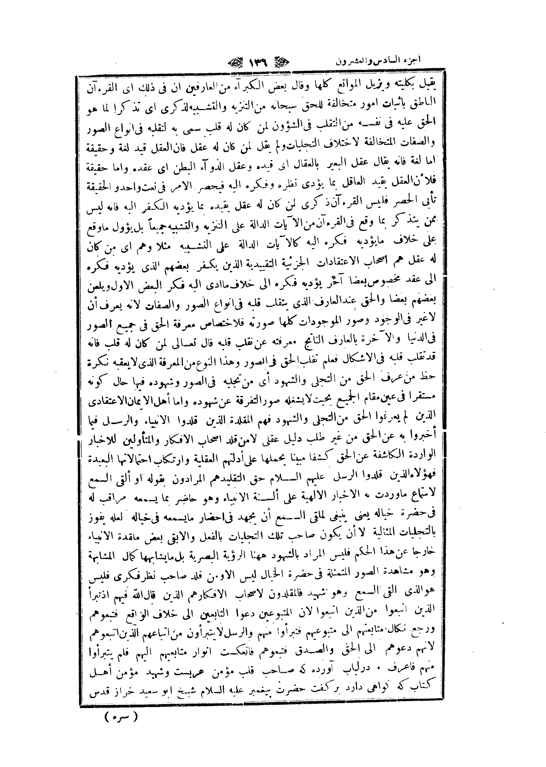 والحق عند العارف الذي يتقلب قلبه في انواع الصور والصفات لانه يعرف أن لا غير في الوجود وصور الموجودات كلها صورته فلاختصاص معرفة الحق في جميع الصور فى الدنيا والآخرة بالعارف الناتج معرفته عن تقلب قلبه قال تعالى لمن كان له قلب فانه قد تقلب قلبه في الاشكال فعلم تقلب الحق في الصور وهذا النوع من المعرفة الذي لا يعقبه نكرة حظ من عرف الحق من التجلي والشهود أي من تجليه في الصور وشهوده فيها حال كونه مستقرا في عين مقام الجميع بحيث لا يشغله صور التفرقة عن شهوده واما أهل الايمان الاعتقادى الذين لم يعرفوا الحق من التجلي والشهود فهم المقلدة الذين قلدوا الأنبياء والرسل فيما أخبروا به عن الحق من غير طلب دليل عقلى لا من قلد اصحاب الافكار والمتأولين للاخبار الواردة الكاشفة عن الحق كشفا مبينا يحملها على أدلتهم العقلية وارتكاب احتمالاتها البعيدة فهؤلاء الذين قلدوا الرسل عليهم السلام حق التقليد هم المرادون بقوله او ألقى السمع لاستماع ما وردت به الاخبار الالهية على ألسنة الأنبياء وهو حاضر بما يسمعه مراقب له فى حضرة خياله يعنى ينبغى لملقى السمع أن يجهد في إحضار ما يسمعه في خياله لعله يفوز بالتجليات المثالية لا أن يكون صاحب تلك التجليات بالفعل وإلا بقي بعض ملقدة الأنبياء خارجا عن هذا الحكم فليس المراد بالشهود هاهنا الرؤية البصرية بل ما يشابهها كمال المشابهة وهو مشاهدة الصور المتمثلة في حضرة الخيال ليس الا ومن قلد صاحب نظر فكرى فليس هو الذي القى السمع وهو شهيد فالمقلدون لاصحاب الأفكار هم الذين قال الله فيهم إذ تبرأ الذين اتبعوا من الذين اتبعوا لان المتبوعين دعوا التابعين الى خلاف الواقع فتبعوهم ورجع نكال متابعتهم الى متبوعيهم فتبرأوا منهم والرسل لا يتبرأون من اتباعهم الذين اتبعوهم لانهم دعوهم الى الحق والصدق فتبعوهم فانعكست أنوار متابعيهم إليهم فلم يتبرأوا منهم فاعرف در لباب آورده كه صاحب قلب مؤمن عربست وشهيد مؤمن أهل كتاب كه كواهى دارد بر كفت حضرت پيغمبر عليه السلام شيخ ابو سعيد خراز قدس