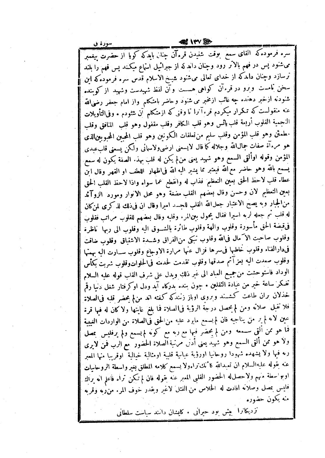 سره فرموده كه القاى سمع بوقت شنيدن قرآن چنان بايد كه كويا از حضرت پيغمبر مى شنود پس در فهم بالاتر رود و چنان داند كه از جبرائيل استماع ميكند پس فهم را بلند تر سازد و چنان داند كه از خداى تعالى مى شنود شيخ الإسلام قدس سره فرموده كه اين سخن تا مست وبرو در قرآن كواهى هست وآن لفظ شهيدست وشهيد از كوينده شنود نه از خبر دهنده چهـ غائب از مخبر مى شنود وحاضر با متكلم واز امام جعفر رضى الله عنه منقولست كه تكرار ميكردم قرآنرا تا وقتى كه از متكلم آن شنودم وفي التأويلات النجمية القلوب أربعة قلب يائس وهو قلب الكافر وقلب مقفول وهو قلب المنافق وقلب مطمئن وهو قلب المؤمن وقلب سليم من تعلقات الكونين وهو قلب المحبين المحبوبين الذي هو مرءاة صفات جمال الله وجلاله كما قال لا يسعنى ارضى ولا سمائى ولكن يسعنى قلب عبدى المؤمن وقوله او ألقى السمع وهو شهيد يعنى من لم يكن له قلب بهذه الصفة يكون له سمع يسمع بالله وهو حاضر مع الله فيعتبر مما يشير اليه الله في اظهار اللطف او القهر وقال ابن عطاء قلب لا حظ الحق بعين التعظيم فذاب له وانقطع عما سواه وإذا لا حظ القلب الحق بعين التعظيم لان وحسن وقال بعضهم القلب مضغة وهو محل الأنوار ومورد الزوائد من الجبار وبه يصح الاعتبار جعل الله القلب للجسد أميرا وقال ان في ذلك لذكرى لمن كان له قلب ثم جعله لربه أسيرا فقال يحول بين المرء وقلبه وقال بعضهم للقلوب مراتب فقلوب فى قبضة الحق مأسورة وقلوب والهة وقلوب طائرة بالشوق اليه وقلوب الى ربها ناظرة وقلوب صاحبت الآمال في الله وقلوب تبكى من الفراق وشدة الاشتياق وقلوب ضاقت فى دار الفناء وقلوب خاطبها في سرها فزال عنها مرارة الأوجاع وقلب سارت اليه بهمتها وقلوب صعدت اليه بعزائم صدقها وقلوب تقدمت لخدمته في الحلوات وقلوب شربت بكأس الوداد فاستوحشت من جميع العباد الى غير ذلك ويدل على شرف القلب قوله عليه السلام تفكر ساعة خير من عبادة الثقلين چون بنده بدرگاه آيد ودل او كرفتار شغل دنيا