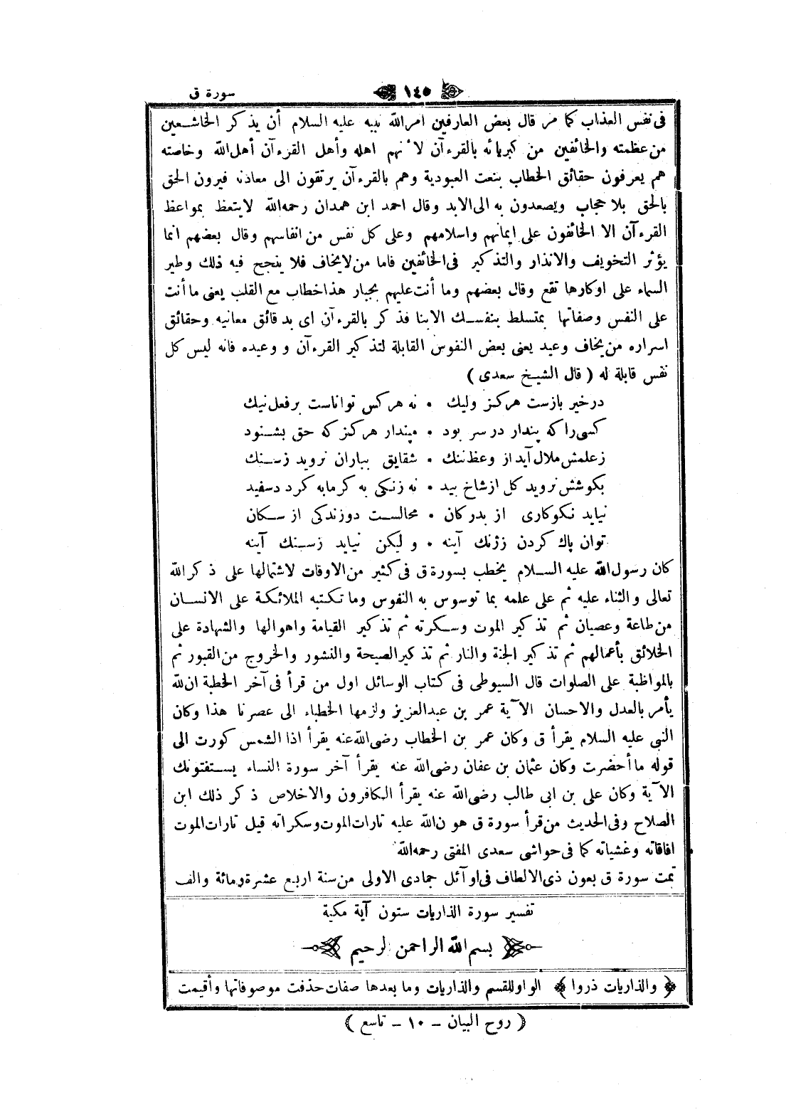 كان رسول الله عليه السلام يخطب بسورة ق في كثير من الأوقات لاشتمالها على ذكر الله تعالى والثناء عليه ثم على علمه بما توسوس به النفوس وما تكتبه الملائكة على الإنسان من طاعة وعصيان ثم تذكير الموت وسكرته ثم تذكير القيامة وأهوالها والشهادة على الخلائق بأعمالهم ثم تذكير الجنة والنار ثم تذكير الصيحة والنشور والخروج من القبور ثم بالمواظبة على الصلوات قال السيوطي في كتاب الوسائل أول من قرأ في آخر الخطبة ان لله يأمر بالعدل والإحسان الآية عمر بن عبد العزيز ولزمها الخطباء الى عصرنا هذا وكان النبي عليه السلام يقرأ ق وكان عمر بن الخطاب رضى الله عنه يقرأ إذا الشمس كورت الى قوله ما أحضرت وكان عثمان بن عفان رضى الله عنه يقرأ آخر سورة النساء يستفتونك الآية وكان على بن ابى طالب رضى الله عنه يقرأ الكافرون والإخلاص ذكر ذلك ابن الصلاح وفي الحديث من قرأ سورة ق هون الله عليه تارات الموت وسكراته قيل تارات الموت إفاقاته وغشياته كما في حواشى سعدى المفتى رحمه الله تمت سورة ق بعون ذى الألطاف في أوائل جمادى الاولى من سنة اربع عشرة ومائة والف تفسير سورة الذاريات ستون آية مكية