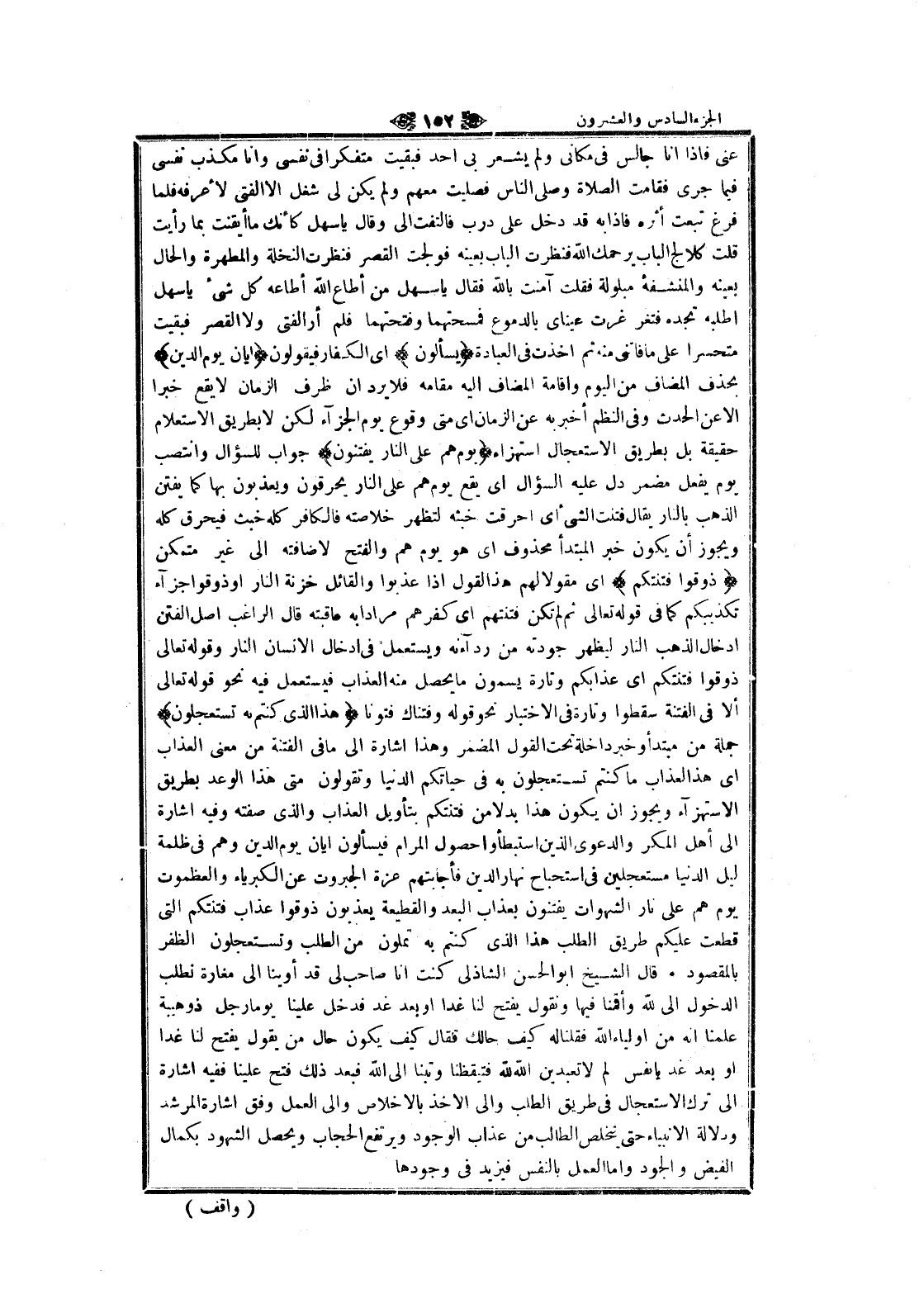 عنى فاذا انا جالس في مكانى ولم يشعر بي أحد فبقيت متفكرا في نفسى وانا مكذب نفسى فيما جرى فقامت الصلاة وصلّى الناس فصليت معهم ولم يكن لى شغل الا الفتى لأعرفه فلما فرغ تبعت أثره فاذا به قد دخل على درب فالتفت الى وقال يا سهل كأنك ما أيقنت بما رأيت قلت كلالج الباب يرحمك الله فنظرت الباب بعينه فولجت القصر فنظرت النخلة والمطهرة والحال بعينه والمنشفه مبلولة فقلت آمنت بالله فقال يا سهل من أطاع الله أطاعه كل شيء يا سهل اطلبه تجده فتغر غرت عيناى بالدموع فمسحتهما وفتحتهما فلم أر الفتى ولا القصر فبقيت متحسرا على ما فاتنى منه ثم أخذت في العبادة يَسْئَلُونَ اى الكفار فيقولون أَيَّانَ يَوْمُ الدِّينِ بحذف المضاف من اليوم واقامة المضاف اليه مقامه فلا يرد ان ظرف الزمان لا يقع خبرا الا عن الحدث وفي النظم أخبر به عن الزمان اى متى وقوع يوم الجزاء لكن لا بطريق الاستعلام حقيقة بل بطريق الاستعجال استهزاء يَوْمَ هُمْ عَلَى النَّارِ يُفْتَنُونَ جواب للسؤال وانتصب يوم يفعل مضمر دل عليه السؤال اى يقع يوم هم على النار يحرقون ويعذبون بها كما يفتن الذهب بالنار يقال فتنت الشيء اى أحرقت خبثه لتظهر خلاصته فالكافر كله خبث فيحرق كله ويجوز أن يكون خبر المبتدأ محذوف اى هو يوم هم والفتح لاضافته الى غير متمكن ذُوقُوا فِتْنَتَكُمْ اى مقولالهم هذا القول إذا عذبوا والقائل خزنة النار أو ذوقوا جزاء تكذيبكم كما في قوله تعالى ثم لم تكن فتنتهم اى كفرهم مرادا به عاقبته قال الراغب اصل الفتن إدخال الذهب النار ليظهر جودته من ردآءنه ويستعمل في إدخال الإنسان النار وقوله تعالى ذوقوا فتنتكم اى عذابكم وتارة يسمون ما يحصل منه العذاب فيستعمل فيه نحو قوله تعالى ألا في الفتنة سقطوا وتارة في الاختيار نحو قوله وفتناك فتونا هذَا الَّذِي كُنْتُمْ بِهِ تَسْتَعْجِلُونَ جملة من مبتدأ وخبر داخلة تحت القول المضمر وهذا اشارة الى ما في الفتنة من معنى العذاب اى هذا العذاب ما كنتم تستعجلون به في حياتكم الدنيا وتقولون متى هذا الوعد بطريق الاستهزاء ويجوز ان يكون هذا بدلا من فتنتكم بتأويل العذاب والذي صفته وفيه اشارة الى أهل المكر والدعوى الذين استبطأوا حصول المرام فيسألون أيان يوم الدين وهم في ظلمة ليل الدنيا مستعجلين في استصباح نهار الدين فأجابتهم عزة الجبروت عن الكبرياء والعظموت يوم هم على نار الشهوات يفتنون بعذاب البعد والقطيعة يعذبون ذوقوا عذاب فتنتكم التي قطعت عليكم طريق الطلب هذا الذي كنتم به تملون من الطلب وتستعجلون الظفر بالمقصود. قال الشيخ ابو الحسن الشاذلى كنت انا صاحب لى قد أوينا الى مغارة نطلب الدخول الى الله وأقمنا فيها ونقول يفتح لنا غدا او بعد غد فدخل علينا يوما رجل ذوهيبة علمنا انه من اولياء الله فقلنا له كيف حالك فقال كيف يكون حال من يقول يفتح لنا غدا او بعد غد يا نفس لم لا تعبدين الله لله فتيقظنا وتبنا الى الله فبعد ذلك فتح علينا ففيه اشارة الى ترك الاستعجال في طريق الطلب والى الاخذ بالإخلاص والى العمل وفق اشارة المرشد ودلالة الأنبياء حتى يتخلص الطالب من عذاب الوجود ويرتفع الحجاب ويحصل الشهود بكمال الفيض والجود واما العمل بالنفس فيزيد في وجودها