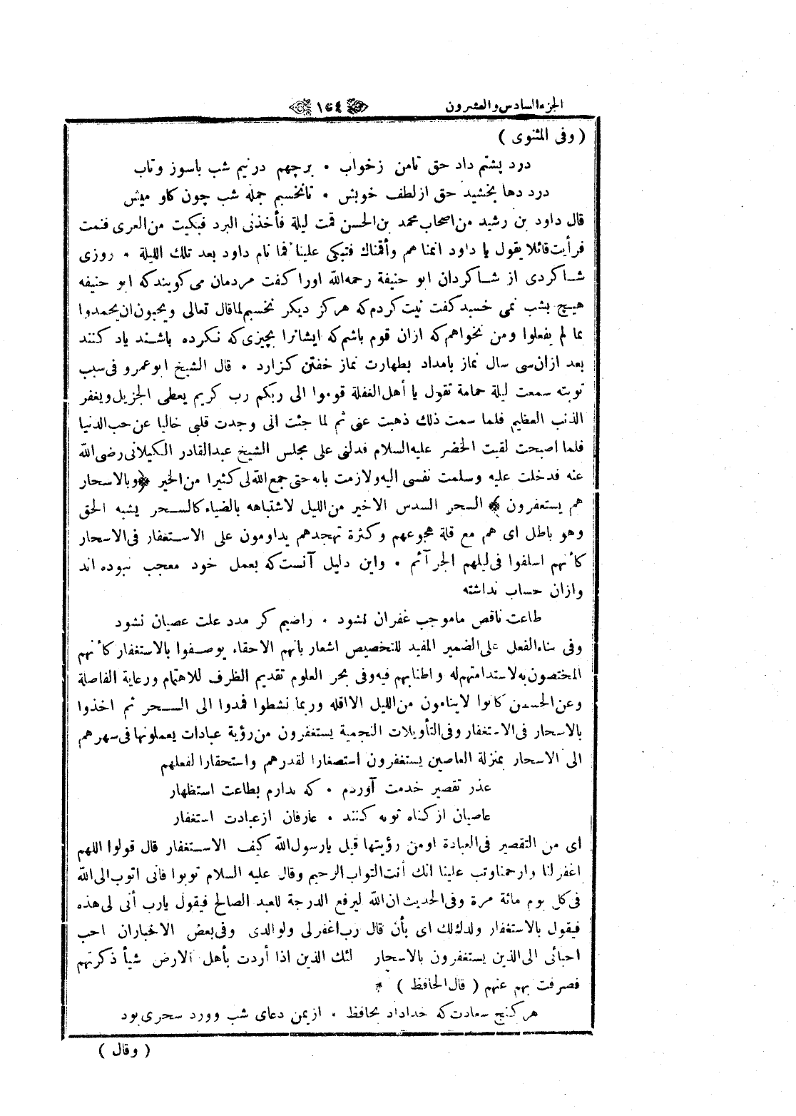 قال داود بن رشيد من اصحاب محمد بن الحسن قمت ليلة فأخذنى البرد فبكيت من العرى فنمت فرأيت قائلا يقول يا داود أنمناهم وأقمناك فتبكى علينا فما نام داود بعد تلك الليلة روزى شاكردى از شاكردان ابو حنيفة رحمه الله او را كفت مردمان مى كويند كه ابو حنيفه هيچ بشب نمى خسبد كفت نيت كردم كه هركز ديكر نخسبم لما قال تعالى ويحبون ان يحمدوا بما لم يفعلوا ومن نخواهم كه از ان قوم باشم كه ايشانرا بچيزى كه نكرده باشند ياد كنند بعد از ان سى سال نماز بامداد بطهارت نماز خفتن گزارد قال الشيخ ابو عمرو في سبب توبته سمعت ليلة حمامة تقول يا أهل الغفلة قوموا الى ربكم رب كريم يعطى الجزيل ويغفر الذنب العظيم فلما سمت ذلك ذهبت عنى ثم لما جئت الى وجدت قلبى خاليا عن حب الدنيا فلما أصبحت لقيت الخضر عليه السلام فدلنى على مجلس الشيخ عبد القادر الكيلاني رضى الله عنه فدخلت عليه وسلمت نفسى اليه ولازمت بابه حتى جمع الله لى كثيرا من الخير وَبِالْأَسْحارِ هُمْ يَسْتَغْفِرُونَ السحر السدس الأخير من الليل لاشتباهه بالضياء كالسحر يشبه الحق وهو باطل اى هم مع قلة هجوعهم وكثرة تهجدهم يداومون على الاستغفار في الاسحار كأنهم اسلفوا في ليلهم الجرائم واين دليل آنست كه بعمل خود معجب نبوده اند واز ان حساب نداشته