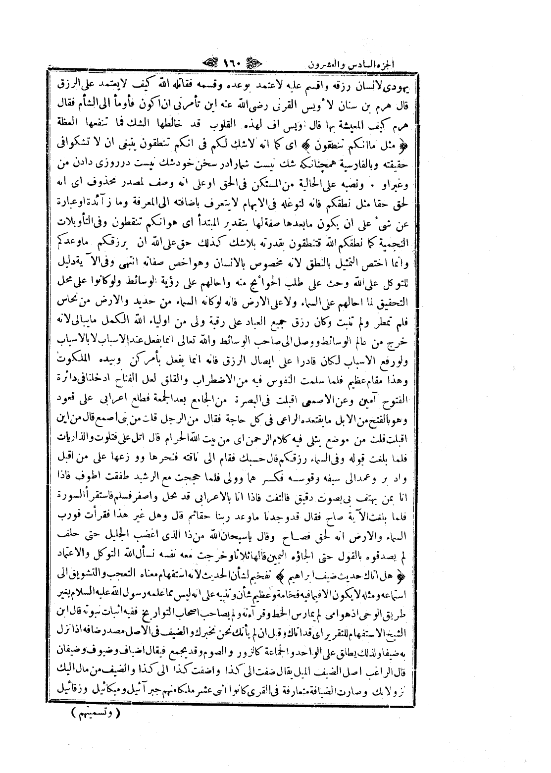 يهودى لانسان رزقه واقسم عليه لاعتمد بوعده وقسمه فقاتله الله كيف لا يعتمد على الرزق قال هرم بن سنان لأويس القرني رضى الله عنه اين تأمرنى ان أكون فأومأ الى الشام فقال هرم كيف المعيشة بها قال اويس أف لهذه القلوب قد خالطها الشك فما تنفعها العظة مِثْلَ ما أَنَّكُمْ تَنْطِقُونَ اى كما انه لا شك لكم في انكم تنطقون ينبغى ان لا تشكوا في حقيقته وبالفارسية همچنانكه شك نيست شما را در سخن خود شك نيست در روزى دادن من وغير او ونصبه على الحالية من المستكن في الحق او على انه وصف لمصدر محذوف اى انه لحق حقا مثل نطقكم فانه لتوغله في الإبهام لا يتعرف بإضافته الى المعرفة وما زائدة او عبارة عن شيء على ان يكون ما بعدها صفة لها بتقدير المبتدأ اى هو انكم تنقطون وفي التأويلات النجمية كما نطقكم الله قتنطقون بقدرته بلا شك كذلك حق على الله ان يرزقكم ما وعدكم وانما اختص التمثيل بالنطق لانه مخصوص بالإنسان وهو أخص صفاته انتهى وفي الآية دليل للتوكل على الله وحث على طلب الحوائج منه وأحالهم على رؤية الوسائط ولو كانوا على محل التحقيق لما أحالهم على السماء ولا على الأرض فانه لو كانه السماء من حديد والأرض من نحاس فلم تمطر ولم تنبت وكان رزق جميع العباد على رقبة ولى من اولياء الله الكمل ما يبالى لانه خرج من عالم الوسائط ووصل الى صاحب الوسائط والله تعالى انما يفعل عند الأسباب لا بالأسباب ولو رفع الأسباب لكان قادرا على إيصال الرزق فانه انما يفعل بأمركن وبيده الملكوت وهذا مقام عظيم فلما سلمت النفوس فيه من الاضطراب والقلق لعل الفتاح أدخلنا في دائرة الفتوح آمين وعن الأصمعي أقبلت في البصرة من الجامع بعد الجمعة فطلع أعرابي على قعود وهو بالفتح من الإبل ما يقتعده الراعي في كل حاجة فقال من الرجل قلت من بنى اصمع قال من اين أقبلت قلت من موضع يتلى فيه كلام الرحمن اى من بيت الله الحرام قال اتل على فتلوت والذاريات فلما بلغت قوله وفي السماء رزقكم قال حسبك فقام الى ناقته فنحرها ووزعها على من اقبل واد بر وعمد الى سيفه وقوسه فكسرهما وولى فلما حججت مع الرشيد طفقت أطوف فاذا انا بمن يهتف بي بصوت دقيق فالتفت فاذا انا بالأعرابي قد نحل واصفر فسلم فاستقرأ السورة فلما بلغت الآية صاح فقال قد وجدنا ما وعد ربنا حقاثم قال وهل غير هذا فقرأت فو رب السماء والأرض انه لحق فصاح وقال يا سبحان الله من ذا الذي اغضب الجليل حتى حلف لم يصدقوه بالقول حتى إلجاؤه اليمين قالها ثلاثا وخرجت معه نفسه نسأل الله التوكل والاعتماد هَلْ أَتاكَ حَدِيثُ ضَيْفِ إِبْراهِيمَ تفخيم لشأن الحديث لانه استفهام معناه التعجب والتشويق الى استماعه ومثله لا يكون الا فيما فيه فخامة وعظيم شأن وتنبيه على انه ليس مما علمه رسول الله عليه السلام بغير طريق الوحى إذ هو أمي لم يمارس الخط وقراءته ولم يصاحب اصحاب التواريخ ففيه اثبات نبوته قال ابن الشيخ الاستفهام للتقرير اى قد أتاك وقيل ان لم يأتك نحن نخبرك والضيف في الأصل مصدر ضافه إذا نزل به ضيفا ولذلك يطلق على الواحد والجماعة كالزور والصوم وقد يجمع فيقال أضياف وضيوف وضيفان قال الراغب اصل الضيف الميل يقال ضفت الى كذا وأضفت كذا الى كذا والضيف من مال إليك نزولا بك وصارت الضيافة متعارفة في القرى كانوا اثنى عشر ملكا منهم جبرائيل وميكائيل وزقائيل