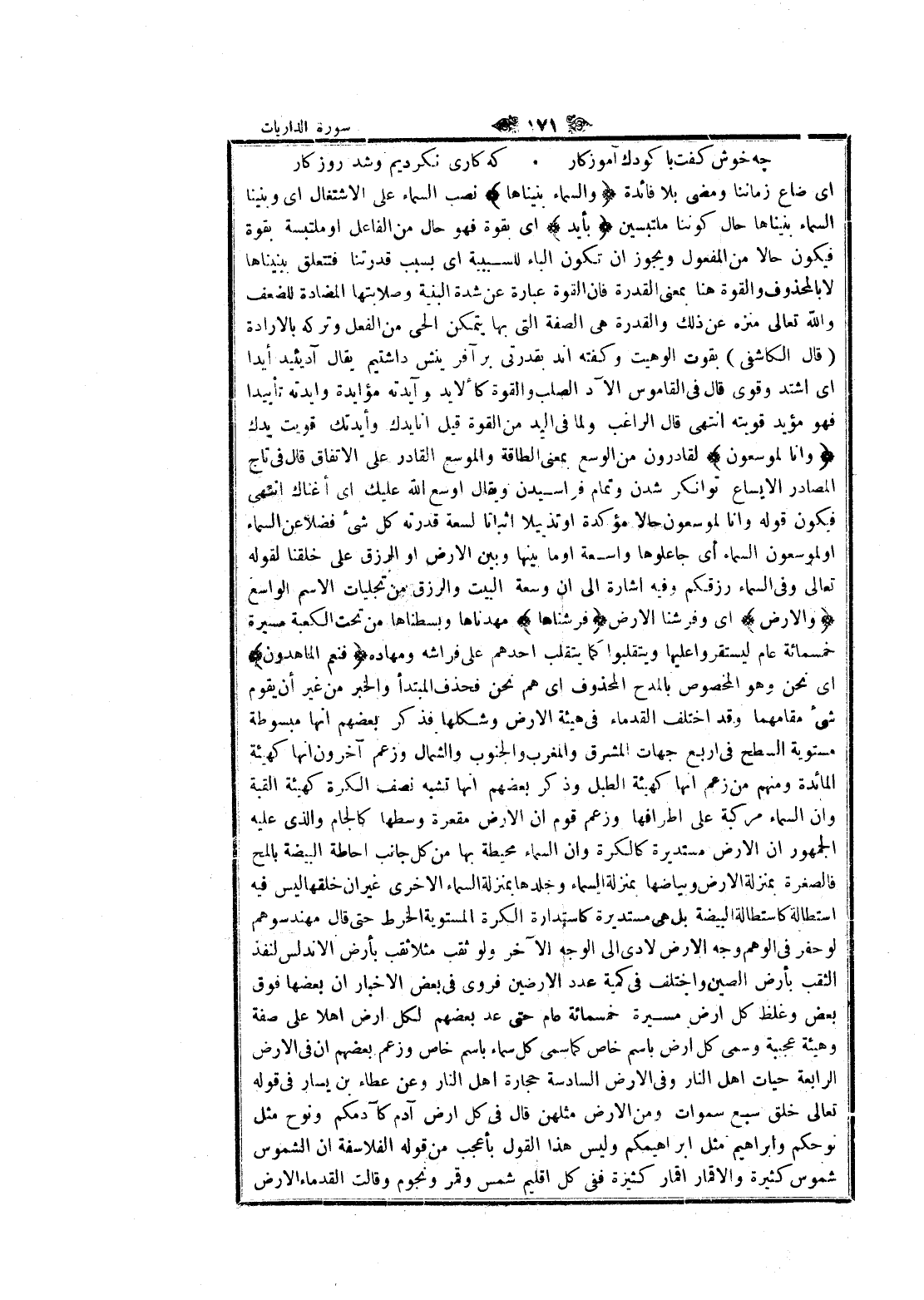 اى ضاع زماننا ومضى بلا فائدة وَالسَّماءَ بَنَيْناها نصب السماء على الاشتغال اى وبنينا السماء بنيناها حال كوننا ملتبسين بِأَيْدٍ اى بقوة فهو حال من الفاعل او ملتبسة بقوة فيكون حالا من المفعول ويجوز ان تكون الباء للسببية اى بسبب قدرتنا فتتعلق ببنيناها لا بالمحذوف والقوة هنا بمعنى القدرة فان القوة عبارة عن شدة البنية وصلابتها المضادة للضعف والله تعالى منزه عن ذلك والقدرة هى الصفة التي بها يتمكن الحي من الفعل وتركه بالارادة (قال الكاشفى) بقوت الوهيت وكفته اند بقدرتي بر آفرينش داشتيم يقال آد يئيد أيدا اى اشتد وقوى قال في القاموس الآد الصلب والقوة كألايد وآيدته مؤايدة وأيدته تأييدا فهو مؤيد قويته انتهى قال الراغب ولما في اليد من القوة قيل انا يدك وأيدتك قويت يدك وَإِنَّا لَمُوسِعُونَ لقادرون من الوسع بمعنى الطاقة والموسع القادر على الاتفاق قال في تاج المصادر الايساع توانكر شدن وتمام فراسيدن ويقال أوسع الله عليك اى أغناك انتهى فيكون قوله وانا لموسعون حالا مؤكدة او تذييلا اثباتا لسعة قدرته كل شيء فضلا عن السماء او لموسعون السماء اى جاعلوها واسعة او ما بينها وبين الأرض او الرزق على خلقنا لقوله تعالى وفي السماء رزقكم وفيه اشارة الى ان وسعة البيت والرزق من تجليات الاسم الواسع وَالْأَرْضَ اى وفرشنا الأرض فَرَشْناها مهدناها وبسطناها من تحت الكعبة مسيرة خمسمائة عام ليستقروا عليها ويتقلبوا كما يتقلب أحدهم على فراشه ومهاده فَنِعْمَ الْماهِدُونَ اى نحن وهو المخصوص بالمدح المحذوف اى هم نحن فحذف المبتدأ والخبر من غير أن يقوم شيء مقامهما وقد اختلف القدماء في هيئة الأرض وشكلها فذكر بعضهم انها مبسوطة مستوية السطح في اربع جهات المشرق والمغرب والجنوب والشمال وزعم آخرون انها كهيئة المائدة ومنهم من زعم انها كهيئة الطبل وذكر بعضهم انها تشبه نصف الكرة كهيئة القبة وان السماء مركبة على أطرافها وزعم قوم ان الأرض مقعرة وسطها كالجام والذي عليه الجمهور ان الأرض مستديرة كالكرة وان اسماء محيطة بها من كل جانب احاطة البيضة بالمح فالصغرة بمنزلة الأرض وبياضها بمنزلة السماء وجلدها بمنزلة السماء الاخرى غير ان خلقها ليس فيه استطالة كاستطالة البيضة بل هى مستديرة كاستدارة الكرة المستوية الخرط حتى قال مهندسوهم لو حفر في الوهم وجه الأرض لادى الى الوجه الآخر ولو ثقب مثلا ثقب بأرض الأندلس لنفذ الثقب بأرض الصين واختلف في كمية عدد الأرضين فروى في بعض الاخبار ان بعضها فوق بعض وغلظ كل ارض مسيرة خمسمائة عام حتى عد بعضهم لكل ارض أهلا على صفة وهيئة عجبة وسمى كل ارض باسم خاص كما سمى كل سماء باسم خاص وزعم بعضهم ان في الأرض الرابعة حيات اهل النار وفي الأرض السادسة حجارة اهل النار وعن عطاء بن يسار في قوله تعالى خلق سبع سموات ومن الأرض مثلهن قال في كل ارض آدم كآدمكم ونوح مثل نوحكم وابراهيم مثل ابراهيمكم وليس هذا القول بأعجب من قوله الفلاسفة ان الشموس شموس كثيرة والأقمار أقمار كثيرة ففى كل إقليم شمس وقمر ونجوم وقالت القدماء الأرض