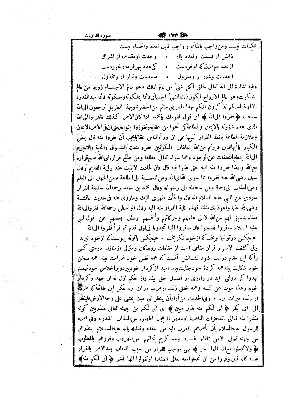 وفيه اشارة الى انه تعالى خلق لكل شيء من عالم الملك وهو عالم الأجسام زوجا من عالم الملكوت وهو عالم الأرواح ليكون ذلك الشيء الجسماني قائما بملكوته وملكوته قائما بيد القدرة الالهية لعلكم تذكرون انكم بهذا الطريق جئتم من الحضرة وبهذا الطريق ترجعون الى الله سبحانه فَفِرُّوا إِلَى اللَّهِ اى قول لقومك يا محمد إذا كان الأمر كذلك فاهربوا الى الله الذي هذه شؤونه بالايمان والطاعة كى تنجوا من عقابه وتفوزوا بثوابه يعنى ان في الأمر بالايمان وملازمة الطاعة بلفظ الفرار تنبيها على ان ورلء الناس عقابا يجب أن يفروا منه قال بعض الكبار يا أيها الذين فررتم من الله بتعلقات الكونين ففروا بنعت الشوق والمحبة والتجرد الى الله يقطع التعلقات عن الوجود وعما سواه تعالى مطلقا ومن صح فراره الى الله صح قراره مع الله وايضا ففروا منه اليه حتى تفنوا فيه قال فان الحادث لا يثبت عند رؤية القديم وقال سهل رضى الله عنه ففروا مما سوى الله الى الله ومن المعصية الى الطاعة ومن الجهل الى العلم ومن العذاب الى رحمة ومن سخطه الى رضوانه وقال محمد بن حامد رحمه الله حقيقة الفرار ما روى عن النبي عليه السلام انه قال والجأت ظهرى إليك وما روى عنه في حديث عائشة رضى الله عنها وأعوذ بك منك فهذه غاية الفرار منه اليه وقال الواسطي رحمه الله ففروا الى الله معناه لما سبق لهم من الله لا الى علمهم وحركاتهم وأنفسهم وسئل بعضهم عن قول النبي عليه السلام سافروا تصحوا قال سافروا إلينا تجدونا في أول قدم ثم قرأ ففروا الى الله