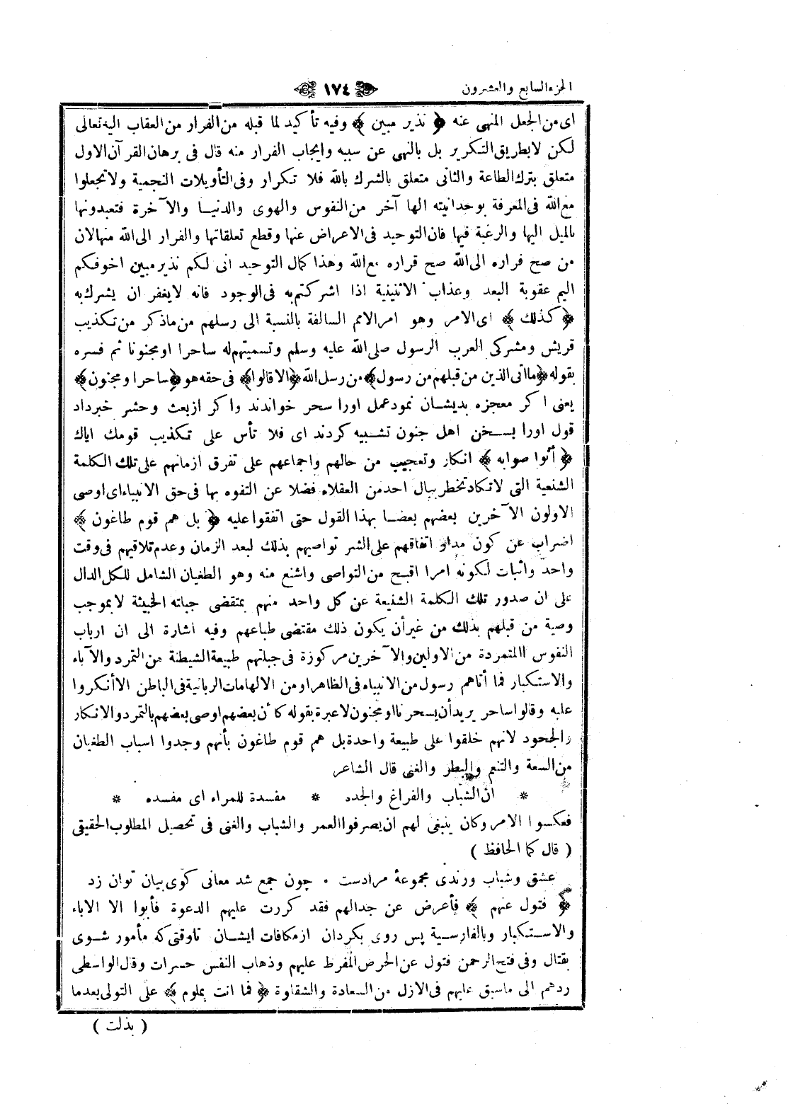 اى من الجعل المنهي عنه نَذِيرٌ مُبِينٌ وفيه تأكيد لما قبله من الفرار من العقاب اليه تعالى لكن لا بطريق التكرير بل بالنهى عن سببه وإيجاب الفرار منه قال في برهان القرآن الاول متعلق بترك الطاعة والثاني متعلق بالشرك بالله فلا تكرار وفي التأويلات النجمية ولا تجعلوا مع الله في المعرفة بوحدانيته الها آخر من النفوس والهوى والدنيا والآخرة فتعبدونها بالميل إليها والرغبة فيها فان التوحيد في الاعراض عنها وقطع تعلقاتها والفرار الى الله منها لان من صح فراره الى الله صح قراره مع الله وهذا كمال التوحيد انى لكم نذير مبين أخوفكم اليم عقوبة البعد وعذاب الاثنينية إذا أشركتم به في الوجود فانه لا يغفر ان يشرك به كَذلِكَ اى الأمر وهو امر الأمم السالفة بالنسبة الى رسلهم من ما ذكر من تكذيب قريش ومشركى العرب الرسول صلّى الله عليه وسلّم وتسميتهم له ساحرا او مجنونا ثم فسره بقوله ما أَتَى الَّذِينَ مِنْ قَبْلِهِمْ مِنْ رَسُولٍ من رسول الله إِلَّا قالُوا فى حقه هو ساحِرٌ أَوْ مَجْنُونٌ يعنى اگر معجزه بديشان نمود عمل او را سحر خواندند واگر از بعث وحشر خبر داد قول او را بسخن اهل جنون تشبيه كردند اى فلا تأس على تكذيب قومك إياك أَتَواصَوْا بِهِ انكار وتعجيب من حالهم وإجماعهم على تفرق أزمانهم على تلك الكلمة الشنيعة التي لا تكاد تخطر ببال أحد من العقلاء فضلا عن التفوه بها في حق الأنبياء اى اوصى الأولون الآخرين بعضهم بعضا بهذا القول حتى اتفقوا عليه بَلْ هُمْ قَوْمٌ طاغُونَ إضراب عن كون مدار اتفاقهم على الشر تواصيهم بذلك لبعد الزمان وعدم تلاقيهم في وقت واحد واثبات لكونه امرا أقبح من التواصي واشنع منه وهو الطغيان الشامل للكل الدال على ان صدور تلك الكلمة الشنيعة عن كل واحد منهم بمتقضى جبلته الخبيثة لا بموجب وصية من قبلهم بذلك من غير أن يكون ذلك مقتضى طباعهم وفيه اشارة الى ان ارباب النفوس المتمردة من الأولين والآخرين مركوزة في جبلتهم طبيعة الشيطنة من التمرد والآباء والاستكبار فما أتاهم رسول من الأنبياء في الظاهر او من الإلهامات الربانية في الباطن الا أنكروا عليه وقالوا ساحر يريد أن يسحرنا او مجنون لا عبرة بقوله كأن بعضهم اوصى بعضهم بالتمرد والإنكار والجحود لانهم خلقوا على طبيعة واحدة بل هم قوم طاغون بأنهم وجدوا اسباب الطغيان من السعة والتنعم والبطر والغنى قال الشاعر