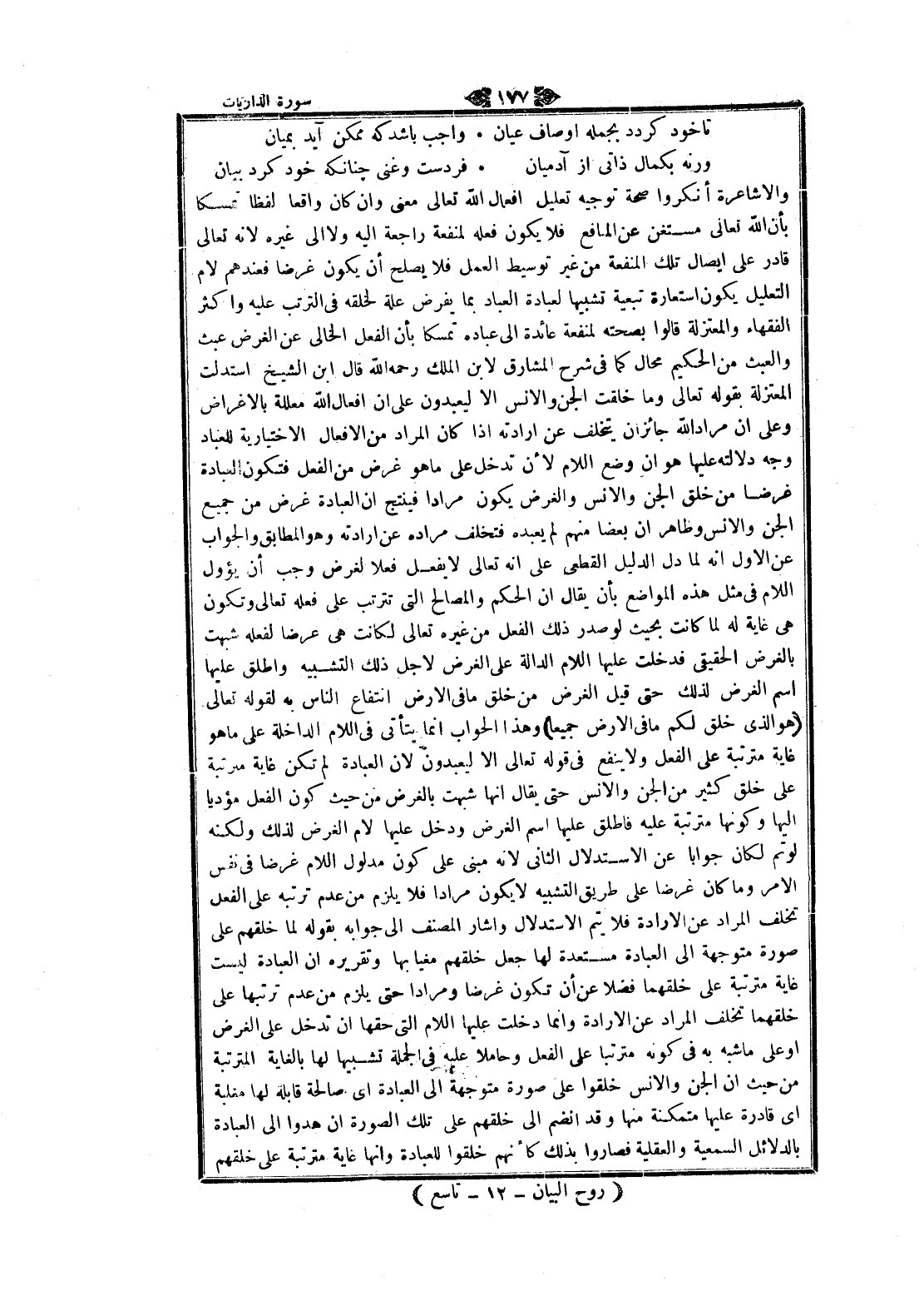 والاشاعرة أنكروا صحة توجيه تعليل افعال الله تعالى معنى وان كان واقعا لفظا تمسكا بأن الله تعالى مستغن عن المنافع فلا يكون فعله لمنفعة راجعة اليه ولا الى غيره لانه تعالى قادر على إيصال تلك المنفعة من غير توسيط العمل فلا يصلح أن يكون غرضا فعندهم لام التعليل يكون استعارة تبعية تشبيها لعبادة العباد بما يفرض علة لخلقه في الترتب عليه واكثر الفقهاء والمعتزلة قالوا بصحته لمنفعة عائدة الى عباده تمسكا بأن الفعل الخالي عن الغرض عبث والعبث من الحكيم محال كما في شرح المشارق لابن الملك رحمه الله قال ابن الشيخ استدلت المعتزلة بقوله تعالى وما خلقت الجن والانس الا ليعبدون على ان افعال الله معللة بالأغراض وعلى ان مراد الله جائزان يختلف عن إرادته إذا كان المراد من الافعال الاختيارية للعباد وجه دلالته عليها هو ان وضع اللام لأن تدخل على ما هو غرض من الفعل فتكون العبادة غرضا من خلق الجن والانس والغرض يكون مرادا فينتج ان العبادة عرض من جميع الجن والانس وظاهر ان بعضا منهم لم يعبده فتخلف مراده عن إرادته وهو المطابق والجواب عن الاول انه لما دل الدليل القطعي على انه تعالى لا يفعل فعلا لغرض وجب أن يؤول اللام في مثل هذه المواضع بأن يقال ان الحكم والمصالح التي تترتب على فعله تعالى وتكون هى غاية له لما كانت بحيث لو صدر ذلك الفعل من غيره تعالى لكانت هى عرضا لفعله شبهت بالغرض الحقيقي فدخلت عليها اللام الدالة على الغرض لاجل ذلك التشبيه واطلق عليها اسم الغرض لذلك حتى قيل الغرض من خلق ما في الأرض انتفاع الناس به لقوله تعالى هو الذي خلق لكم ما في الأرض جميعا وهذا الحوأب انما يتأتى في اللام الداخلة على ما هو غاية مترتبة على الفعل ولا ينفع في قوله تعالى الا ليعبدون لان العبادة لم تكن غاية مترتبة على خلق كثير من الجن والانس حتى يقال انها شبهت بالغرض من حيث كون الفعل مؤديا إليها وكونها مترتبة عليها فاطلق عليها اسم الغرض ودخل عليها لام الغرض لذلك ولكنه لوتم لكان جوابا عن الاستدلال الثاني لانه مبنى على كون مدلول اللام غرضا في نفس الأمر وما كان غرضا على طريق التشبيه لا يكون مرادا فلا يلزم من عدم ترتبه على الفعل تخلف المراد عن الارادة فلا يتم الاستدلال وأشار المصنف الى جوابه بقوله لما خلقهم على صورة متوجهة الى العبادة مستعدة لها جعل خلقهم مغيا بها وتقريره ان العبادة ليست غاية مترتبة على خلقهما فضلا عن أن تكون غرضا ومرادا حتى يلزم من عدم ترتبها على خلقهما تخلف المراد عن الارادة وانما دخلت عليها اللام التي حقها ان تدخل على الغرض او على ما شبه به في كونه مترتبا على الفعل وحاملا عليه في الجملة تشبيها لها بالغاية المترتبة من حيث ان الجن والانس خلقوا على صورة متوجهة الى العبادة اى صالحة قابلة لها مغلبة اى قادرة عليها متمكنة منها وقد انضم الى خلقهم على تلك الصورة ان هدوا الى العبادة بالدلائل السمعية والعقلية فصاروا بذلك كأنهم خلقوا للعبادة وانها غاية مترتبة على خلقهم