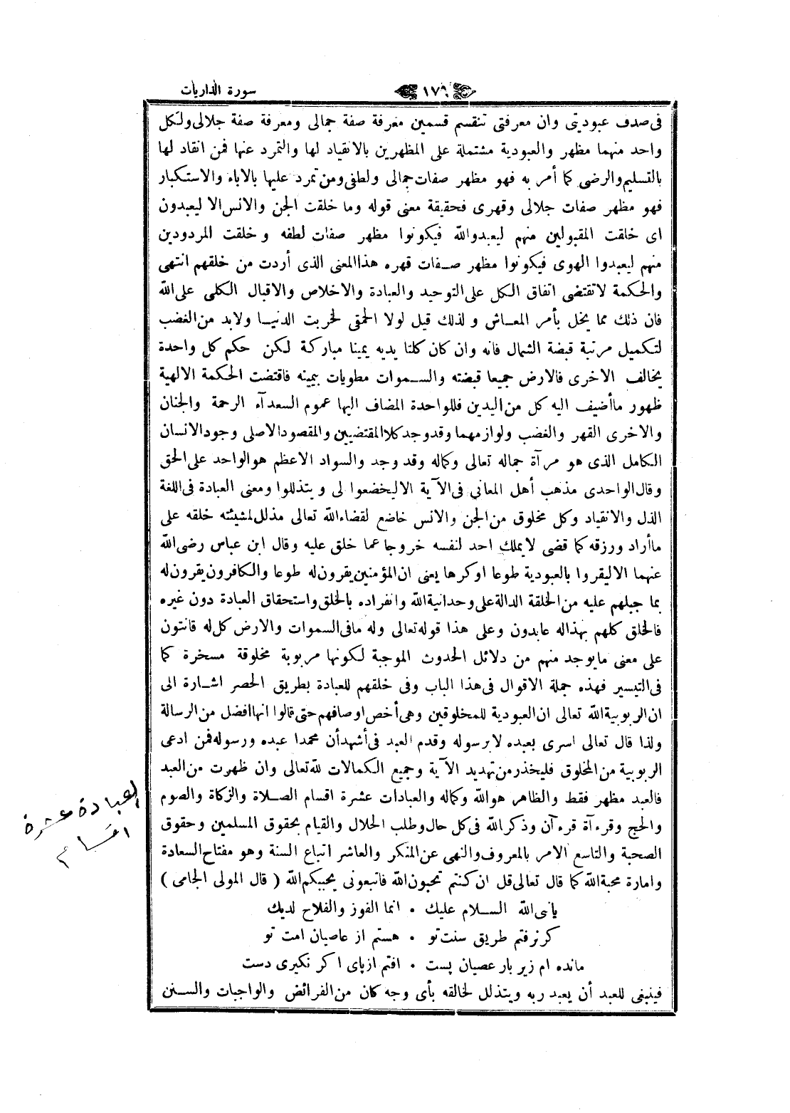جملة الأقوال في هذا الباب وفي خلقهم للعبادة بطريق الحصر اشارة الى ان الربوبية الله تعالى ان العبودية للمخلوقين وهى أخص اوصافهم حتى قالوا انها أفضل من الرسالة ولذا قال تعالى اسرى بعبده لا برسوله وقدم العبد في أشهد أن محمدا عبده ورسوله فمن ادعى الربوبية من المخلوق فليخذر من تهديد الآية وجميع الكمالات لله تعالى وان ظهرت من العبد فالعبد مظهر فقط والظاهر هو الله وكماله والعبادات عشرة اقسام الصلاة والزكاة والصوم والحج وقرءآة قرآن وذكر الله في كل حال وطلب الحلال والقيام بحقوق المسلمين وحقوق الصحبة والتاسع الأمر بالمعروف والنهى عن المنكر والعاشر اتباع السنة وهو مفتاح السعادة وامراة محبة الله كما قال تعالى قل ان كنتم تحبون الله فاتبعونى يحببكم الله (قال المولى الجامى)