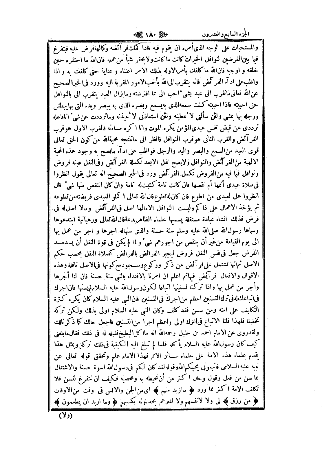 والمستحبات على الوجه الذي أمره ان يقوم فيه فاذا كملت فرآئضه وكمالها فرض عليه فيتفرغ فيما بين الفرضين لنوافل الخيرات كانت ما كانت ولا يحقر شيأ من عمله فان الله ما احتقره حين خلقه وأوجبه فان الله ما كلفك بأمر إلا وله بذلك الأمر اعتناء وعناية حتى كلفك به وإذا واظب على أداء الفرائض فانه يتقرب الى الله بأخب الأمور المقربة اليه وورد في الخبر الصحيح عن الله تعالى ما تقرب الى عبد بشيء أحب الى مما افترضته وما يزال العبد يتقرب الى بالنوافل حتى أحببته فاذا أحببته كنت سمعه الذي به يسمع وبصره الذي به يبصر ويده التي بها يبطش ورجله بها يمشى ولئن سألنى لأعطينه ولئن استعاذنى لأعيذنه وما ترددت عن شيء انا فاعله ترددى عن قبض نفس عبدى المؤمن يكره الموت وانا اكره مساءته فالقرب الاول هو قرب الفرائض والقرب الثاني هو قرب النوافل فانظر الى ما تنتجه محبة الله من كون الحق تعالى قوى العبد من السمع والبصر واليد والرجل فواظب على أداء ما يصح به وجود هذه المحبة الالهية من الفرائض والنوافل ولا يصح نفل الا بعد تكملة الفرائض وفي النفل عينه فروض ونوافل فيما فيه من الفروض تكمل الفرائض ورد في الخير الصحيح انه تعالى يقول انظروا فى صلاة عبدى أتمها أم نقصها فان كانت تامة كتبت له تامة وان كان انتقص منها شيء قال انظروا هل لعبدى من تطوع فان كان له تطوع قال الله تعالى اكملوا لعبدي فريضته من تطوعه ثم يؤخذ الأعمال على ذاكم وليست النوافل إلا ما لها اصل في الفرائض ومالا اصل له في فرض فذلك إنشاء عبادة مستقلة يسميها علماء الظاهر بدعة قال الله تعالى ورهبانية ابتدعوها وسماها رسول الله صلّى الله عليه وسلّم سنة حسنة والذي سنها له أجرها واجر من عمل بها الى يوم القيامة من غير أن ينقص من أجورهم شيء ولما لم يكن في قوة النفل أن يسد مسد الفرض جعل في نفس النفل فروض ليجبر الفرائض بالفرائض كصلاة النفل بحسب حكم الأصل ثم انها تشتمل على فرآئض من ذكر وركوع وسجود مع كونها في الأصل نافلة وهذه الأقوال والافعال فرآئض فيها ثم اعلم ان أمرنا بالاقتداء بالنبي سنة حسنة فان لنا أجرها وأجر من عمل بها وإذا تركنا تسنينها اتباعا لكون رسول الله عليه السلام لم يسنها فان أجرك فى اتباعك له في ترك التسنين أعظم من أجرك في التسنين فان النبي عليه السلام كان يكره كثرة التكليف على أمته ومن سن فقد كلف وكان النبي عليه السلام اولى بذلك ولكن تركه تخفيفا فلهذا قلنا الاتباع في الترك اولى وأعظم اجرا من التسنين فاجعل حالك كما ذكرنا لك ولقد روى عن الامام احمد بن حنبل رحمه الله انه ما أكل البطيخ فقيله له في ذلك فقال ما بلغني كيف كان رسول الله عليه السلام يأكله فلما لم تبلغ اليه الكيفية في ذلك تركه وبمثل هذا يقدم علماء هذه الامة على علماء سائر الأمم فهذا الامام علم وتحقق قوله تعالى عن نبيه عليه السلام فاتبعونى يحببكم الله وقوله لقد كان لكم في رسول الله أسوة حسنة والاشتغال بما سن من فعل وقول وحال اكثر من أن نحيطه به ونحصيه فكيف ان نتفرغ لنسن فلا تكلف الامة اكثر مما ورد ما أُرِيدُ مِنْهُمْ اى من الجن والانس في وقت من الأوقات مِنْ رِزْقٍ لى ولا لانفسهم ولا لغيرهم يحصلونه بكسبهم وَما أُرِيدُ أَنْ يُطْعِمُونِ