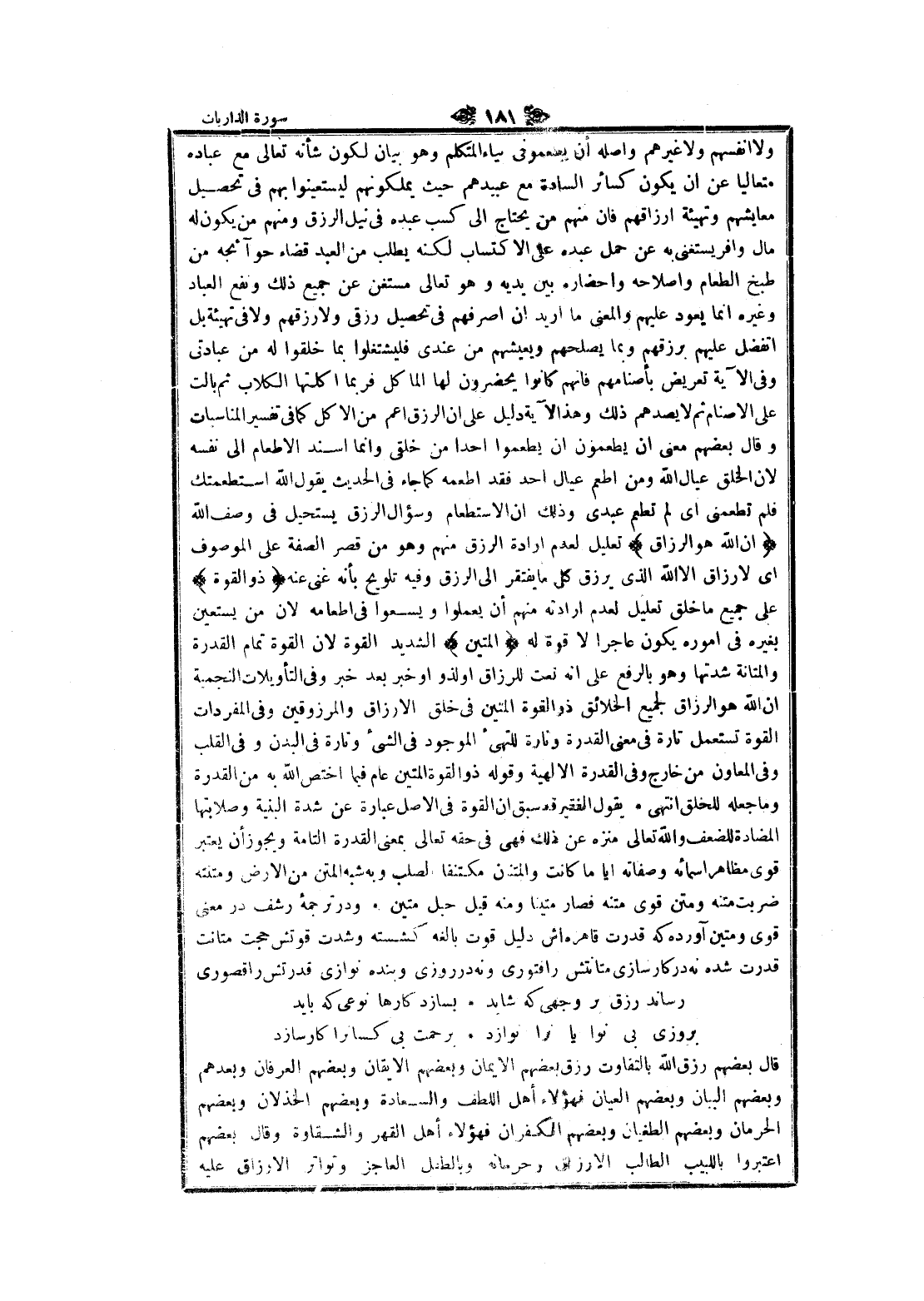 ولا أنفسهم ولا غيرهم وأصله أن يطعمونى بياء المتكلم وهو بيان لكون شأنه تعالى مع عباده متعاليا عن ان يكون كسائر السادة مع عبيدهم حيث يملكونهم ليستعينوا بهم في تحصيل معايشهم وتهيئة أرزاقهم فان منهم من يحتاج الى كسب عبده في نيل الرزق ومنهم من يكون له مال وافر يستغنى به عن حمل عبده على الاكتساب لكنه يطلب من العبد قضاء حوائجه من طبخ الطعام وإصلاحه واحضاره بين يديه وهو تعالى مستغن عن جميع ذلك ونفع العباد وغيره انما يعود عليهم والمعنى ما أريد ان اصرفهم في تحصيل رزقى ولا رزقهم ولا في تهيئة بل أتفضل عليهم برزقهم وبما يصلحهم ويعيشهم من عندى فليشتغلوا بما خلقوا له من عبادتى وفي الآية تعريض بأصنامهم فانهم كانوا يحضرون لها المآكل فربما اكلتها الكلاب ثم بالت على الأصنام ثم لا يصدهم ذلك وهذه الآية دليل على ان الرزق أعم من الاكل كما في تفسير المناسبات وقال بعضهم معنى ان يطعمون ان يطعموا أحدا من خلقى وانما أسند الإطعام الى نفسه لان الخلق عيال الله ومن اطعم عيال أحد فقد أطعمه كما جاء في الحديث يقول الله استطعمتك فلم تطعمنى اى لم تطعم عبدى وذلك ان الاستطعام وسؤال الرزق يستحيل في وصف الله إِنَّ اللَّهَ هُوَ الرَّزَّاقُ تعليل لعدم ارادة الرزق منهم وهو من قصر الصفة على الموصوف اى لا رزاق الا الله الذي يرزق كل ما يفتقر الى الرزق وفيه تلويح بأنه غنى عنه ذُو الْقُوَّةِ على جميع ما خلق تعليل لعدم إرادته منهم أن يعملوا ويسعوا في إطعامه لان من يستعين بغيره في أموره يكون عاجرا لا قوة له الْمَتِينُ الشديد القوة لان القوة تمام القدرة والمتانة شدتها وهو بالرفع على انه نعت للرزاق او لذو او خبر بعد خبر وفي التأويلات النجمية ان الله هو الرزاق لجميع الخلائق ذو القوة المتين في خلق الأرزاق والمرزوقين وفي المفردات القوة تستعمل تارة في معنى القدرة وتارة للتهئ الموجود في الشيء وتارة في البدن وفي القلب وفي المعاون من خارج وفي القدرة الالهية وقوله ذو القوة المتين عام فيما اختص الله به من القدرة وما جعله للخلق انتهى يقول الفقير قد سبق ان القوة في الأصل عبارة عن شدة البنية وصلابتها المضادة للضعف والله تعالى منزه عن ذلك فهى في حقه تعالى بمعنى القدرة التامة ويجوز أن يعتبر قوى مظاهر أسمائه وصفاته أيا ما كانت والمتنان مكتنفا الصلب وبه شبه المتن من الأرض ومتنته ضربت متنه ومتن قوى متنه فصار متينا ومنه قيل حبل متين ودر ترجمه رشف در معنى قوى ومتين آورده كه قدرت قاهره اش دليل قوت بالغه كشسته وشدت قوتش حجت متانت قدرت شده نه در كار سازى متانتش را فتورى ونه در روزى وبنده نوازى قدرتش را قصورى