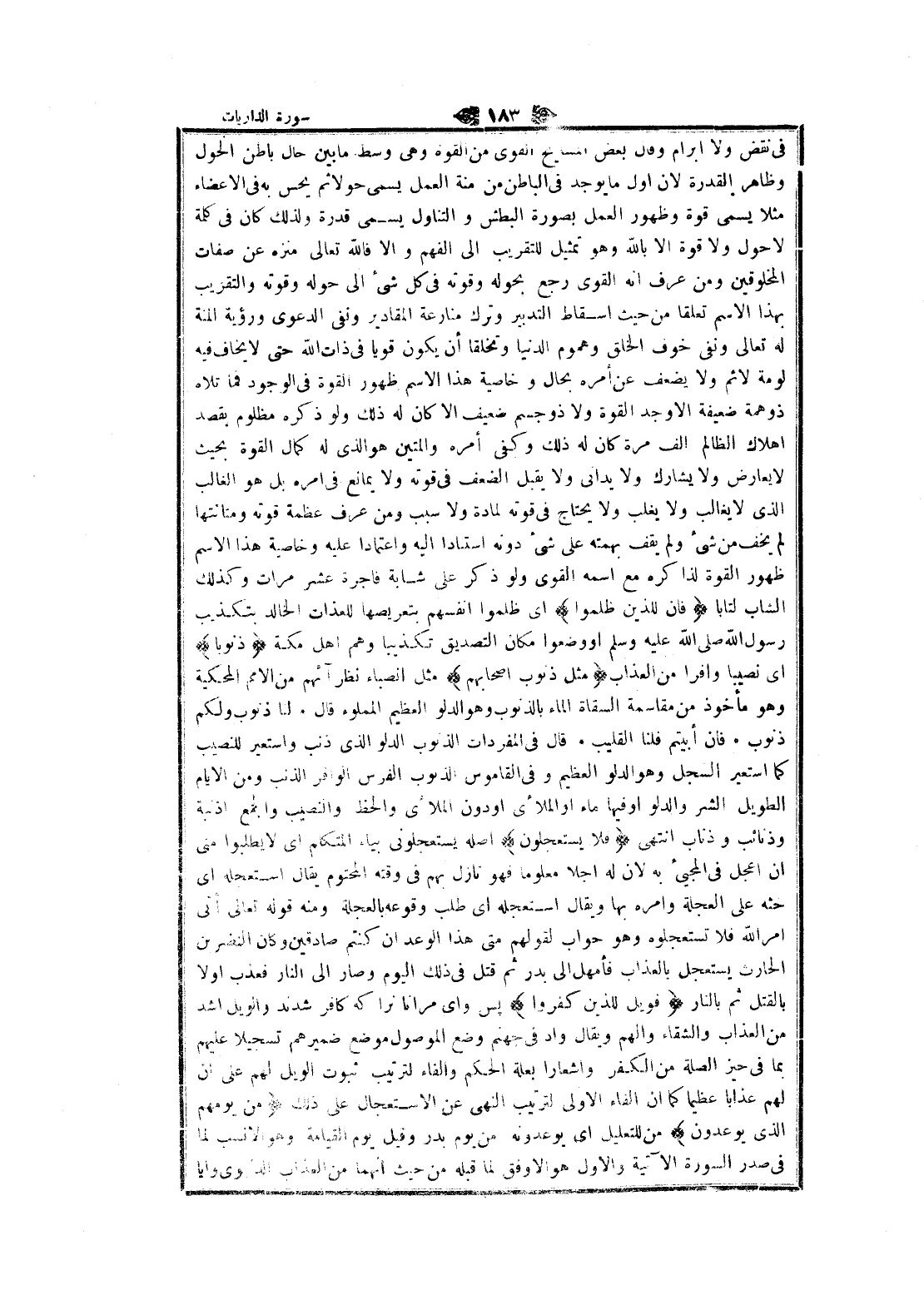 فى نقض ولا إبرام وقال بعض المشايخ القوى من القوة وهى وسط ما بين حال باطن الحول وظاهر القدرة لان أول ما يوجد في الباطن من منة العمل يسمى خولا ثم يحس به في الأعضاء مثلا يسمى قوة وظهور العمل بصورة البطش والتناول يسمى قدرة ولذلك كان في كلمة لا حول ولا قوة الا بالله وهو تمثيل للتقريب الى الفهم والا فالله تعالى منزه عن صفات المخلوقين ومن عرف انه القوى رجع بحوله وقوته في كل شيء الى حوله وقوته والتقريب بهذا الاسم تعلقا من حيث إسقاط التدبير وترك منازعة المقادير ونفى الدعوى ورؤية المنة له تعالى ونفى خوف الخلق وهموم الدنيا وتخلقا أن يكون قويا في ذات الله حتى لا يخاف فيه لومة لاثم ولا يضعف عن أمره بحال وخاصية هذا الاسم ظهور القوة في الوجود فما تلاه ذوهمة ضعيفة إلا وجد القوة ولا ذو جسم ضعيف الا كان له ذلك ولو ذكره مظلوم بقصد إهلاك الظالم الف مرة كان له ذلك وكفى أمره والمتين هو الذي له كمال القوة بحيث لا يعارض ولا يشارك ولا يدانى ولا يقبل الضعف في قوته ولا يمانع في امره بل هو الغالب الذي لا يغالب ولا يغلب ولا يحتاج في قوته لمادة ولا سبب ومن عرف عظمة قوته ومتانتها لم يخف من شيء ولم يقف بهمته على شيء دونه استنادا اليه واعتمادا عليه وخاصية هذا الاسم ظهور القوة لذاكره مع اسمه القوى ولو ذكر على شابة فاجرة عشر مرات وكذلك الشاب لتابا فَإِنَّ لِلَّذِينَ ظَلَمُوا اى ظلموا أنفسهم بتعريضها للعذات الخالد بتكذيب رسول الله صلّى الله عليه وسلّم او وضعوا مكان التصديق تكذيبا وهم اهل مكة ذَنُوباً اى نصيبا وافرا من العذاب مِثْلَ ذَنُوبِ أَصْحابِهِمْ مثل أنصباء نظرائهم من الأمم المحكية وهو مأخوذ من مقاسمة السقاة الماء بالذنوب وهو الدلو العظيم المملوء قال لنا ذنوب ولكم ذنوب فان أبيتم فلنا القليب قال في المفردات الذنوب الدلو الذي ذنب واستعير للنصيب كما استعير السجل وهو الدلو العظيم وفي القاموس الذنوب الفرس الوافر الذنب ومن الأيام الطويل الشر والدلو او فيها ماء او الملأى او دون الملأى والحظ والنصيب والجمع اذنبة وذنائب وذناب انتهى فَلا يَسْتَعْجِلُونِ أصله يستعجلونى بياء المتكلم اى لا يطلبوا منى ان اعجل في المجيء به لان له أجلا معلوما فهو نازل بهم في وقته المحتوم يقال استعجله اى حثه على العجلة وامره بها ويقال استعجله اى طلب وقوعه بالعجلة ومنه قوله تعالى أتى امر الله فلا تستعجلوه وهو جواب لقولهم متى هذا الوعد ان كنتم صادقين وكان النضر بن الحارث يستعجل بالعذاب فأمهل الى بدر ثم قتل في ذلك اليوم وصار الى النار فعذب اولا بالقتل ثم بالنار فَوَيْلٌ لِلَّذِينَ كَفَرُوا پس واى مر آنان را كه كافر شدند والويل أشد من العذاب والشقاء والهم ويقال واد في جهنم وضع الموصول موضع ضميرهم تسجيلا عليهم بما في حيز الصلة من الكفر واشعارا بعلة الحكم والفاء لترتيب ثبوت الويل لهم على ان لهم عذابا عظيما كما ان الفاء الاولى لترتيب النهى عن الاستعجال على ذلك مِنْ يَوْمِهِمُ الَّذِي يُوعَدُونَ من للتعليل اى يوعدونه من يوم بدر وقيل يوم القيامة وهو الأنسب لما فى صدر السورة الآتية والاول هو الأوفق لما قبله من حيث انهما من العذاب الدنيوي وأيا