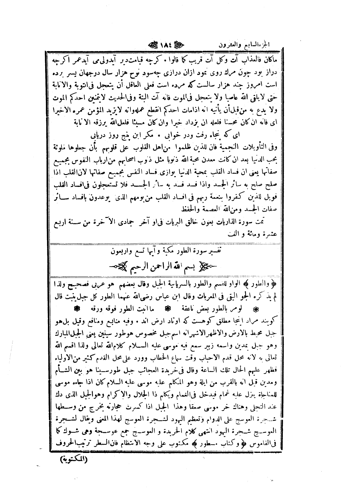 وَالطُّورِ الواو للقسم والطور بالسريانية الجبل وقال بعضهم هو عربى فصحيح ولذا لم يذكره الجواليقي في المعربات وقال ابن عباس رضى الله عنهما الطور كل جبل ينبت قال