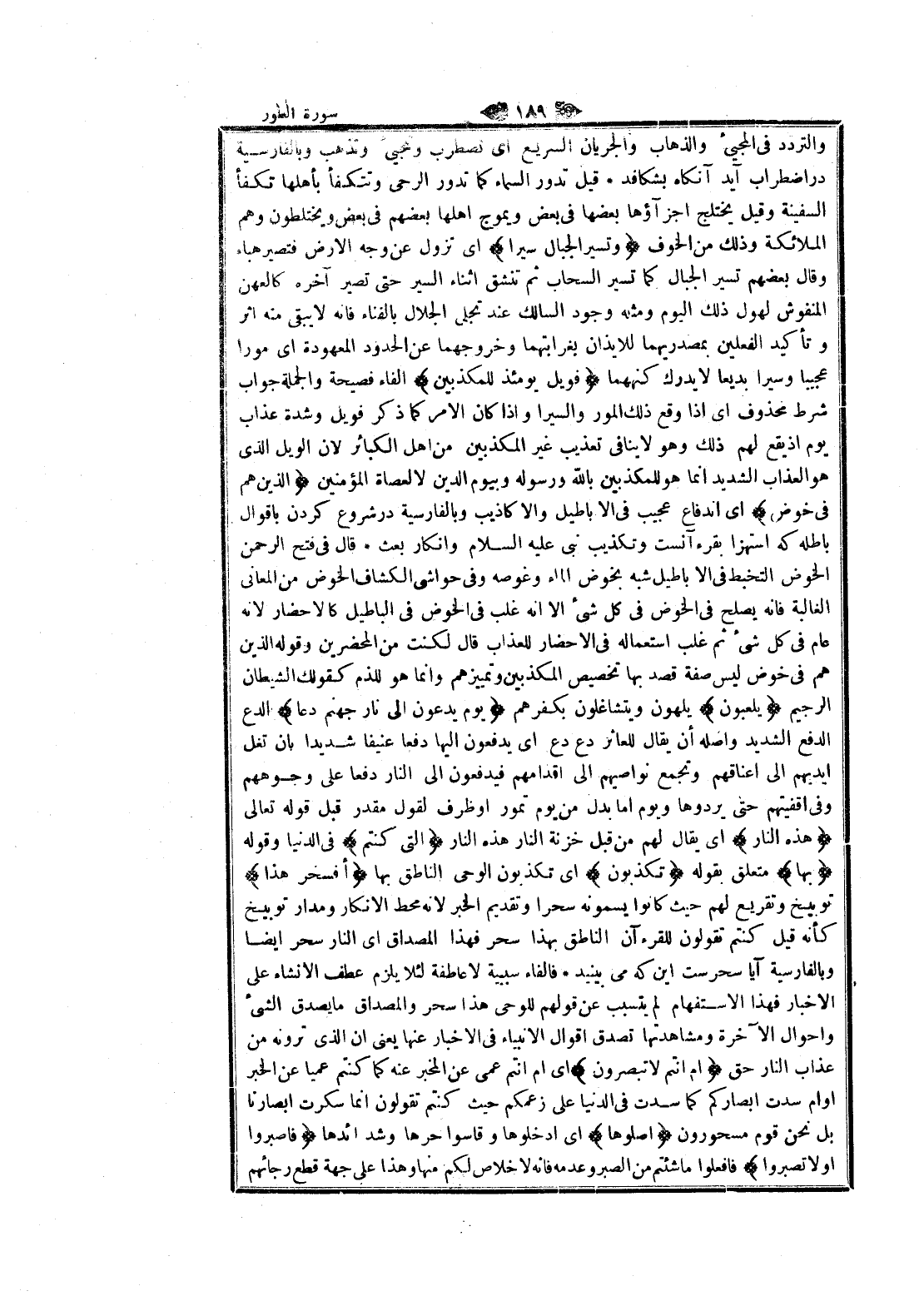 والتردد في المجيء والذهاب والجريان السريع اى تضطرب وتجيئ وتذهب وبالفارسية در اضطراب آيد آنگاه بشكافد قيل تدور السماء كما تدور الرحى وتتكفأ بأهلها تكفأ السفينة وقيل يختلج اجزاؤها بعضها في بعض ويموج أهلها بعضهم في بعض ويختلطون وهم الملائكة وذلك من الخوف وَتَسِيرُ الْجِبالُ سَيْراً اى تزول عن وجه الأرض فتصير هباء وقال بعضهم تسير الجبال كما تسير السحاب ثم تنشق أثناء السير حتى تصير آخره كالعهن المنفوش لهول ذلك اليوم ومثله وجود السالك عند تجلى الجلال بالفناء فانه لا يبقى منه اثر وتأكيد الفعلين بمصدريهما للايذان بغرابتهما وخروجهما عن الحدود المعهودة اى مورا عجيبا وسيرا بديعا لا يدرك كنههما فَوَيْلٌ يَوْمَئِذٍ لِلْمُكَذِّبِينَ الفاء فصيحة والجملة جواب شرط محذوف اى إذا وقع ذلك المور والسيرا وإذا كان الأمر كما ذكر فويل وشدة عذاب يوم إذ يقع لهم ذلك وهو لا ينافى تعذيب غير المكذبين من اهل الكبائر لان الويل الذي هو العذاب الشديد انما هو للمكذبين بالله ورسوله وبيوم الدين لا لعصاة المؤمنين الَّذِينَ هُمْ فِي خَوْضٍ اى اندفاع عجيب في الأباطيل والأكاذيب وبالفارسية در شروع كردن بأقوال باطله كه استهزا بقرآنست وتكذيب نبى عليه السلام وانكار بعث قال في فتح الرحمن الخوض التخبط في الأباطيل شبه بخوض الماء وغوصه وفي حواشى الكشاف الخوض من المعاني الغالبة فانه يصلح في الخوض في كل شيء الا انه غلب في الخوض في الباطيل كالاحضار لانه عام في كل شيء ثم غلب استعماله في الإحضار للعذاب قال لكنت من المحضرين وقوله الذين هم في خوض ليس صفة قصد بها تخصيص المكذبين وتمييزهم وانما هو للذم كقولك الشيطان الرجيم يَلْعَبُونَ يلهون ويتشاغلون بكفرهم يَوْمَ يُدَعُّونَ إِلى نارِ جَهَنَّمَ دَعًّا الدع الدفع الشديد وأصله أن يقال للعاثر دع دع اى يدفعون إليها دفعا عنيفا شديدا بان تغل أيديهم الى أعناقهم وتجمع نواصيهم الى أقدامهم فيدفعون الى النار دفعا على وجوههم وفي أقفيتهم حتى يردوها ويوم اما بدل من يوم تمور او ظرف لقول مقدر قبل قوله تعالى هذِهِ النَّارُ اى يقال لهم من قبل خزنة النار هذه النار الَّتِي كُنْتُمْ فى الدنيا وقوله بِها متعلق بقوله تُكَذِّبُونَ اى تكذبون الوحى الناطق بها أَفَسِحْرٌ هذا توبيخ وتقريع لهم حيث كانوا يسمونه سحرا وتقديم الخبر لانه محط الإنكار ومدار توبيخ كأنه قيل كنتم تقولون للقرءآن الناطق بهذا سحر فهذا المصداق اى النار سحر ايضا وبالفارسية آيا سحرست اين كه مى بينيد فالفاء سببية لا عاطفة لئلا يلزم عطف الإنشاء على الاخبار فهذا الاستفهام لم يتسبب عن قولهم للوحى هذا سحر والمصداق ما يصدق الشيء واحوال الآخرة ومشاهدتها تصدق اقوال الأنبياء في الاخبار عنها يعنى ان الذي ترونه من عذاب النار حق أَمْ أَنْتُمْ لا تُبْصِرُونَ اى أم أنتم عمى عن المخبر عنه كما كنتم عميا عن الخبر او أم سدت أبصاركم كما سدت في الدنيا على زعمكم حيث كنتم تقولون انما سكرت أبصارنا بل نحن قوم مسحورون اصْلَوْها اى ادخلوها وقاسوا حرها وشدائدها فَاصْبِرُوا أَوْ لا تَصْبِرُوا فافعلوا ما شئتم من الصبر وعدمه فانه لا خلاص لكم منها وهذا على جهة قطع رجائهم