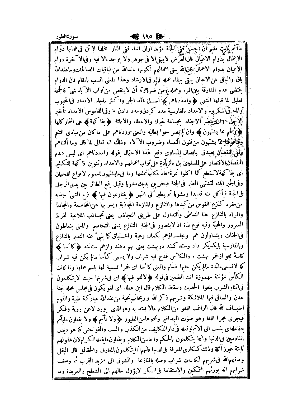 دائم ثابت مقيم ان احسن ففى الجنة مؤيد او ان أساء ففى النار مخلدا لائن في الدنيا دوام الأعمال بدوام الأعيان فان العرض لا يبقى الا في جوهر ولا يوجد الا فيه وفي الآخرة دوام الأعيان بدوام الأعمال فان الله يبقى أعمالهم لكونها عند الله من الباقيات الصالحات وما عند الله باق والباقي من الأعيان يبقى ببقاء عمله قال في الإرشاد وهذا المعنى انسب بالمقام فان الدوام يقتضى عدم المفارقة بين المرء وعمله ومن ضرورته أن لا ينقص من ثواب الآباء شيء فالجملة تعليل لما قبلها انتهى وَأَمْدَدْناهُمْ اصل المد الجر واكثر ما جاء الامداد في المحبوب والمد في المكروه والامداد بالفارسية مدد كردن ومدد دادن وفي القاموس الامداد تأخير الاجل وان تنصر الأجناد بجماعة غيرك والإعطاء والاغاثة بِفاكِهَةٍ هى الثمار كلها وَلَحْمٍ مِمَّا يَشْتَهُونَ وان لم يصر حوا بطلبه والمعنى وزدناهم على ما كان من مبادى التنعم وقتا فوقتا مما يشتهون من فنون النعماء وضروب الآلاء وذلك انه تعالى لما قال وما ألتناهم ونفى النقصان يصدق بايصال المساوى دفع هذا الاحتمال بقوله وأمددناهم اى ليس عدم النقصان بالاقتصار على المساوى بل بالزيادة على ثواب أعمالهم والامداد وتنوين فاكهة للتكثير اى بفاكهة لا تنقطع كلما أكلوا ثمرة عاد مكانها مثلها وما في ما يشتهون للعموم لانواع اللحمان وفي الحبر انك لتشتهى الطير في الجنة فيخربين يديك مشويا وقيل يقع الطائر بين يدى الرجل فى الجنة فيأكل منه قديدا ومشويا ثم يطير الى النهر يَتَنازَعُونَ فِيها نزع الشيء جذبه من مقره كنزع القوس من كبدها والتنازع والمنازعة المجاذبة ويعبر بها عن المخاصمة والمجادلة والمراد بالتنازع هنا التعاطي والتداول على طريق التجاذب يعنى تجاذب الملاعبة لفرط السرور والمحبة وفيه نوع لذة إذ لا يتصور في الجنة التنازع بمعنى التخاصم والمعنى يتعاطون فى الجنات ويتداولون هم وجلساؤهم بكمال رغبة واشتياق كما ينبئ عنه التعبير بالتنازع وبالفارسية با يكديكر داد وستد كنند در بهشت يعنى بهم دهند واز هم ستانند كَأْساً كاسه مملو از خمر بهشت والكأس قدح فيه شراب ولا يسمى كأسا ما لم يكن فيه شراب كما لا تسمى مائدة ما لم يكن عليها طعام والمعنى كأسا اى خمرا تسمية لها باسم محلها ولما كانت الكأس مؤنثة مهموزة انث الضمير في قوله لا لَغْوٌ فِيها اى في شربها حيث لا يتكلمون فى أثناء الشرب بلغوا الحديث وسقط الكلام قال ابن عطاء اى لغو يكون في مجلس محله جنة عدن والساقي فيها الملائكة وشربهم ذكر الله وريحانهم تحية من عند الله مباركة طيبة والقوم أضياف الله قال الراغب اللغو من الكلام مالا يعتد به وهو الذي يورد لاعن روية وفكر فيجرى مجرا اللغا وهو صوت العصافير ونحوها من الطيور وَلا تَأْثِيمٌ ولا يفعلون ما يأثم به فاعله اى ينسب الى الإثم لو فعله في دار التكليف من الكذب والسب والفواحش كما هو ديدن المنادمين في الدنيا وانما يتكلمون بالحكم وأحاسن الكلام ويفعلون ما يفعله الكرام لان عقولهم ثابتة غير زائلة وذلك كسكارى المعرفة في الدنيا فانهم انما يتكلمون بالمعارف والحقائق قال البقلى وصفهم الله في شربهم لكاسات شراب وصله بالمنازعة والشوق الى مزيد القرب ثم وصف شرابهم انه يورثهم التمكين والاستقامة في السكر لا يؤول حالهم الى الشطح والعربدة وما