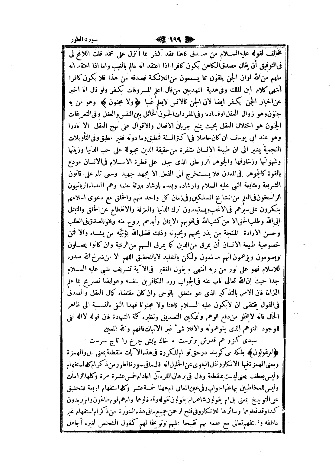 مخالف لقوله عليه السلام من صدق كاهنا فقد كفر بما أنزل على محمد قلت اللائح لى فى التوفيق أن يقال مصدق الكاهن يكون كافرا إذا اعتقد انه عالم بالغيب واما إذا اعتقد انه ملهم من الله أوان الجن يلقون مما يسمعون من الملائكة فصدقه من هذا فلا يكون كافرا انتهى كلام ابن الملك وفي هدية المهديين من قال اعلم المسروقات يكفر ولو قال انا اخبر عن اخبار الجن يكفر ايضا لان الجن كالانس لا يعلم غيبا وَلا مَجْنُونٍ وهو من به جنون وهو زوال العقل او فساده وفي المفردات الجنون الحائل بين النفس والعقل وفي التعريفات الجنون هو اختلال العقل بحيث يمنع جريان الافعال والأقوال على نهج العقل الا نادرا وهو عند ابى يوسف ان كان حاصلا في اكثر السنة فمطبق وما دونه فغير مطبق وفي التأويلات النجمية يشير الى ان طبيعة الإنسان متنفرة من حقيقة الدين مجبولة على حب الدنيا وزينتها وشهواتها وزخارفها والجوهر الروحاني الذي جبل على فطرة الإسلام في الإنسان مودع بالقوة كالجوهر في المعدن فلا يستخرج الى الفعل الا يجهد جهيد وسعى تام على قانون الشريعة ومتابعة النبي عليه السلام وإرشاده وبعده بإرشاد ورثة علمه وهم العلماء الربانيون الراسخون في العلم من المشايخ المسلكين وفي زمان كل واحد منهم والخلق مع دعوى إسلامهم ينكرون على سيرهم في الأغلب ويستبعدون ترك الدنيا والعزلة والانقطاع عن الخلق والتبتل الى الله وطلب الحق الا من كتب الله في قلوبهم الايمان وأيدهم بروح منه وهو الصدق في الطلب وحسن الارادة المنتجة من بذر يحبهم ويحبونهم وذلك فضل الله يؤتيه من يشاء والا فمن خصوصية طبيعة الإنسان أن يمرق من الدين كما يمرق السهم من الرمية وان كانوا يصلون ويصومون وبزعمون انهم مسلمون ولكن بالتقليد لا بالتحقيق اللهم الا من شرح الله صدره للاسلام فهو على نور من ربه انتهى يقول الفقير في الآية تشريف للنبى عليه السلام جدا حيث ان الله تعالى ناب عنه في الجواب ورد الكافرين بنفسه وهو ايضا تصريح بما علم التزاما فان الأمر بالتذكير الذي هو متعلق بالوحى وان كان مقتضاء كمال العقل والصدق فى القول يقتضى ان لا يكون عليه السلام كاهنا ولا مجنونا فهذا النفي بالنسبة الى ظاهر الحال فانه لا يخلو من دفع الوهم وتمكين التصديق ونظيره كلمة الشهادة فان قوله لا اله نفى للوجود المتوهم الذي يتوهمونه والا فلا شيء غير الإثبات فافهم والله المعين