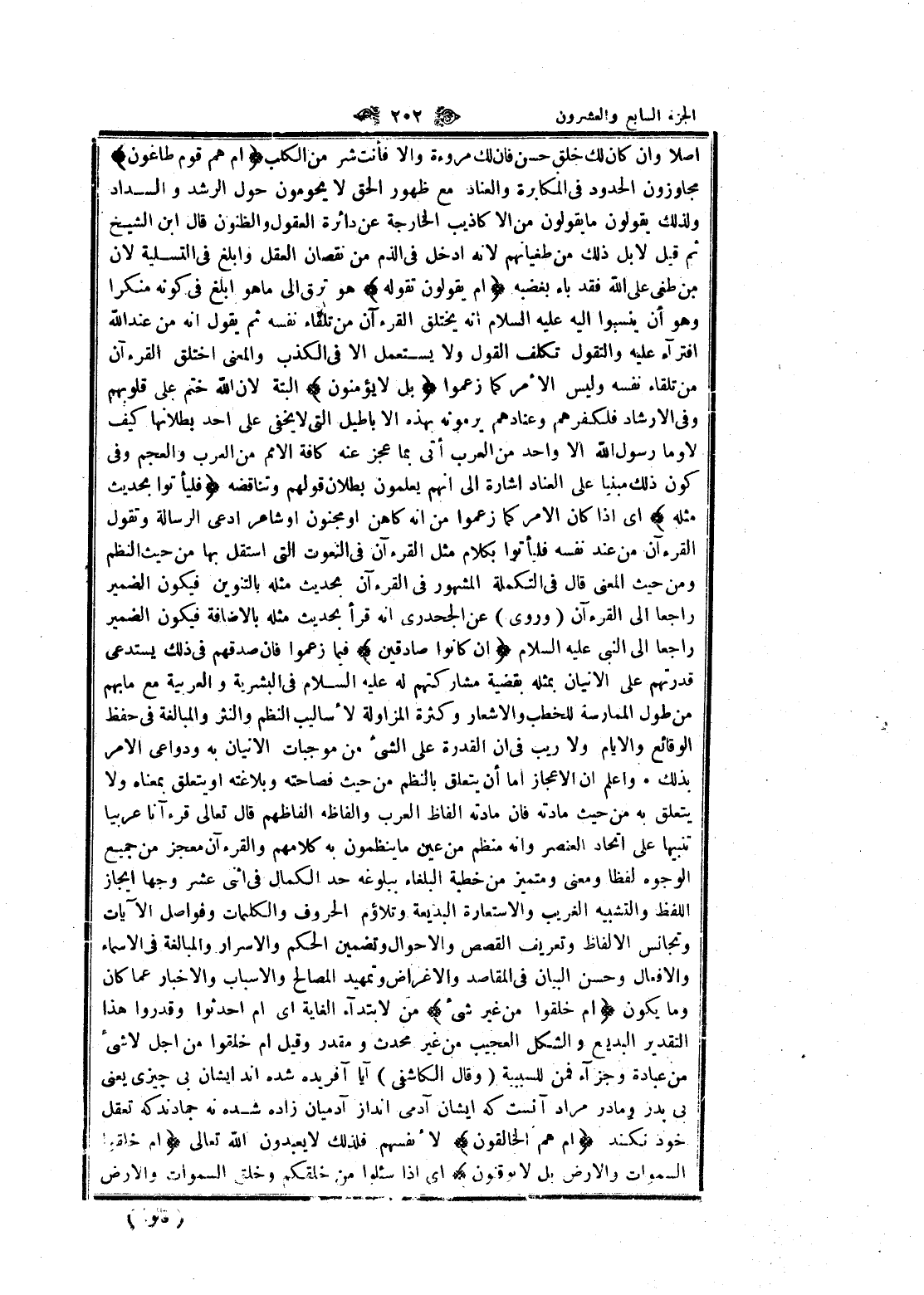 أصلا وان كان لك خلق حسن فان لك مروءة والا فأنت شر من الكلب أَمْ هُمْ قَوْمٌ طاغُونَ مجاوزون الحدود في المكابرة والعناد مع ظهور الحق لا يحومون حول الرشد والسداد ولذلك يقولون ما يقولون من الا كاذيب الخارجة عن دائرة العقول والظنون قال ابن الشيخ ثم قيل لابل ذلك من طغيانهم لانه ادخل في الذم من نقصان العقل وابلغ في التسلية لان من طغى على الله فقد باء بغضبه أَمْ يَقُولُونَ تَقَوَّلَهُ هو ترق الى ما هو ابلغ في كونه منكرا وهو أن ينسبوا اليه عليه السلام انه يختلق القرآن من تلقاء نفسه ثم يقول انه من عند الله افتراء عليه والتقول تكلف القول ولا يستعمل الا في الكذب والمعنى اختلق القرآن من تلقاء نفسه وليس الأمر كما زعموا بَلْ لا يُؤْمِنُونَ البتة لان الله ختم على قلوبهم وفي الإرشاد فلكفرهم وعنادهم يرمونه بهذه الأباطيل التي لا يخفى على أحد بطلانها كيف لا وما رسول الله الا واحد من العرب أتى بما عجز عنه كافة الأمم من العرب والعجم وفي كون ذلك مبنيا على العناد اشارة الى انهم يعلمون بطلان قولهم وتناقضه فَلْيَأْتُوا بِحَدِيثٍ مِثْلِهِ اى إذا كان الأمر كما زعموا من انه كاهن او مجنون او شاعر ادعى الرسالة وتقول القرآن من عند نفسه فليأتوا بكلام مثل القرآن في النعوت التي استقل بها من حيث النظم ومن حيث المعنى قال في التكملة المشهور في القرآن بحديث مثله بالتنوين فيكون الضمير راجعا الى القرآن (وروى) عن الجحدري انه قرأ بحديث مثله بالاضافة فيكون الضمير راجعا الى النبي عليه السلام إِنْ كانُوا صادِقِينَ فيما زعموا فان صدقهم في ذلك يستدعى قدرتهم على الإتيان بمثله بقضية مشاركتهم له عليه السلام في البشرية والعربية مع ما بهم من طول الممارسة للخطب والاشعار وكثرة المزاولة لأساليب النظم والنثر والمبالغة في حفظ الوقائع والأيام ولا ريب في ان القدرة على الشيء من موجبات الإتيان به ودواعى الأمر بذلك واعلم ان الاعجاز اما أن يتعلق بالنظم من حيث فصاحته وبلاغته او يتعلق بمعناه ولا يتعلق به من حيث مادته فان مادته ألفاظ العرب وألفاظه ألفاظهم قال تعالى قرءانا عربيا تنبيها على اتحاد العنصر وانه منظم من عين ما ينظمون به كلامهم والقرآن معجز من جميع الوجوه لفظا ومعنى ومتميز من خطبة البلغاء ببلوغه حد الكمال في اثنى عشر وجها إيجاز اللفظ والتشبيه الغريب والاستعارة البديعة وتلاؤم الحروف والكلمات وفواصل الآيات وتجانس الألفاظ وتعريف القصص والأحوال وتضمين الحكم والاسرار والمبالغة في الأسماء والافعال وحسن البيان في المقاصد والأغراض وتمهيد المصالح والأسباب والاخبار عما كان وما يكون أَمْ خُلِقُوا مِنْ غَيْرِ شَيْءٍ من لابتداء الغاية اى أم أحدثوا وقدروا هذا التقدير البديع والشكل العجيب من غير محدث ومقدر وقيل أم خلقوا من أجل لا شيء من عبادة وجزاء فمن للسببية (وقال الكاشفى) آيا آفريده شده اند ايشان بى چيزى يعنى بي پدر ومادر مراد آنست كه ايشان آدمي انداز آدميان زاده شده نه جمادند كه تعقل خود نكند أَمْ هُمُ الْخالِقُونَ لأنفسهم فلذلك لا يعبدون الله تعالى أَمْ خَلَقُوا السَّماواتِ وَالْأَرْضَ بَلْ لا يُوقِنُونَ اى إذا سئلوا من خلقكم وخلق السموات والأرض