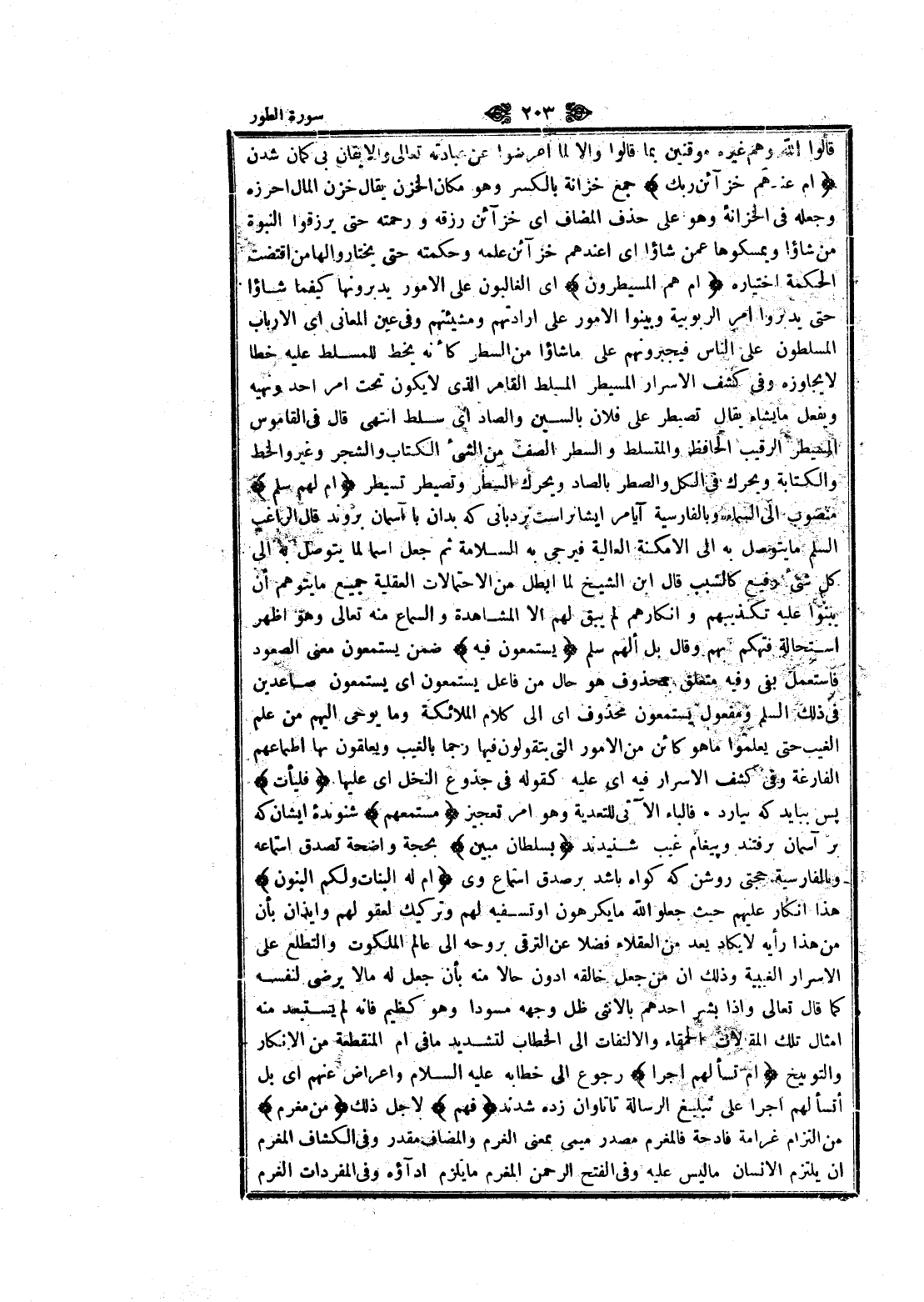 قالوا الله وهم غيره موقنين بما قالوا والا لما اعرضوا عن عبادته تعالى والإيقان بي كمان شدن أَمْ عِنْدَهُمْ خَزائِنُ رَبِّكَ جمع خزانة بالكسر وهو مكان الخزن يقال خزن المال احرزه وجعله في الخزانة وهو على حذف المضاف اى خزآئن رزقه ورحمته حتى يرزقوا النبوة من شاؤا ويمسكوها عمن شاؤا اى أعندهم خزآئن علمه وحكمته حتى يختاروا لها من اقتضت الحكمة اختياره أَمْ هُمُ الْمُصَيْطِرُونَ اى الغالبون على الأمور يدبرونها كيفما شاؤا حتى يدبروا امر الربوبية وبينوا الأمور على إرادتهم ومشيئتهم وفي عين المعاني اى الأرباب المسلطون على الناس فيجبرونهم على ما شاؤا من السطر كأنه يخط للمسلط عليه خطا لا يجاوزه وفي كشف الاسرار المسيطر المسلط القاهر الذي لا يكون تحت امر أحد ونهيه ويفعل ما يشاء يقال تصيطر على فلان بالسين والصاد اى سلط انتهى قال في القاموس المسيطر الرقيب الحافظ والمتسلط والسطر الصف من الشيء الكتاب والشجر وغير والخط والكتابة ويحرك في الكل والصطر بالصاد ويحرك السطر وتصيطر تسيطر أَمْ لَهُمْ سُلَّمٌ منصوب الى السماء وبالفارسية آيا مر ايشانراست نردبانى كه بدان با آسمان بروند قال الراغب السلم ما يتوصل به الى الامكنة العالية فيرجى به السلامة ثم جعل اسما لما يتوصل به الى كل شيء رفيع كالسبب قال ابن الشيخ لما أبطل من الاحتمالات العقلية جميع ما يتوهم أن يبنوا عليه تكذيبهم وانكارهم لم يبق لهم الا المشاهدة والسماع منه تعالى وهو اظهر استحالة فتهكم بهم وقال بل ألهم سلم يَسْتَمِعُونَ فِيهِ ضمن يستمعون معنى الصعود فاستعمل بفي وفيه متعلق بمحذوف هو حال من فاعل يستمعون اى يستمعون صاعدين فى ذلك السلم ومفعول يستمعون محذوف اى الى كلام الملائكة وما يوحى إليهم من علم الغيب حتى يعلموا ما هو كائن من الأمور التي يتقولون فيها رجما بالغيب ويعلقون بها اطماعهم الفارغة وفي كشف الاسرار فيه اى عليه كقوله في جذوع النخل اى عليها فَلْيَأْتِ پس ببايد كه بيارد فالباء الآتي للتعدية وهو امر تعجيز مُسْتَمِعُهُمْ شنونده ايشان كه بر آسمان برفتند و پيغام غيب شنيدند بِسُلْطانٍ مُبِينٍ بحجة واضحة تصدق استماعه وبالفارسية حجتى روشن كه كواه باشد بر صدق استماع وى أَمْ لَهُ الْبَناتُ وَلَكُمُ الْبَنُونَ هذا انكار عليهم حيث جعلو الله ما يكرهون او تسفيه لهم وتركيك لعقولهم وإيذان بأن من هذا رأيه لا يكاد يعد من العقلاء فضلا عن الترقي بروحه الى عالم الملكوت والتطلع على الاسرار الغيبية وذلك ان من جعل خالقه أدون حالا منه بأن جعل له مالا يرضى لنفسه كما قال تعالى وإذا بشر أحدهم بالأنثى ظل وجهه مسودا وهو كظيم فانه لم يستبعد منه أمثال تلك المقالات الحمقاء والالتفات الى الخطاب لتشديد ما في أم المنقطعة من الإنكار والتوبيخ أَمْ تَسْئَلُهُمْ أَجْراً رجوع الى خطابه عليه السلام واعراض عنهم اى بل أتسألهم اجرا على تبليغ الرسالة تا تاوان زده شدند فَهُمْ لاجل ذلك مِنْ مَغْرَمٍ من التزام غرامة فادحة فالمغرم مصدر ميمى بمعنى الغرم والمضاف مقدر وفي الكشاف المغرم ان يلتزم الإنسان ما ليس عليه وفي الفتح الرحمن المغرم ما يلزم أداؤه وفي المفردات الغرم