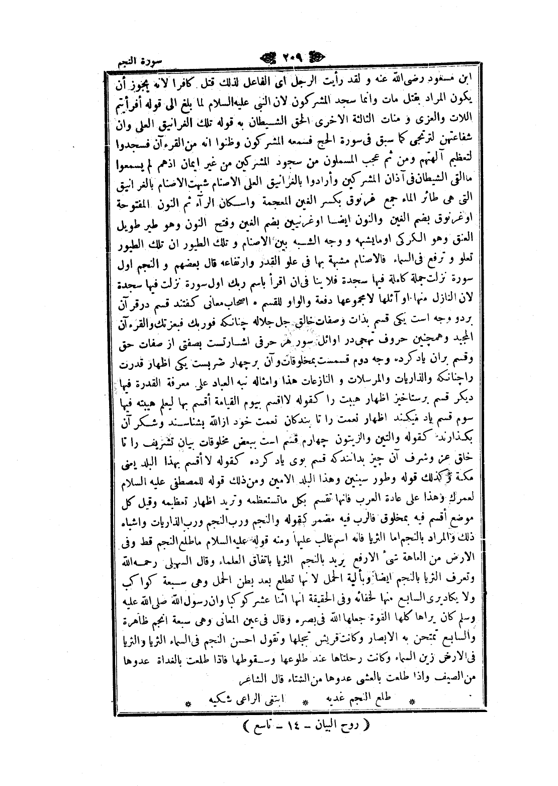 ابن مسعود رضى الله عنه ولقد رأيت الرجل اى الفاعل لذلك قتل كافرا لانه يجوز أن يكون المراد بقتل مات وانما سجد المشركون لان النبي عليه السلام لما بلغ الى قوله أفرأيتم اللات والعزى ومنات الثالثة الاخرى الحق الشيطان به قوله تلك الغرانيق العلى وان شفاعتهن لترتجى كما سبق في سورة الحج فسمعه المشركون وظنوا انه من القرآن فسجدوا لتعظيم آلهتهم ومن ثم عجب المسلمون من سجود المشركين من غير ايمان إذ هم لم يسمعوا ما القى الشيطان في آذان المشركين وأرادوا بالغرانيق العلى الأصنام شبهت الأصنام بالغرانيق التي هى طائر الماء جمع غرنوق بكسر الغين المعجمة واسكان الراء ثم النون المفتوحة او غرنوق بضم الغين والنون ايضا او غرنيين بضم الغين وفتح النون وهو طير طويل العنق وهو الكركي او ما يشبهه ووجه الشبه بين الأصنام وتلك الطيور ان تلك الطيور تعلو وترفع في السماء فالاصنام مشبهة بها في علو القدر وارتفاعه قال بعضهم والنجم أول سورة نزلت جملة كاملة فيها سجدة فلا ينافي ان اقرأ باسم ربك أول سورة نزلت فيها سجدة لان النازل منها او آئلها لا مجموعها دفعة والواو للقسم اصحاب معانى كفتند قسم در قرآن بر دو وجه است يكى قسم بذات وصفات خالق جل جلاله چنانكه فو ربك فبعزتك والقرآن المجيد وهمچنين حروف تهجى در أوائل سور هر حرفى اشارتست بصفتى از صفات حق وقسم بر ان ياد كرده وجه دوم قسمست بمخلوقات وآن بر چهار ضربست يكى اظهار قدرت را چنانكه والذاريات والمرسلات والنازعات هذا وأمثاله نبه العباد على معرفة القدرة فيها ديكر قسم برستاخيز اظهار هيبت را كقوله لا اقسم بيوم القيامة أقسم بها ليعلم هيبته فيها سوم قسم ياد ميكند اظهار نعمت را تا بندگان نعمت خود از الله بشناسند وشكر آن بگذارند كقوله والتين والزيتون چهارم قسم است ببعض مخلوقات بيان تشريف را تا خلق عز وشرف آن چيز بدانند كه قسم بوى ياد كرده كقوله لا أقسم بهذا البلد يعنى مكة وكذلك قوله وطور سينين وهذا البلد الامين ومن ذلك قوله للمصطفى عليه السلام لعمرك وهذا على عادة العرب فانها تقسم بكل ما تستعظمه وتريد اظهار تعظيمه وقيل كل موضع أقسم فيه بمخلوق فالرب فيه مضمر كقوله والنجم ورب النجم ورب الذاريات وأشباه ذلك والمراد بالنجم اما الثريا فانه اسم غالب عليها ومنه قوله عليه السلام ما طلع النجم قط وفي الأرض من العاهة شيء إلا رفع يريد بالنجم الثريا باتفاق العلماء وقال السهيلي رحمه الله وتعرف الثريا بالنجم ايضا وبألية الحمل لانها تطلع بعد بطن الحمل وهى سبعة كواكب ولا يكاد يرى السابع منها لخفائه وفي الحقيقة انها اثنا عشر كوكبا وان رسول الله صلّى الله عليه وسلم كان يراها كلها القوة جعلها الله في بصره وقال في عين المعاني وهى سبعة أنجم ظاهرة والسابع تمتحن به الابصار وكانت قريش تبجلها وتقول احسن النجم في السماء الثريا والثريا فى الأرض زين السماء وكانت رحلتاها عند طلوعها وسقوطها فاذا طلعت بالغداة عدوها من الصيف وإذا طلعت بالعشي عدوها من الشتاء قال الشاعر