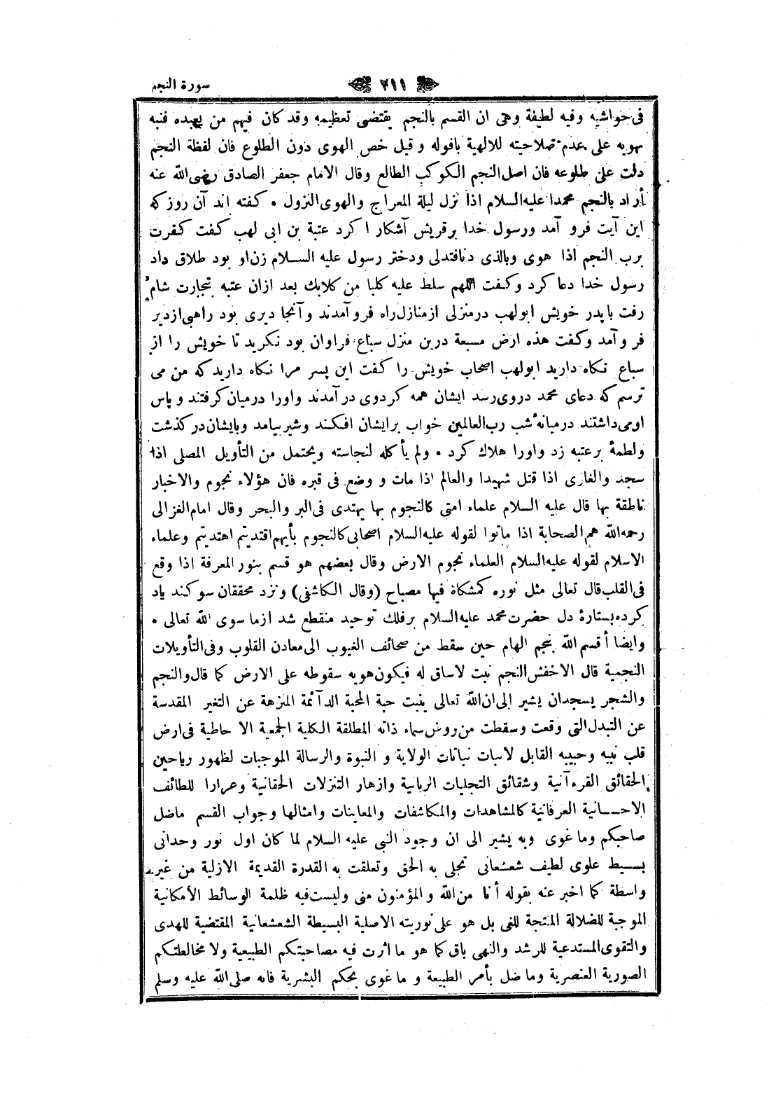 بود نكريد تا خويش را از سباع نكاه داريد ابو لهب اصحاب خويش را كفت اين پسر مرا نكاه داريد كه من مى ترسم كه دعاى محمد در وى رسد ايشان همه كرد وى در آمدند واو را در ميان كرفتند و پاس او مى داشتند در ميانه شب رب العالمين خواب بر ايشان افكند وشير بيامد وبايشان در كذشت ولطمه بر عتبه زد واو را هلاك كرد ولم يأكله لنجاسته ويحتمل من التأويل المصلى إذا سجد والغازي إذا قتل شهيدا والعالم إذا مات ووضع في قبره فان هؤلاء نجوم والاخبار ناطقة بها قال عليه السلام علماء أمتي كالنجوم بها يهتدى في البر والبحر وقال امام الغزالي رحمه الله هم الصحابة إذا ماتوا لقوله عليه السلام أصحابي كالنجوم بأيهم اقتديتم اهتديتم وعلماء الإسلام لقوله عليه السلام العلماء نجوم الأرض وقال بعضهم هو قسم بنور المعرفة إذا وقع فى القلب قال تعالى مثل نوره كمشكاة فيها مصباح (وقال الكاشفى) ونزد محققان سوكند ياد كرده بستاره دل حضرت محمد عليه السلام بر فلك توحيد منقطع شد از ما سوى الله تعالى وايضا أقسم الله بنجم الهام حين سقط من صحائف الغيوب الى معادن القلوب وفي التأويلات النجمية قال الأخفش النجم نبت لاساق له فيكون هويه سقوطه على الأرض كما قال والنجم والشجر يسجدان يشير الى ان الله تعالى ينبت حبة المحبة الدائمة المنزهة عن التغير المقدسة عن التبدل التي وقعت وسقطت من روض سماء ذاته المطلقة الكلية الجمعية الاحاطية في ارض قلب نبيه وحبيبه القابل لانبات نباتات الولاية والنبوة والرسالة الموجبات لظهور رياحين الحقائق القرآنية وشقائق التجليات الربانية وازهار التنزلات الحقانية وعرارا للطائف الاحسانية العرفانية كالمشاهدات والمكاشفات والمعاينات وأمثالها وجواب القسم ما ضل صاحبكم وما غوى وبه يشير الى ان وجود النبي عليه السلام لما كان أول نور وحداني بسيط علوى لطيف شعشعانى تجلى به الحق وتعلقت به القدرة القديمة الازلية من غير واسطة كما اخبر عنه بقوله أنا من الله والمؤمنون منى وليست فيه ظلمة الوسائط الامكانية الموجبة للضلالة المنتجة للغى بل هو على نوريته الاصلية البسيطة الشعشعانية المقتضية للهدى والتقوى المستدعية للرشد والنهى باق كما هو ما اثرت فيه مصاحبتكم الطبيعية ولا مخالطتكم الصورية العنصرية وما ضل بأمر الطبيعة وما غوى بحكم البشرية فانه صلّى الله عليه وسلّم