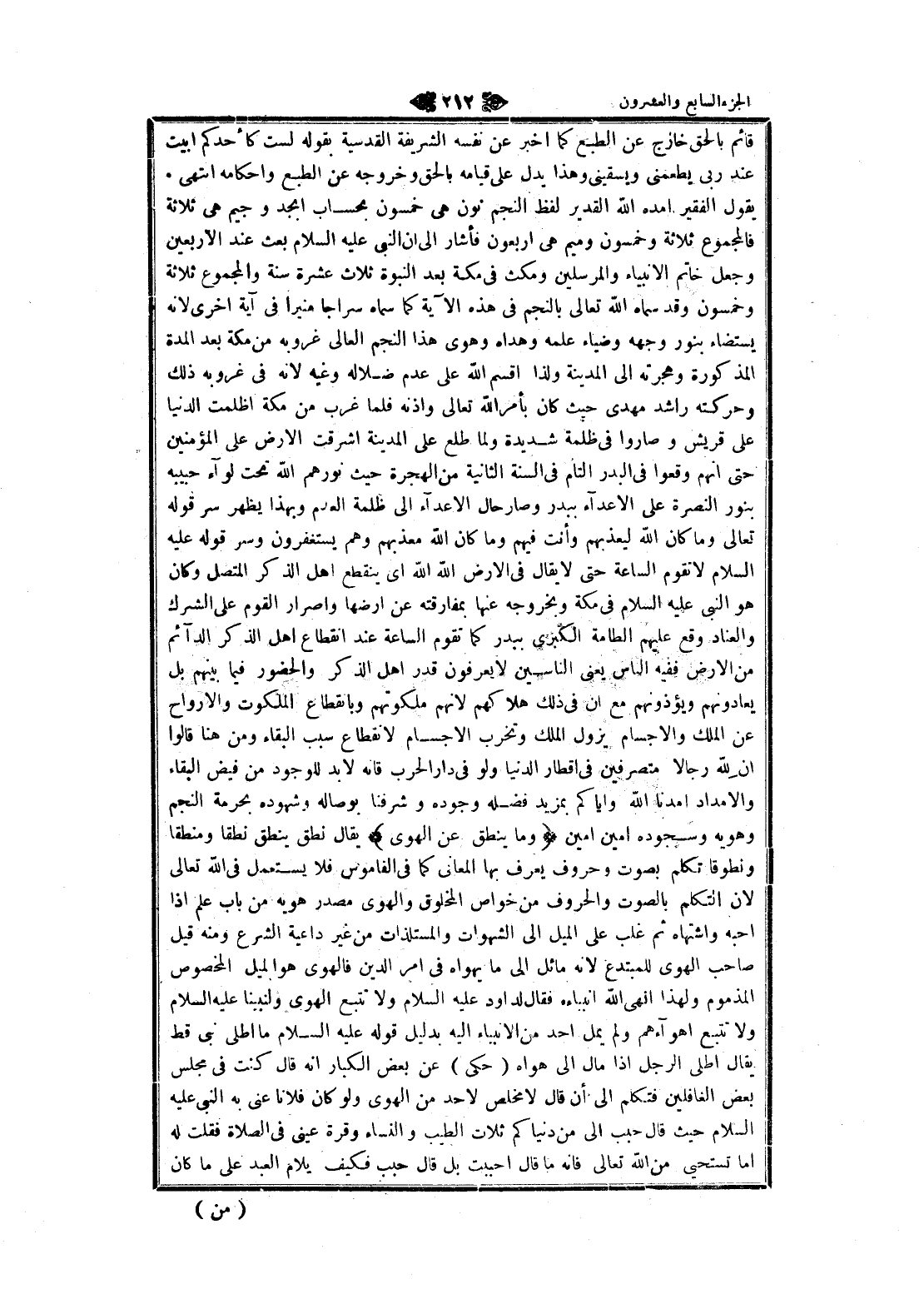 قائم بالحق خارج عن الطبع كما اخبر عن نفسه الشريفة القدسية بقوله لست كأحدكم أبيت عند ربى يطعمنى ويسقينى وهذا يدل على قيامه بالحق وخروجه عن الطبع وأحكامه انتهى يقول الفقير امده الله القدير لفظ النجم نون هى خمسون بحساب ابجد وجيم هى ثلاثة فالمجموع ثلاثة وخمسون وميم هى أربعون فأشار الى ان النبي عليه السلام بعث عند الأربعين وجعل خاتم الأنبياء والمرسلين ومكث في مكة بعد النبوة ثلاث عشرة سنة والمجموع ثلاثة وخمسون وقد سماه الله تعالى بالنجم في هذه الآية كما سماه سراجا منيرا في آية اخرى لانه يستضاء بنور وجهه وضياء علمه وهداه وهوى هذا النجم العالي غروبه من مكة بعد المدة المذكورة وهجرته الى المدينة ولذا اقسم الله على عدم ضلاله وغيه لانه في غروبه ذلك وحركته راشد مهدى حيث كان بأمر الله تعالى واذنه فلما غرب من مكة اظلمت الدنيا على قريش وصاروا في ظلمة شديدة ولما طلع على المدينة أشرقت الأرض على المؤمنين حتى انهم وقعوا في البدر التام في السنة الثانية من الهجرة حيث نورهم الله تحت لواء حبيبه بنور النصرة على الأعداء ببدر وصار حال الأعداء الى ظلمة العدم وبهذا يظهر سر قوله تعالى وما كان الله ليعذبهم وأنت فيهم وما كان الله معذبهم وهم يستغفرون وسر قوله عليه السلام لا تقوم الساعة حتى لا يقال في الأرض الله الله اى ينقطع اهل الذكر المتصل وكان هو النبي عليه السلام في مكة وبخروجه عنها بمفارقته عن ارضها واصرار القوم على الشرك والعناد وقع عليهم الطامة الكبرى ببدر كما تقوم الساعة عند انقطاع اهل الذكر الدائم من الأرض ففيه الناس يعنى الناسين لا يعرفون قدر اهل الذكر والحضور فيما بينهم بل يعادونهم ويؤذونهم مع ان في ذلك هلاكهم لانهم ملكوتهم وبانقطاع الملكوت والأرواح عن الملك والأجسام يزول الملك وتخرب الأجسام لانقطاع سبب البقاء ومن هنا قالوا ان لله رجالا متصرفين في أقطار الدنيا ولو في دار الحرب قانه لا بد للوجود من فيض البقاء والامداد أمدنا الله وإياكم بمزيد فضله وجوده وشرفنا بوصاله وشهوده بحرمة النجم وهويه وسجوده أمين أمين وَما يَنْطِقُ عَنِ الْهَوى يقال نطق ينطق نطقا ومنطقا ونطوقا تكلم بصوت وحروف يعرف بها المعاني كما في القاموس فلا يستعمل في الله تعالى لان التكلم بالصوت والحروف من خواص المخلوق والهوى مصدر هويه من باب علم إذا أحبه واشتهاه ثم غلب على الميل الى الشهوات والمستلذات من غير داعية الشرع ومنه قيل صاحب الهوى للمبتدع لانه مائل الى ما يهواه في امر الدين فالهوى هو الميل المخصوص المذموم ولهذا نهى الله أنبياءه فقال لداود عليه السلام ولا تتبع الهوى ولنبينا عليه السلام ولا تتبع أهواءهم ولم يمل أحد من الأنبياء اليه بدليل قوله عليه السلام ما اطلى نبى قط يقال اطلى الرجل إذا مال الى هواه (حكى) عن بعض الكبار انه قال كنت في مجلس بعض الغافلين فتكلم الى أن قال لا مخلص لاحد من الهوى ولو كان فلانا عنى به النبي عليه السلام حيث قال حبب الى من دنياكم ثلاث الطيب والنساء وقرة عينى في الصلاة فقلت له اما تستحيى من الله تعالى فانه ما قال أحببت بل قال حبب فكيف يلام العبد على ما كان