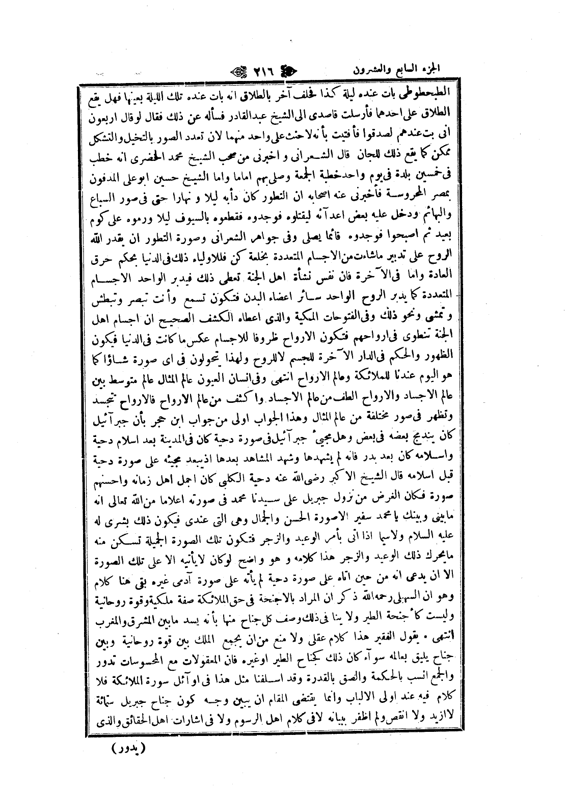 الطبحطوطى بات عنده ليلة كذا فحلف آخر بالطلاق انه بات عنده تلك الليلة بعينها فهل يقع الطلاق على أحدهما فأرسلت قاصدى الى الشيخ عبد القادر فسأله عن ذلك فقال لو قال أربعون انى بت عندهم لصدقوا فأفتيت بأنه لا حنث على واحد منهما لان تعدد الصور بالتخيل والتشكل ممكن كما يقع ذلك للجان قال الشعراني وأخبرني من صحب الشيخ محمد الخضرى انه خطب فى خمسين بلدة في يوم واحد خطبة الجمعة وصلّى بهم اماما واما الشيخ حسين ابو على المدفون بمصر المحروسة فأخبرنى عنه أصحابه ان التطور كان دأبه ليلا ونهارا حتى في صور السباع والبهائم ودخل عليه بعض أعدائه ليقتلوه فوجدوه فقطعوه بالسيوف ليلا ورموه على كوم بعيد ثم أصبحوا فوجدوه قائما يصلى وفي جواهر الشعراني وصورة التطور ان يقدر الله الروح على تدبير ما شاءت من الأجسام المتعددة بخلعة كن فللاولياء ذلك في الدنيا بحكم حرق العادة واما في الآخرة فان نفس نشأة اهل الجنة تعطى ذلك فيدبر الواحد الأجسام المتعددة كما يدبر الروح الواحد سائر أعضاء البدن فتكون تسمع وأنت تبصر وتبطش وتمشى ونحو ذلك وفي الفتوحات المكية والذي أعطاه الكشف الصحيح ان أجسام اهل الجنة تنطوى في أرواحهم فتكون الأرواح ظروفا للاجسام عكس ما كانت في الدنيا فيكون الظهور والحكم في الدار الآخرة للجسم لا للروح ولهذا يتحولون في اى صورة شاؤا كما هو اليوم عندنا للملائكة وعالم الأرواح انتهى وفي انسان العيون عالم المثال عالم متوسط بين عالم الأجساد والأرواح الطف من عالم الأجساد وأكثف من عالم الأرواح فالارواح تتجسد وتظهر في صور مختلفة من عالم المثال وهذا الجواب اولى من جواب ابن حجر بأن جبرائيل كان يندمج بعضه في