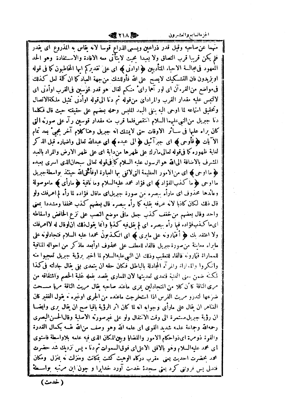 اى من الأمور العظيمة التي لا تفى بها العبارة او فأوحى الله حينئذ بواسطة جبريل ما اوحى ما كَذَبَ الْفُؤادُ اى فؤاد محمد عليه السلام وما نافية ما رَأى ما موصولة وعائدها محذوف اى ما رأه ببصره من صورة جبريل اى ما قال فؤاده لما رأه لم أعرفك ولو قال ذلك لكان كاذبا لانه عرفه بقلبه كما رأه ببصره قال بعضهم كذب مخففا ومشددا بمعنى واحد وقال بعضهم من خفف كذب جعل ما في موضع النصب على نزع الخافض وإسقاطه اى ما كذب فؤاده فيما رأه ببصره اى لم يقل فيه كذبا وانما يقول ذلك ان لو قال له لا أعرفك ولا اعتقد بك أَفَتُمارُونَهُ عَلى ما يَرى اى أتكذبون محمدا عليه السلام فتجادلونه على ما يراه معاينة من صورة جبريل فالفاء للعطف على محذوف او أبعد ما ذكر من أحواله المنافية للمماراة فتمارونه فالفاء للتعقيب وذلك ان النبي عليه السلام لما اخبر برؤية جبريل تعجبوا منه وأنكروا والمماراة والمراء المجادلة بالباطل فكان حقه ان يتعدى بفي يقال جادلته في كذا لكنه ضمن معنى الغلبة فتعدى تعديتها لان الممارى يقصد بفعله غلبة الخصم واشتقاقه من مرى الناقة كأن كلا من المتجادلين يمرى ما عند صاحبه يقال مريت الناقة مريا مسحت ضرعها لتدر ومريت الفرس إذا استخرجت ما عنده من الجري او غيره يقول الفقير كان الظاهر ان يقال على ما رأى وجوابه انه لما كان اثر الرؤية باقيا صح ان يقال يرى وايضا ان رؤية جبريل مستمرة الى وقت الانتقال ولو على غير صورته الاصلية وقال الحسن البصري رحمه الله وجماعة علمه شديد القوى اى علمه الله وهو وصف من الله نفسه بكمال القدرة والقوة ذو مرة اى ذو احكام الأمور والقضايا وبين المكان الذي فيه علمه بلا واسطة فاستوى اى محمد عليه السلام وهو بالأفق الأعلى اى فوق السموات ثم دنا پس نزديك شد حضرت محمد بحضرت احديت يعنى مقرب دركاه الوهيت كشت بمكانت ومنزلت نه بمنزل ومكان فتدلى پس فروتنى كرد يعنى سجده خدمت آورد خدايرا و چون اين مرتبه بواسطه