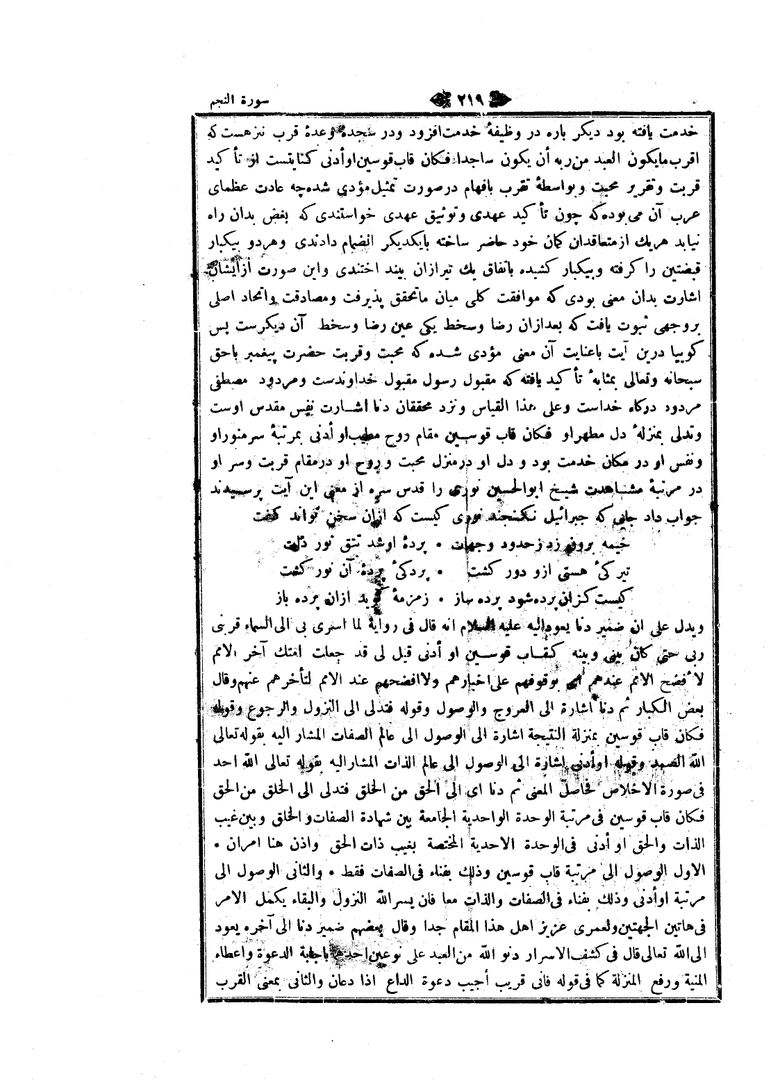 كه مقبول رسول مقبول خداوندست ومردود مصطفى مردود درگاه خداست وعلى هذا القياس ونزد محققان دنا اشارت نفس مقدس اوست وتدلى بمنزله دل مطهر او فكان قاب قوسين مقام روح مطيب او أدنى بمرتبه سر منور او ونفس او در مكان خدمت بود ودل او در منزل محبت وروح او در مقام قربت وسر او در مرتبه مشاهدت شيخ ابو الحسين نورى را قدس سره از معنى اين آيت پرسيدند جواب داد جايى كه جبرائيل نكنجند نورى كيست كه از ان سخن تواند كفت