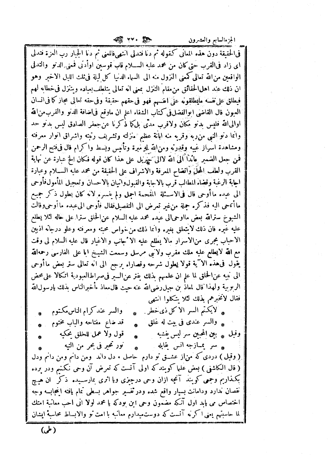 (وقيل) دردى كه من از عشق تو دارم حاصل دل داند ومن دانم ومن دانم ودل (قال الكاشفى) بعض علما كويند كه اولى آنست كه تعرض آن وحي نكنيم ودر پرده بگذاريم وجمعى كويند آنچهـ از ان وحي در چيزى ويا اثرى بما رسيده ذكر ان هيچ نقصان ندارد ودامانت بسيار واقع شده ودر تفسير جواهر بسطى تمام يافته اينجا بسه وجه اختصاص مى يابد أول آنكه مضمون وحي اين بود كه يا محمد لولا انى أحب معاتبة أمتك لما حاسبتهم يعنى اگر نه آنست كه دوست ميدارم معاتبه با امت تو والا بساط محاسبه ايشان