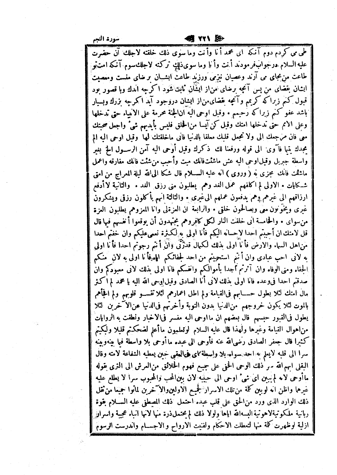 طى مى كردم دوم آنكه اى محمد أنا وأنت وما سوى ذلك خلقته لاجلك آن حضرت عليه السلام در جواب فرمودند أنت وأنا وما سوى ذلك تركته لاجلك سوم آنكه امت تو طاعت من بجاى مى آرند وعصيان نيز مى ورزند طاعت ايشان برضاى منست ومعصيت ايشان بقضاي من پس آنچهـ برضاى من از ايشان ثابت شود اگر چهـ اندك وبا قصور بود قبول كنم زيرا كه كريمم وآنچهـ بقضاي من از ايشان در وجود آيد اگر چهـ بزرك وبسيار باشد عفو كنم زيرا كه رحيمم وقيل اوحى اليه ان الجنة محرمة على الأنبياء حتى تدخلها وعلى الأمم حتى تدخلها أمتك وقيل كن آيسا من الخلق فليس بأيديهم شيء واجعل صحبتك معى فان مرجعك الى ولا تجعل قلبك معلقا بالدنيا فانى ما خلقتك لها وقيل اوحى اليه الم يجدك يتيما فآوى الى قوله ورفعنا لك ذكرك وقيل أوحى اليه آمن الرسول إلخ بغير واسطة جبريل وقيل اوحى اليه عش ما شئت فانك ميت وأحبب من شئت فانك مفارقه واعمل ما شئت فانك مجزى به (وروى) انه عليه السلام قال شكا الى الله ليلة المعراج من أمتي شكايات الاولى لم أكلفهم عمل الغد وهم يطلبون منى رزق الغد والثانية لا أدفع أرزاقهم الى غيرهم وهم يدفعون عملهم الى غيرى والثالثة انهم يأكلون رزقى ويشكرون غيرى ويخونون معى ويصالحون خلقى والرابعة ان العزة لى وانا المعز وهم يطلبون العزة من سواى والخامسة انى خلقت النار لكل كافر وهم يجتهدون أن يوقعوا أنفسهم فيها قال قل لامتك ان أحببتم أحدا لاحسانه إليكم فأنا اولى به لكثرة نعمى عليكم وان خفتم أحدا من اهل السماء والأرض فأنا اولى بذلك لكمال قدرتى وان أنتم رجوتم أحدا فأنا اولى به لانى أحب عبادى وان أنتم استحبيتم من أحد لجفائكم إياه فأنا اولى به لان منكم الجفاء ومنى الوفاة وان آثرتم أحدا بأموالكم وأنفسكم فانا اولى بذلك لانى معبودكم وان صدقتم أحدا في وعده فانا اولى بذلك لانى أنا الصادق وقيل اوحى الله اليه يا محمد لم اكثر مال أمتك لئلا يطول حسابهم في القيامة ولم اطل أعمارهم لئلا تقسو قلوبهم ولم افجأهم بالموت لئلا يكون خروجهم من الدنيا بدون التوبة وأخرتهم في الدنيا عن الآخرين لئلا يطول في القبور حبسهم قال بعضهم ان ما اوحى اليه مفسر في الاخبار ونطقت به الروايات من اهوال القيامة وغيرها ولهذا قال عليه السلام لو تعلمون ما أعلم لضحكتم قليلا ولبكيتم كثيرا قال جعفر الصادق رضى الله عنه فأوحى الى عبده ما أوحى بلا واسطة فيما بينه وبينه سرا الى قلبه لا يعلم به أحد سواه بلا واسطة اى في العقبى حين يعطيه الشفاعة لامته وقال البقلى أبهم الله سر ذلك الوحى الخفي على جميع فهوم الخلائق من العرش الى الثرى بقوله ما أوحى لانه لم يبين اى شيء اوحى الى حبيبه لان بين المحب والمحبوب سرا لا يطلع عليه غيرهما وأظن انه لو بين كلمة من تلك الاسرار لجميع الأولين والآخرين لماتوا جميعا من ثقل ذلك الوارد الذي ورد من الحق على قلب عبده احتمل ذلك المصطفى عليه السلام بقوة ربانية ملكوتية لاهوتية البسه الله إياها ولولا ذلك لم يحتمل ذرة منها لانها انباء عجيبة واسرار ازلية لو ظهرت كلمة منها لتعطلت الاحكام ولفنيت الأرواح والأجسام واندرست الرسوم