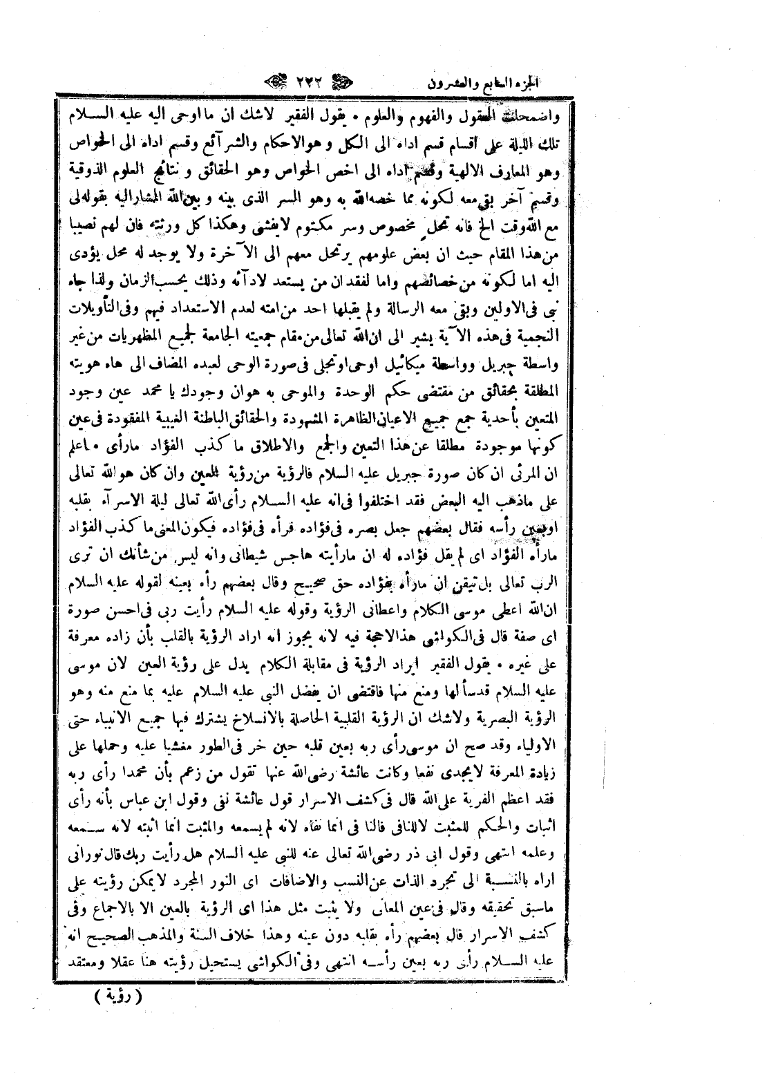 والشرائع وقسم اداه الى الخواص وهو المعارف الالهية وقسم اداه الى أخص الخواص وهو الحقائق ونتائج العلوم الذوقية وقسم آخر بقي معه لكونه مما خصه الله به وهو السر الذي بينه وبين الله المشار اليه بقوله لى مع الله وقت إلخ فانه تحل مخصوص وسر مكتوم لا يفشى وهكذا كل ورثته فان لهم نصيبا من هذا المقام حيث ان بعض علومهم يرتحل معهم الى الآخرة ولا يوجد له محل يؤدى اليه اما لكونه من خصائصهم واما لفقدان من يستعد لادائه وذلك يحسب الزمان ولذا جاء نبى في الأولين وبقي معه الرسالة ولم يقبلها أحد من أمته لعدم الاستعداد فيهم وفي التأويلات النجمية في هذه الآية يشير الى ان الله تعالى من مقام جمعيته الجامعة لجميع المظهريات من غير واسطة جبريل وواسطة ميكائيل اوحى او تجلى في صورة الوحى لعبده المضاف الى هاء هويته المطلقة بحقائق من مقتضى حكم الوحدة والموحى به هوان وجودك يا محمد عين وجود المتعين بأحدية جمع جميع الأعيان الظاهرة المشهودة والحقائق الباطنة الغيبية المفقودة في عين كونها موجودة مطلقا عن هذا التعين والجمع والإطلاق ما كذب الفؤاد ما رأى اعلم ان المرئي ان كان صورة جبريل عليه السلام فالرؤية من رؤية العين وان كان هو الله تعالى على ما ذهب اليه البعض فقد اختلفوا في انه عليه السلام رأى الله تعالى ليلة الإسراء بقلبه او بعين رأسه فقال بعضهم جعل بصره في فؤاده فرأه في فؤاده فيكون المعنى ما كذب الفؤاد ما رأه الفؤاد اى لم يقل فؤاده له ان ما رأيته هاجس شيطانى وانه ليس من شأنك ان ترى الرب تعالى بل تيقن ان ما رأه بفؤاده حق صحيح وقال بعضهم رأه بعينه لقوله عليه السلام ان الله اعطى موسى الكلام وأعطاني الرؤية وقوله عليه السلام رأيت ربى في احسن صورة اى صفة قال في الكواشي هذا لا حجة فيه لانه يجوز انه أراد الرؤية بالقلب بأن زاده معرفة على غيره يقول الفقير إيراد الرؤية في مقابلة الكلام يدل على رؤية العين لان موسى عليه السلام قد سألها ومنع منها فاقتضى ان يفضل النبي عليه السلام عليه بما منع منه وهو الرؤية البصرية ولا شك ان الرؤية القلبية الحاصلة بالانسلاخ يشترك فيها جميع الأنبياء حتى الأولياء وقد صح ان موسى رأى ربه بعين قلبه حين خر في الطور مغشيا عليه وحملها على زيادة المعرفة لا يجدى نفعا وكانت عائشة رضى الله عنها تقول من زعم بأن محمدا رأى ربه فقد أعظم الفرية على الله قال في كشف الاسرار قول عائشة نفى وقول ابن عباس بأنه رأى اثبات والحكم للمثبت لا للنافى فالنا في انما نفاه لانه لم يسمعه والمثبت انما أثبته لانه سمعه وعلمه انتهى وقول ابى ذر رضى الله تعالى عنه للنبى عليه السلام هل رأيت ربك قال نورانى أراه بالنسبة الى تجرد الذات عن النسب والإضافات اى النور المجرد لا يمكن رؤيته على ما سبق تحقيقه وقال في عين المعاني ولا يثبت مثل هذا اى الرؤية بالعين الا بالإجماع وفي كشف الاسرار قال بعضهم رأه بقلبه دون عينه وهذا خلاف السنة والمذهب الصحيح انه عليه السلام رأى ربه بعين رأسه انتهى وفي الكواشي يستحيل رؤيته هنا عقلا ومعتقد