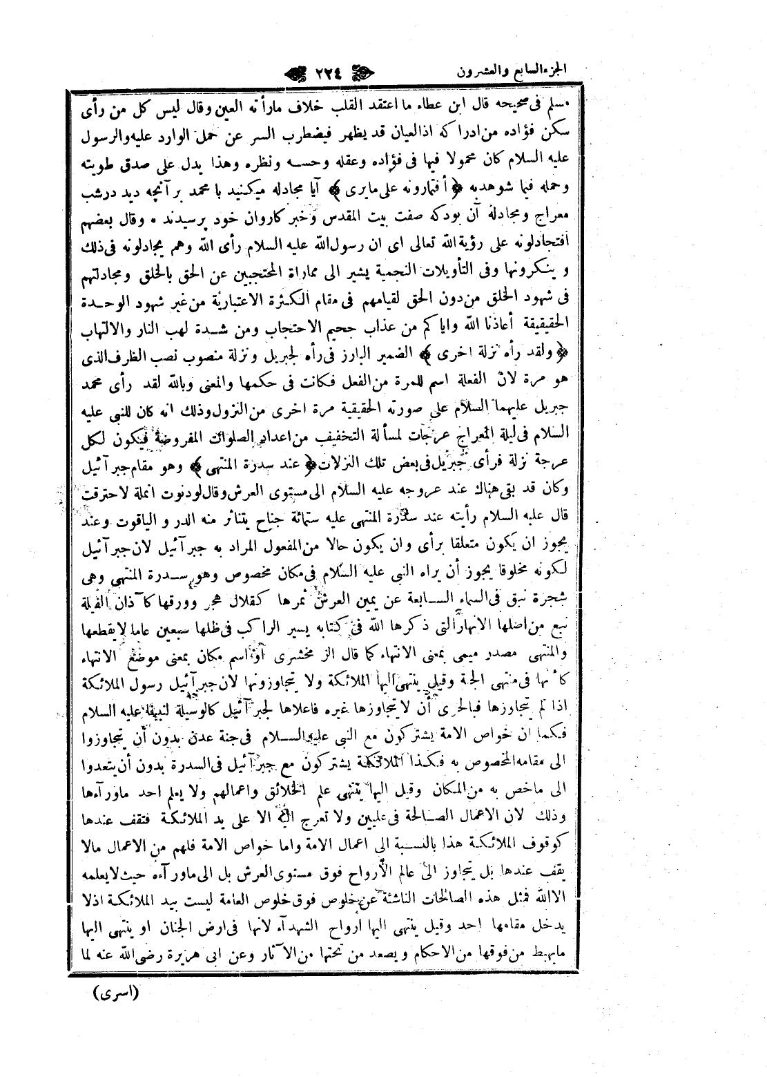 مسلم في صحيحه قال ابن عطاء ما اعتقد القلب خلاف ما رأته العين وقال ليس كل من رأى سكن فؤاده من إدراكه إذا العيان قد يظهر فيضطرب السر عن حمل الوارد عليه والرسول عليه السلام كان محمولا فيها في فؤاده وعقله وحسه ونظره وهذا يدل على صدق طويته وحمله فيما شوهد به أَفَتُمارُونَهُ عَلى ما يَرى آيا مجادله ميكنيد با محمد بر آنچهـ ديد در شب معراج ومجادله آن بود كه صفت بيت المقدس وخبر كاروان خود پرسيدند وقال بعضهم أفتجادلونه على رؤية الله تعالى اى ان رسول الله عليه السلام رأى الله وهم يجادلونه في ذلك وينكرونها وفي التأويلات النجمية يشير الى مماراة المحتجبين عن الحق بالخلق ومجادلتهم فى شهود الخلق من دون الحق لقيامهم في مقام الكثرة الاعتبارية من غير شهود الوحدة الحقيقية أعاذنا الله وإياكم من عذاب جحيم الاحتجاب ومن شدة لهب النار والالتهاب وَلَقَدْ رَآهُ نَزْلَةً أُخْرى الضمير البارز في رأه لجبريل ونزلة منصوب نصب الظرف الذي هو مرة لان الفعلة اسم للمرة من الفعل فكانت في حكمها والمعنى وبالله لقد رأى محمد جبريل عليهما السلام على صورته الحقيقية مرة اخرى من النزول وذلك انه كان للنبى عليه السلام في ليلة المعراج عرجات لمسألة التخفيف من اعداد الصلوات المفروضة فيكون لكل عرجة نزلة فرأى جبريل في بعض تلك النزلات عِنْدَ سِدْرَةِ الْمُنْتَهى وهو مقام جبرائيل وكان قد بقي هناك عند عروجه عليه السلام الى مستوى العرش وقال لو دنوت انملة لاحترقت قال عليه السلام رأيته عند سدرة المنتهى عليه ستمائة جناح يتناثر منه الدر والياقوت وعند يجوز ان يكون متعلقا برأى وان يكون حالا من المفعول المراد به جبرائيل لان جبرائيل لكونه مخلوقا يجوز أن يراه النبي عليه السلام في مكان مخصوص وهو سدرة المنتهى وهى شجرة نبق في السماء السابعة عن يمين العرش ثمرها كقلال هجر وورقها كآذان الفيلة نبع من أصلها الأنهار التي ذكرها الله في كتابه يسير الراكب في ظلها سبعين عاما لا يقطعها والمنتهى مصدر ميمى بمعنى الانتهاء كما قال الزمخشري او اسم مكان بمعنى موضع الانتهاء كأنها في منتهى الجنة وقيل ينتهى إليها الملائكة ولا يتجاوزونها لان جبرائيل رسول الملائكة إذا لم يتجاوزها فبالحرى أن لا يتجاوزها غيره فاعلاها لجبرآئيل كالوسيلة لنبينا عليه السلام فكما ان خواص الامة يشتركون مع النبي عليه السلام في جنة عدن بدون أن يتجاوزوا الى مقامه المخصوص به فكذا الملائكة يشتركون مع جبرائيل في السدرة بدون أن يتعدوا الى ما خص به من المكان وقيل إليها ينتهى علم الخلائق وأعمالهم ولا يعلم أحد ما وراءها وذلك لان الأعمال الصالحة في عليين ولا تعرج اليه الا على يد الملائكة فتقف عندها كوقوف الملائكة هذا بالنسبة الى اعمال الامة واما خواص الامة فلهم من الأعمال مالا يقف عندها بل يتجاوز الى عالم الأرواح فوق مستوى العرش بل الى ما وراءه حيث لا يعلمه الا الله فمثل هذه الصالحات الناشئة عن خلوص فوق خلوص العامة ليست بيد الملائكة إذ لا يدخل مقامها أحد وقيل ينتهى إليها أرواح الشهداء لانها في ارض الجنان او ينتهى إليها ما يهبط من فوقها من الاحكام ويصعد من تحتها من الآثار وعن ابى هريرة رضى الله عنه لما