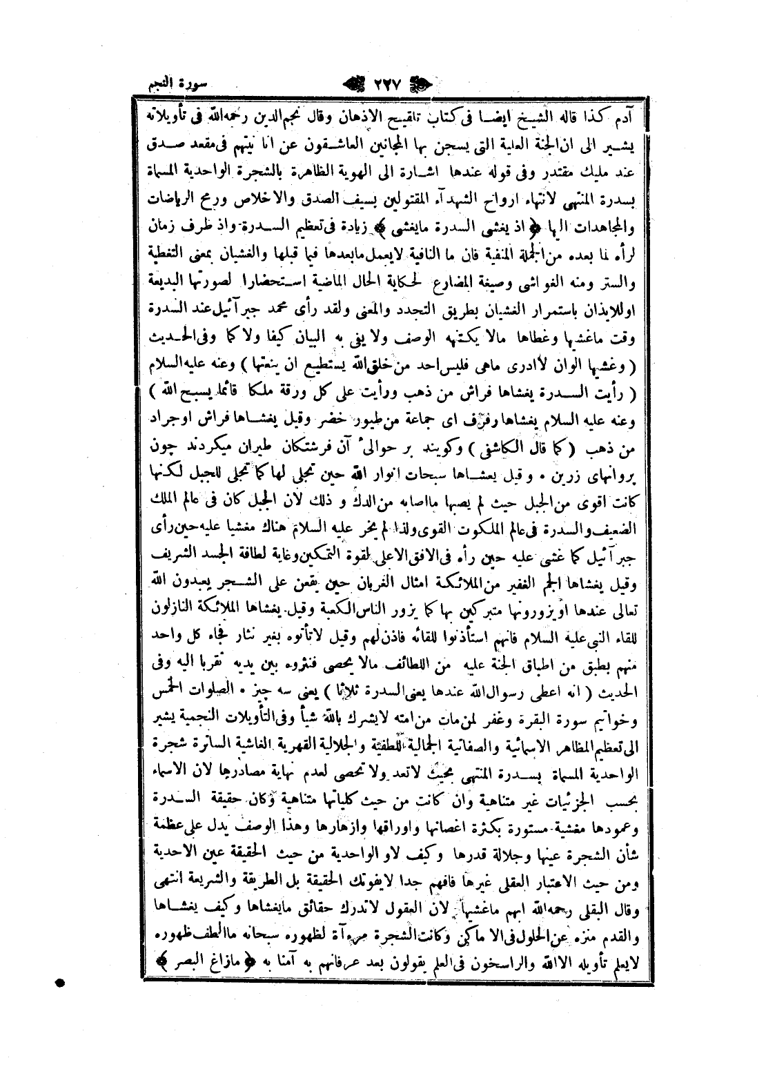آدم كذا قاله الشيخ ايضا في كتاب تلقيح الأذهان وقال نجم الدين رحمه الله في تأويلاته يشير الى ان الجنة العلية التي يسجن بها المجانين العاشقون عن انا نيتهم في مقعد صدق عند مليك مقتدر وفي قوله عندها اشارة الى الهوية الظاهرة بالشجرة الواحدية المسماة بسدرة المنتهى لانتهاء أرواح الشهداء المقتولين بسيف الصدق والإخلاص ورمح الرياضات والمجاهدات إليها إِذْ يَغْشَى السِّدْرَةَ ما يَغْشى زيادة في تعظيم السدرة وإذ طرف زمان لرأه لما بعده من الجملة المنفية فان ما النافية لا يعمل ما بعدها فيما قبلها والغشيان بمعنى التغطية والستر ومنه الغواشي وصيغة المضارع لحكاية الحال الماضية استحضارا لصورتها البديعة او للايذان باستمرار الغشيان بطريق التجدد والمعنى ولقد رأى محمد جبرائيل عند السدرة وقت ما غشيها وغطاها مالا يكتنهه الوصف ولا يفى به البيان كيفا ولا كما وفي الحديث (وغشيها ألوان لا أدرى ما هى فليس أحد من خلق الله يستطيع ان ينعتها) وعنه عليه السلام (رأيت السدرة يغشاها فراش من ذهب ورأيت على كل ورقة ملكا قائما يسبح الله) وعنه عليه السلام يغشاها رفرف اى جماعة من طيور خضر وقيل يغشاها فراش او جراد من ذهب (كما قال الكاشفى) وكويند بر حوالئ آن فرشتكان طيران ميكردند چون پروانه هاى زرين وقيل يعشاها سبحات أنوار الله حين تجلى لها كما تجلى للجبل لكنها كانت أقوى من الجبل حيث لم يصبها ما أصابه من الدك وذلك لان الجبل كان في عالم الملك الضعيف والسدرة في عالم الملكوت القوى ولذا لم يخر عليه السلام هناك مغشيا عليه حين رأى جبرائيل كما غشى عليه حين رأه في الأفق الأعلى لقوة التمكين وغاية لطافة الجسد الشريف وقيل يغشاها الجم الغفير من الملائكة أمثال الغربان حين يقعن على الشجر يعبدون الله تعالى عندها او يزورونها متبركين بها كما يزور الناس الكعبة وقيل يغشاها الملائكة النازلون للقاء النبي عليه السلام فانهم استأذنوا للقائه فاذن لهم وقيل لا تأتوه بغير نثار فجاء كل واحد منهم بطبق من أطباق الجنة عليه من اللطائف مالا يحصى فنثروه بين يديه تقربا اليه وفي الحديث (انه اعطى رسول الله عندها يعنى السدرة ثلاثا) يعنى سه چيز الصلوات الخمس وخواتيم سورة البقرة وغفر لمن مات من أمته لا يشرك بالله شيأ وفي التأويلات النجمية يشير الى تعظيم المظاهر الاسمائية والصفاتية الجمالية اللطفية والجلالية القهرية الغاشية الساترة شجرة الواحدية المسماة بسدرة المنتهى بحيث لا تعد ولا تحصى لعدم نهاية مصادرها لان الأسماء بحسب الجزئيات غير متناهية وان كانت من حيث كلياتها متناهية وكان حقيقة السدرة وعمودها مغشية مستورة بكثرة أغصانها وأوراقها وازهارها وهذا الوصف يدل على عظمة شأن الشجرة عينها وجلالة قدرها وكيف لا والواحدية من حيث الحقيقة عين الاحدية ومن حيث الاعتبار العقلي غيرها فافهم جدا لا يفوتك الحقيقة بل الطريقة والشريعة انتهى وقال البقلى رحمه الله أبهم ما غشيها لان العقول لا تدرك حقائق ما يغشاها وكيف يغشاها والقدم منزه عن الحلول في الأماكن وكانت الشجرة مرءاة لظهوره سبحانه ما الطف ظهوره لا يعلم تأويله الا الله والراسخون في العلم يقولون بعد عرفانهم به آمنا به ما زاغَ الْبَصَرُ