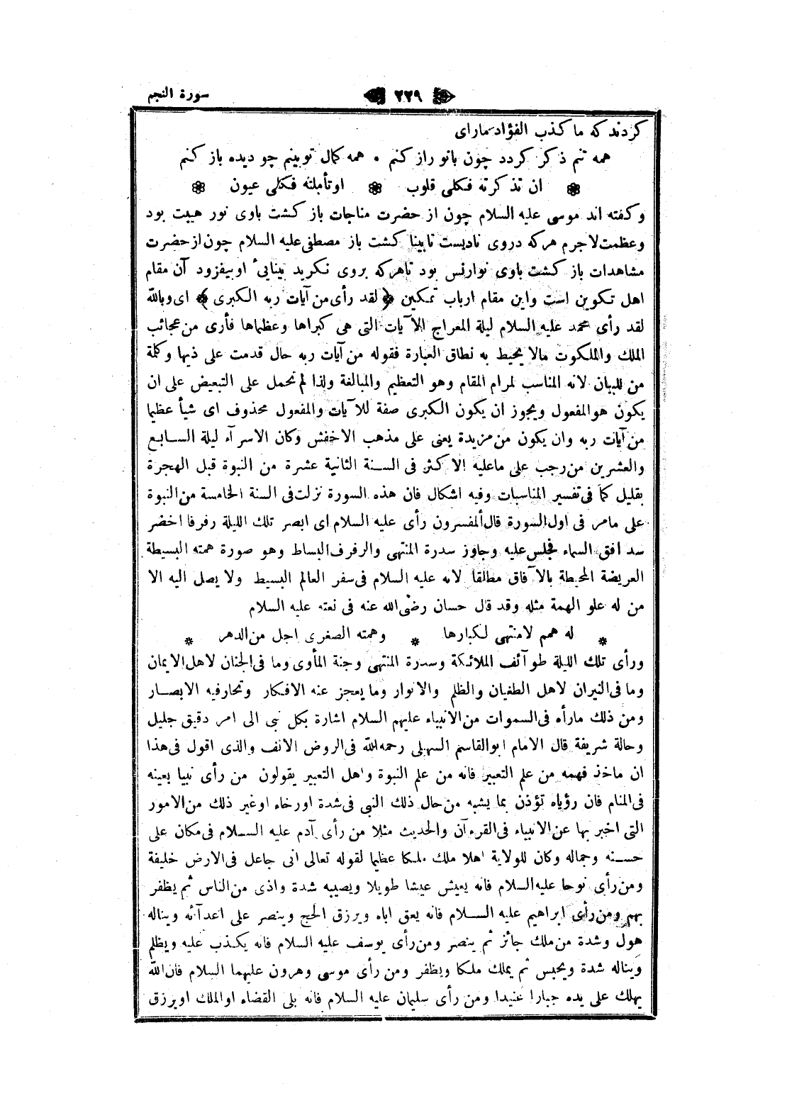 ورأى تلك الليلة طوائف الملائكة وسدرة المنتهى وجنة المأوى وما في الجنان لاهل الايمان وما في النيران لاهل الطغيان والظلم والأنوار وما يعجز عنه الافكار وتحار فيه الابصار ومن ذلك ما رأه في السموات من الأنبياء عليهم السلام اشارة بكل نبى الى امر دقيق جليل وحالة شريفة قال الامام ابو القاسم السهيلي رحمه الله في الروض الانف والذي أقول في هذا ان ماخذ فهمه من علم التعبير فانه من علم النبوة واهل التعبير يقولون من رأى نبيا بعينه فى المنام فان رؤياه تؤذن بما يشبه من حال ذلك النبي في شدة او رخاء او غير ذلك من الأمور التي اخبر بها عن الأنبياء في القرآن والحديث مثلا من رأى آدم عليه السلام في مكان على حسنه وجماله وكان للولاية أهلا ملك ملكا عظيما لقوله تعالى انى جاعل في الأرض خليفة ومن رأى نوحا عليه السلام فانه يعيش عيشا طويلا ويصيبه شدة وأذى من الناس ثم يظفر بهم ومن رأى ابراهيم عليه السلام فانه يعق أباه ويرزق الحج وينصر على أعدائه ويناله هول وشدة من ملك جائز ثم ينصر ومن رأى يوسف عليه السلام فانه يكذب عليه ويظلم ويناله شدة ويحبس ثم يملك ملكا ويظفر ومن رأى موسى وهرون عليهما السلام فان الله يهلك على يده جبارا عنيدا ومن رأى سليمان عليه السلام فانه بلى القضاء او الملك او يرزق