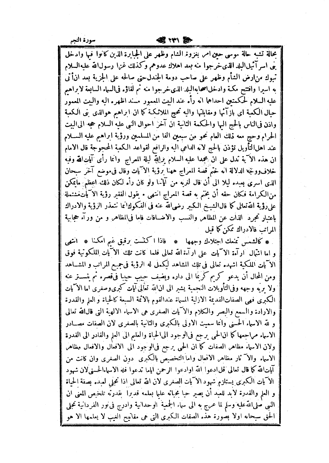 واما اشتمال إراءة الآيات على إراءة الله تعالى فلما كانت تلك الآيات الملكوتية فوق الآيات الملكية أشهده تعالى في تلك المشاهد ليكمل له الرؤية في جميع المراتب والمشاهد ومن المحال أن يدعو كريم كريما الى داره ويضيف حبيب حبيبا في قصره ثم يتستر عنه ولا يريه وجهه وفي التأويلات النجمية يشير الى ان الله تعالى آيات كبرى وصغرى اما الآيات الكبرى فهى الصفات القديمة الازلية المسماة عند القوم بالائمة السبعة كالحياة والعلم والقدرة والارادة والسمع والبصر والكلام والآيات الصغرى هى الأسماء الالهية التي قال الله تعالى ولله الأسماء الحسنى وانما سميت الاولى بالكبرى والثانية بالصغرى لان الصفات مصادر الأسماء