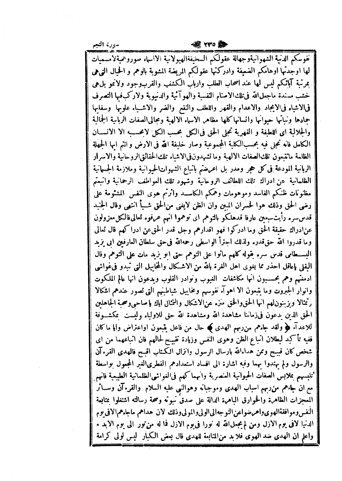 نفوسكم الدنية الشهوانية وجهالة عقولكم السخيفة الهيولانية الا اسماء صور وهمية لا مسميات لها اوجدتها أوهامكم الضعيفة وأدركتها عقولكم المريضة المشوبة بالوهم والخيال التي هى بمرتبة آبائكم ليس لها عند اصحاب الطلب وارباب الكشف والقرب وجود ولا نمو بل هى خشب مسندة ما جعل الله في تلك الأصنام النفسية والهوائية والدنيوية ولا ركب فيها التصرف فى الأشياء في الإيجاد والاعدام والقهر واللطف والنفع والضر والأشياء علويها وسفليها جمادها ونباتها حيوانها وإنسانها كلها مظاهر الأسماء الالهية ومجالى الصفات الربانية الجمالية والجلالية اى اللطيفة والقهرية تجلى الحق في الكل بحسب الكل لا بحسبه الا الإنسان الكامل فانه تجلى فيه بحسب الكلية المجموعية وصار خليفة الله في الأرض وأنتم ايها الجهلة الظلمة ما تتبعون تلك الصفات الالهية وما تشهدون في الأشياء تلك الحقائق الروحانية والاسرار الربانية المودعة في كل حجر ومدر بل أعرضتم باتباع الشهوات الحيوانية وملازمة الجسمانية الظلمانية عن ادراك تلك اللطائف الروحانية وشهود تلك العواطف الرحمانية واتبعتم مظنونات ظنكم الفاسد وموهومات وهمكم الكاسد واثرتم هوى النفس المشئومة على رضى الحق وذلك هو الخسران المبين وان الظن لا يغنى من الحق شيأ انتهى وقال الجنيد